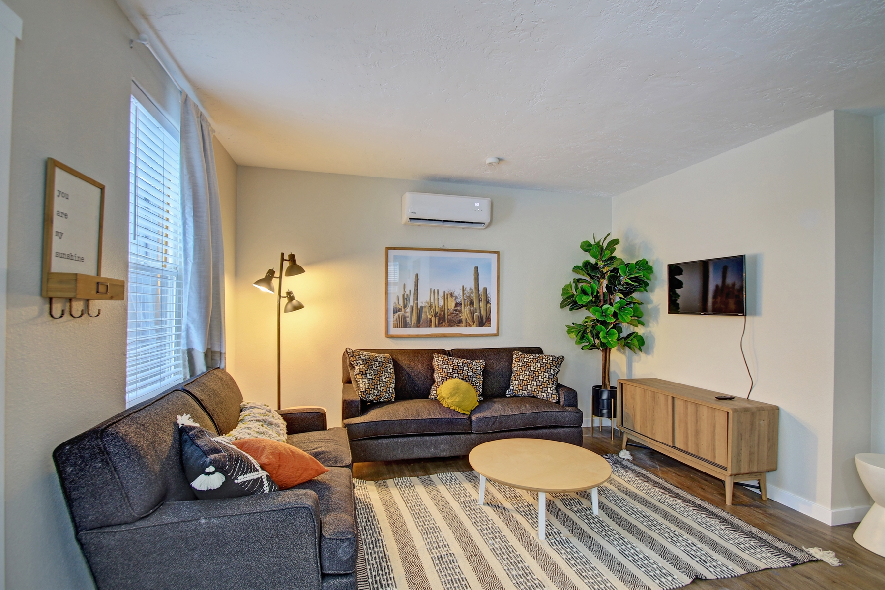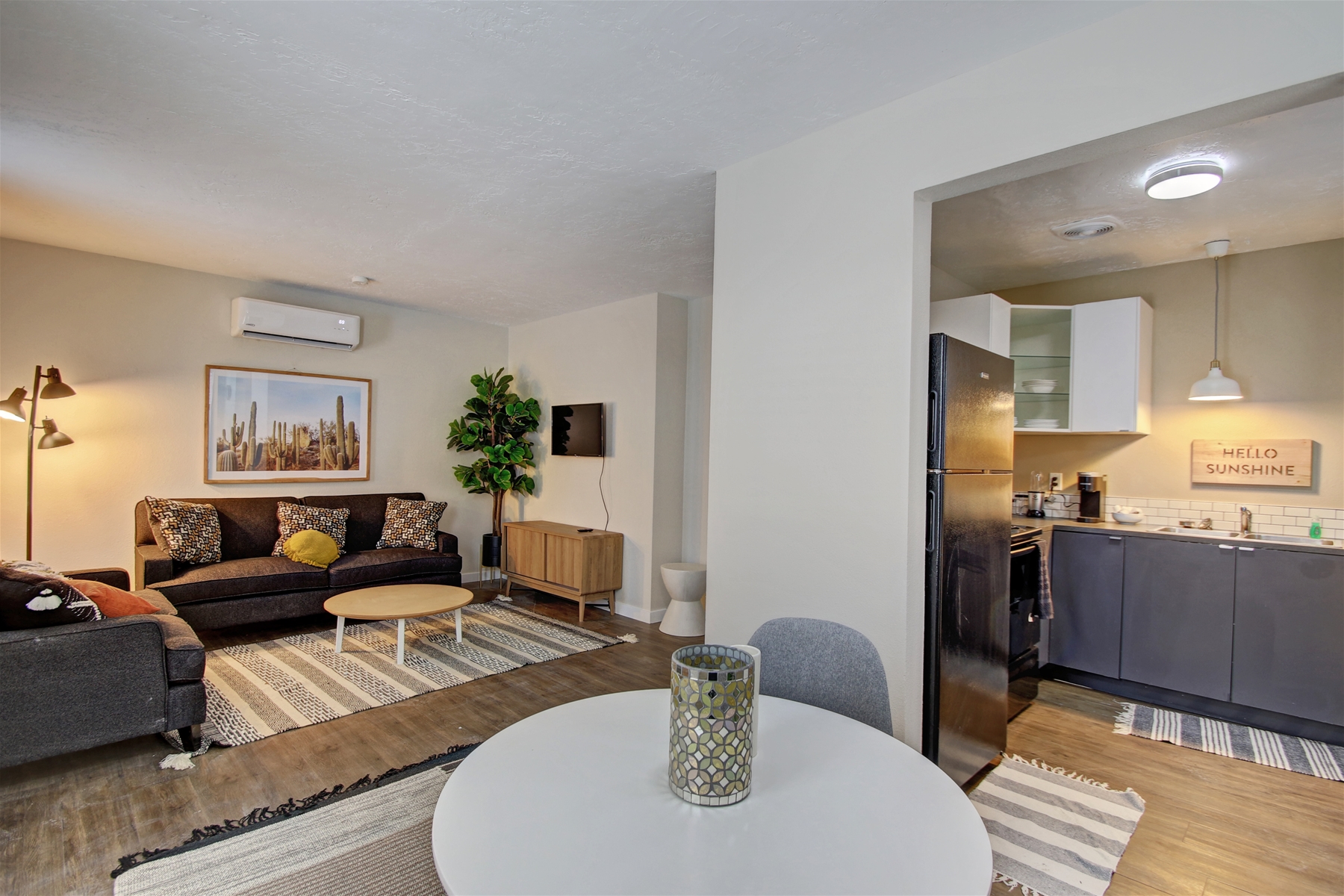 For those who love culinary pursuits, our fully equipped kitchen awaits, providing all the essentials for crafting delicious meals at home. Step outside to your private outdoor seating area off the kitchen or gather around the communal fire pit shared among five one-bedroom apartments.