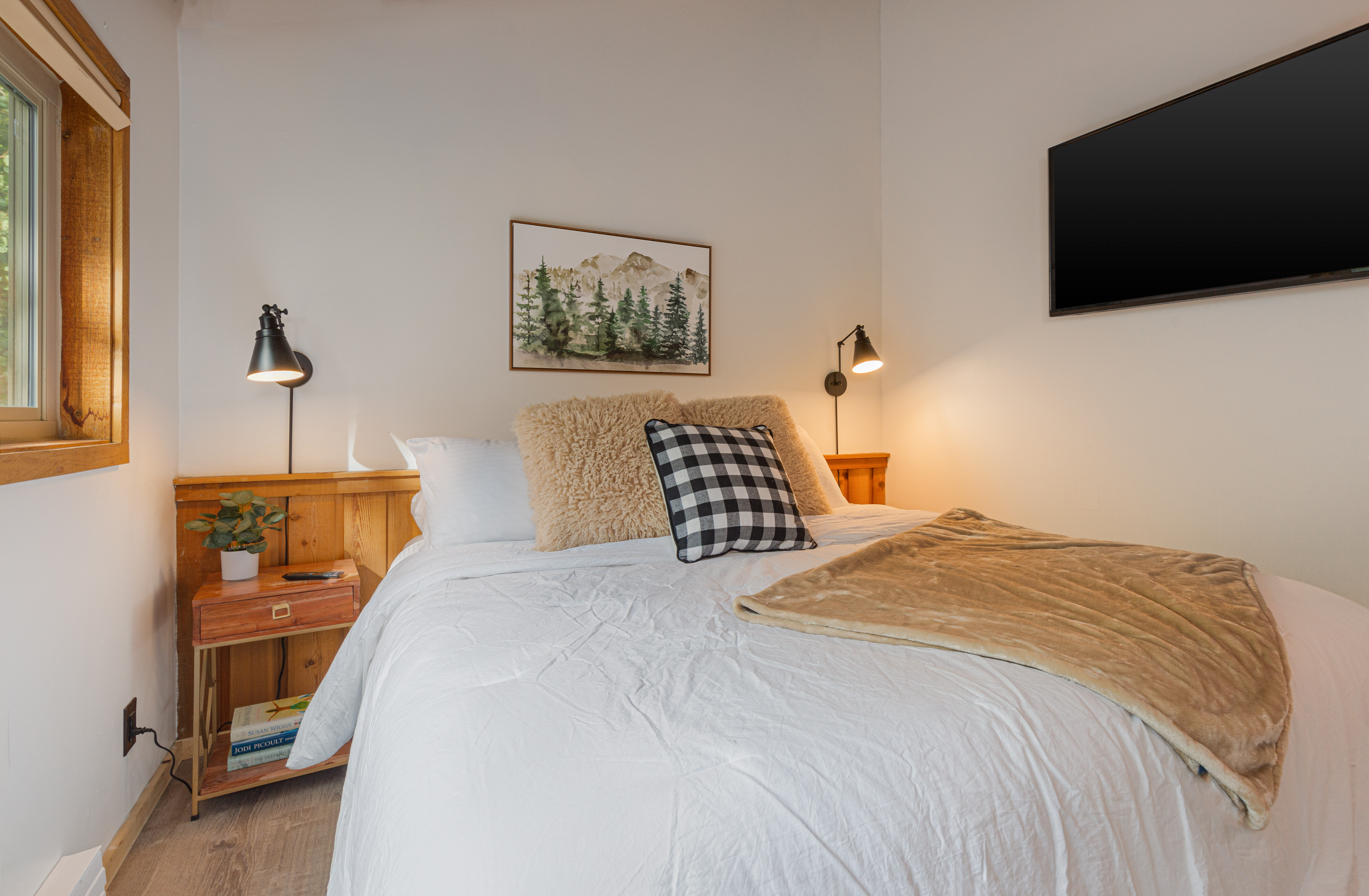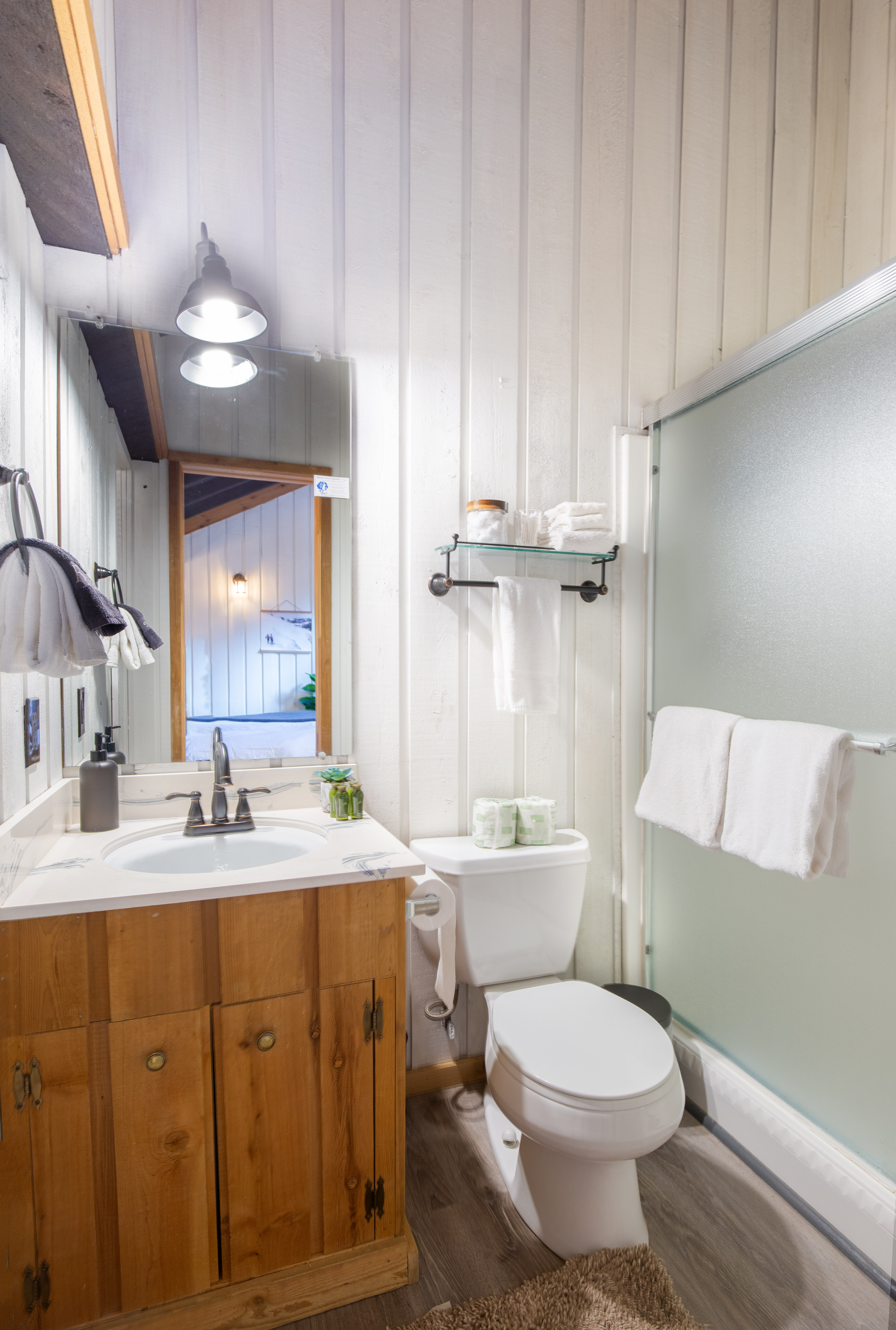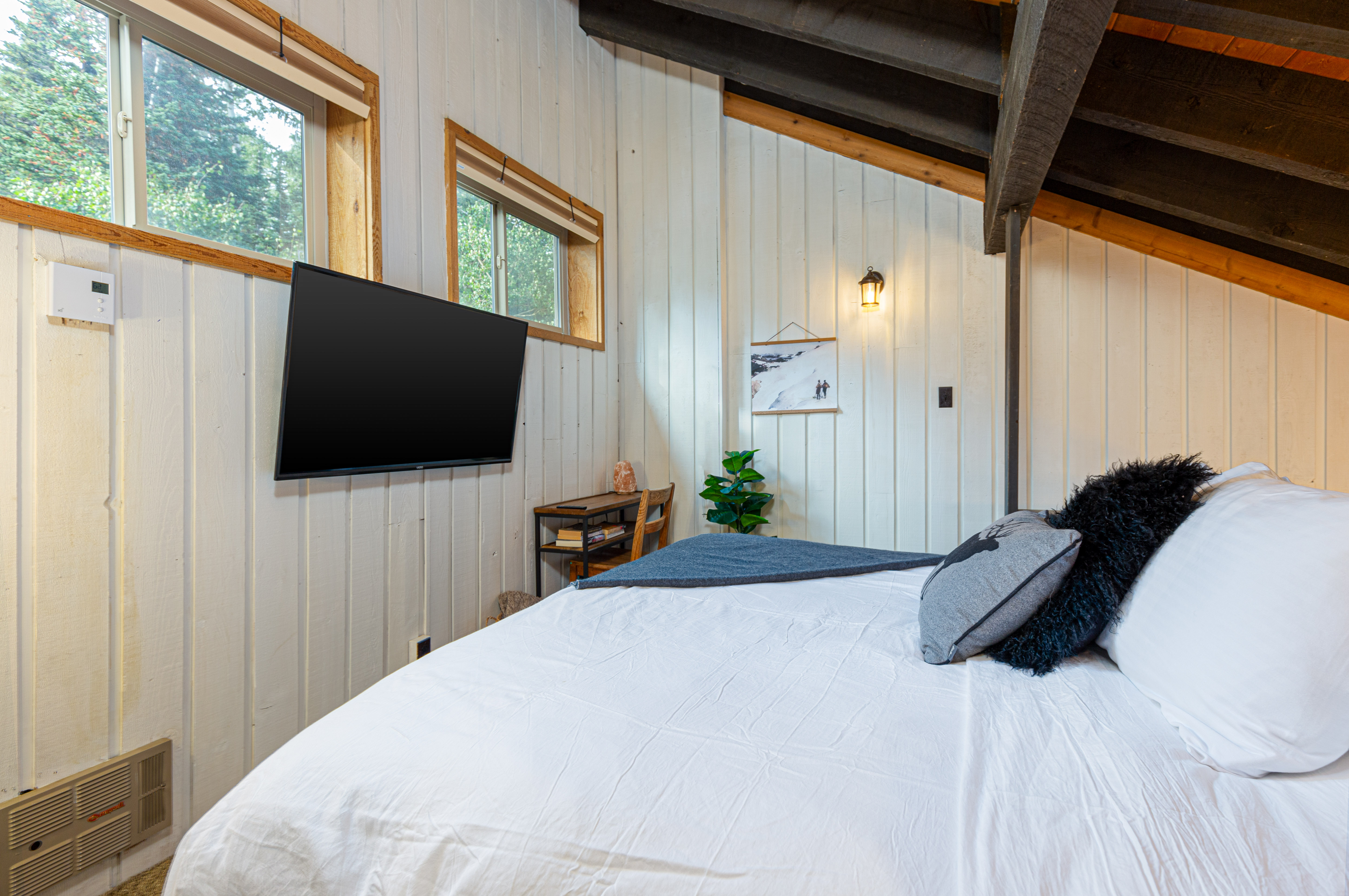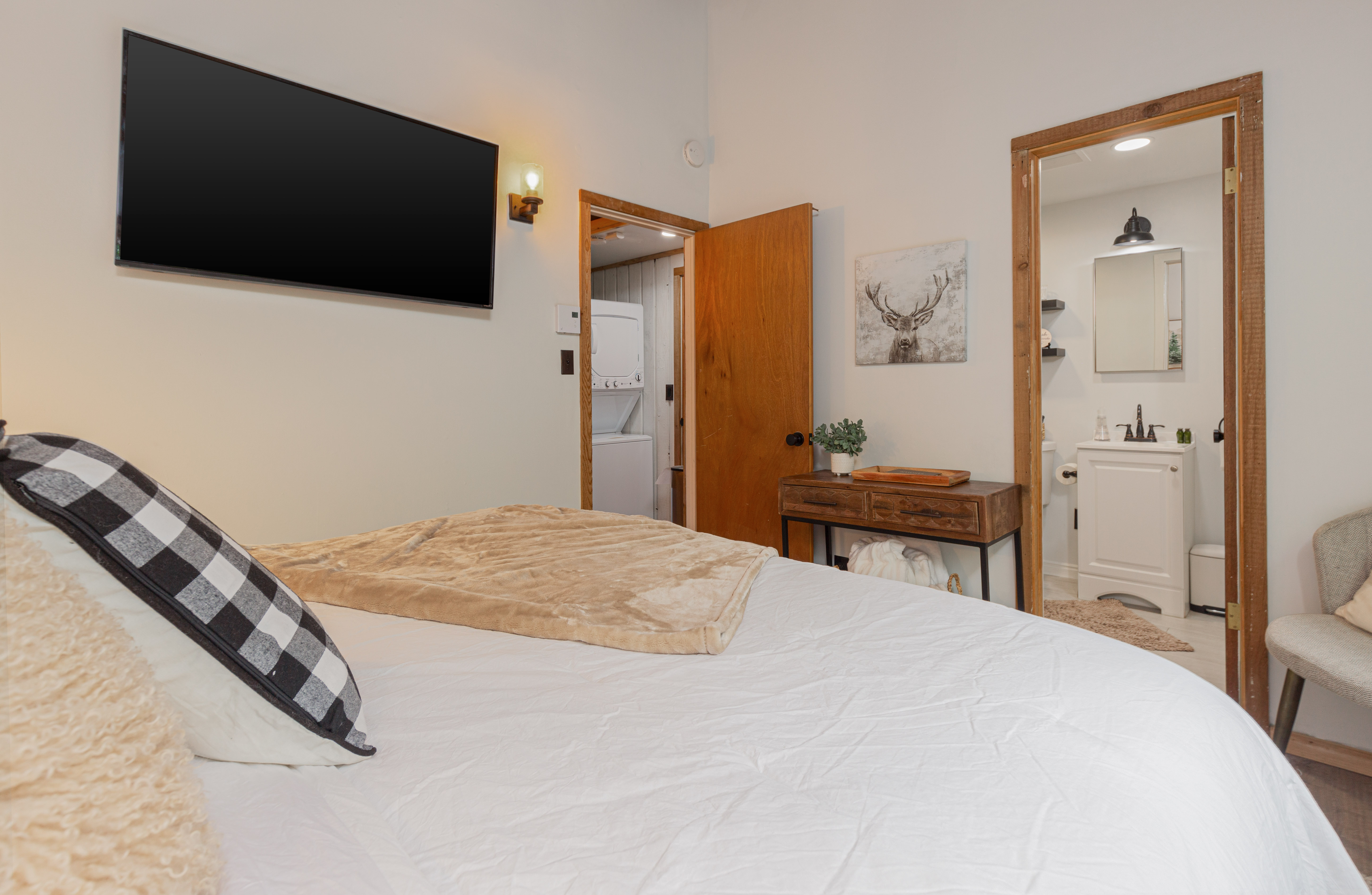 The bedroom on the main floor provides a peaceful haven, complete with a luxurious King size bed and soft, high-quality linens. The bathroom offers modern fixtures and a relaxing shower, ensuring you'll feel refreshed and ready to take on new adventures each day.