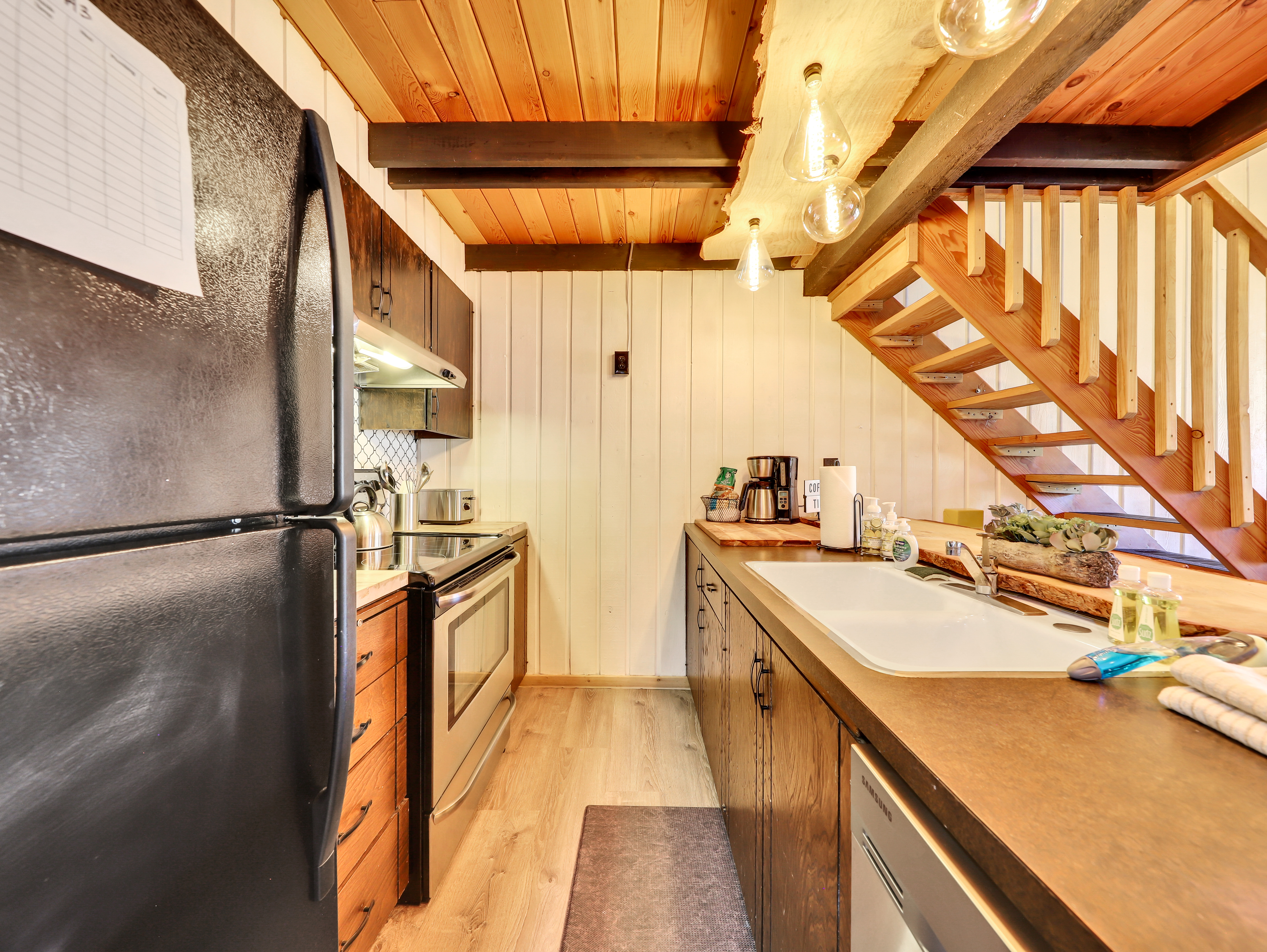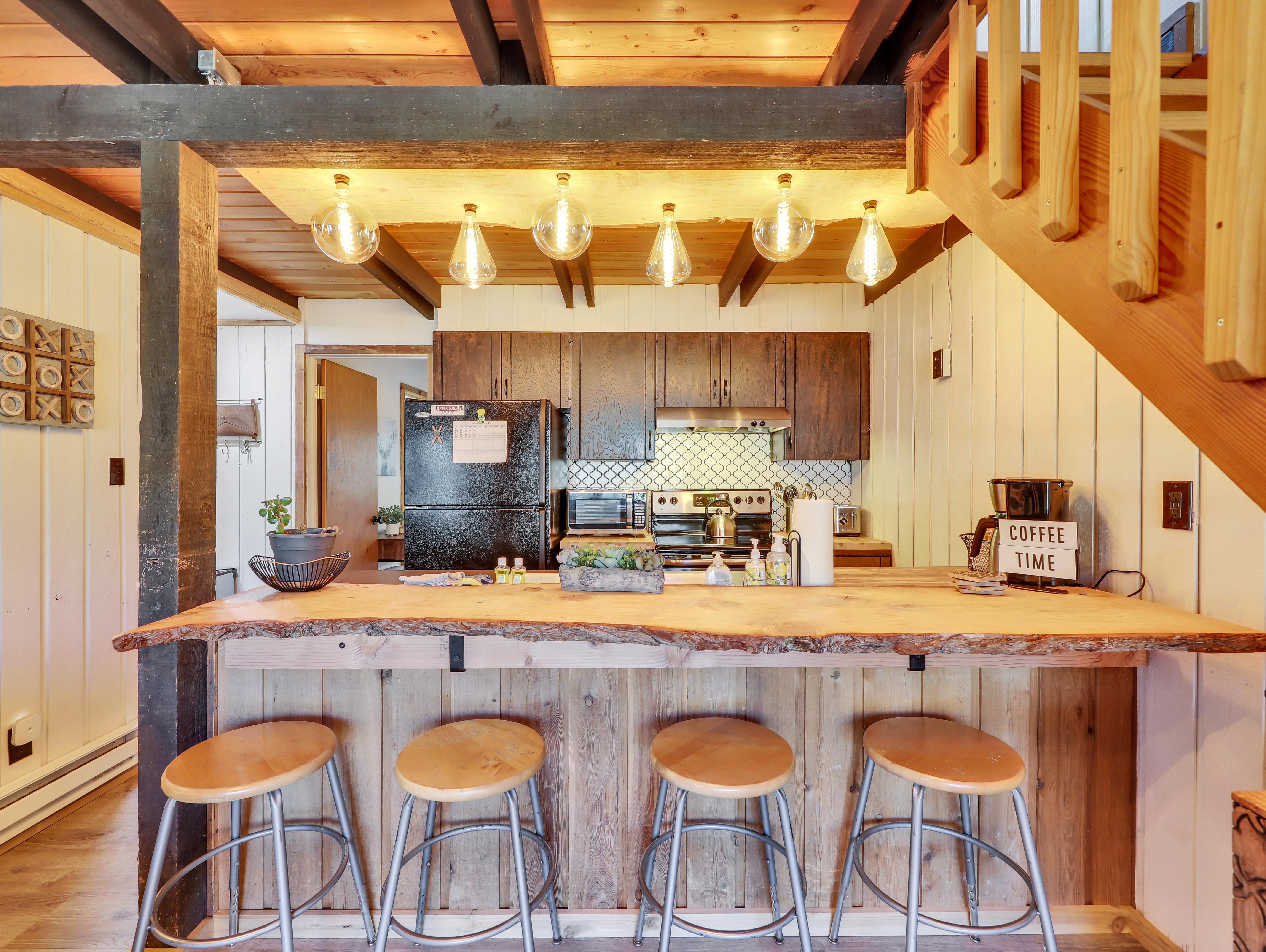 The main floor boasts an inviting living area, complete with a plush sofa sleeper, and comfortable seating, perfect for gathering with loved ones or curling up with a good book. Adjacent to the living area, you'll find a fully equipped kitchen, featuring modern appliances and all the essentials you need to whip up delicious meals.