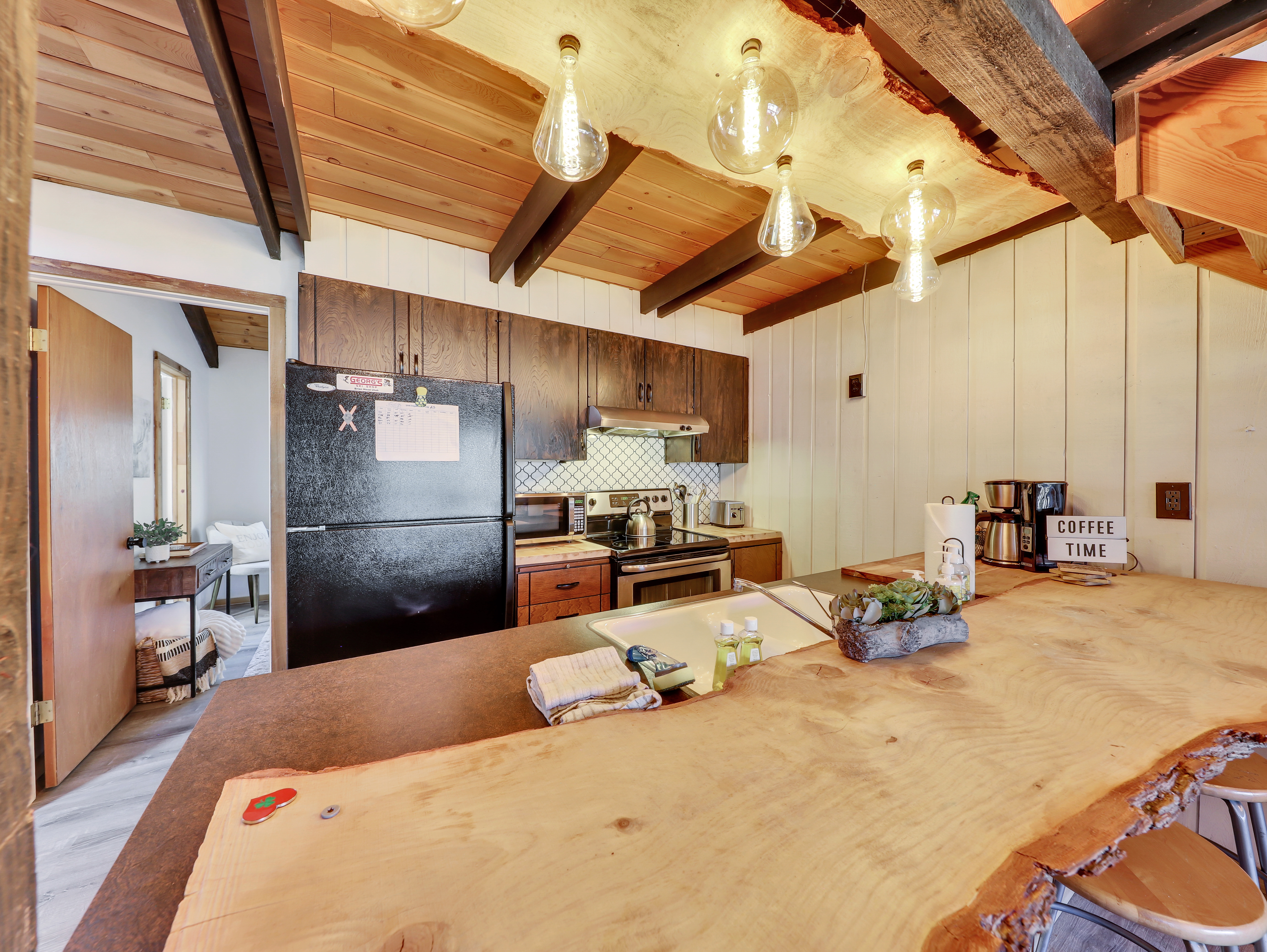 As you step inside, you'll be greeted by the warm ambiance of a wood-burning fireplace, creating the perfect atmosphere for relaxation and unwinding after a thrilling day on the slopes. The rustic yet modern decor adds a touch of mountain charm to your stay, making you feel right at home.