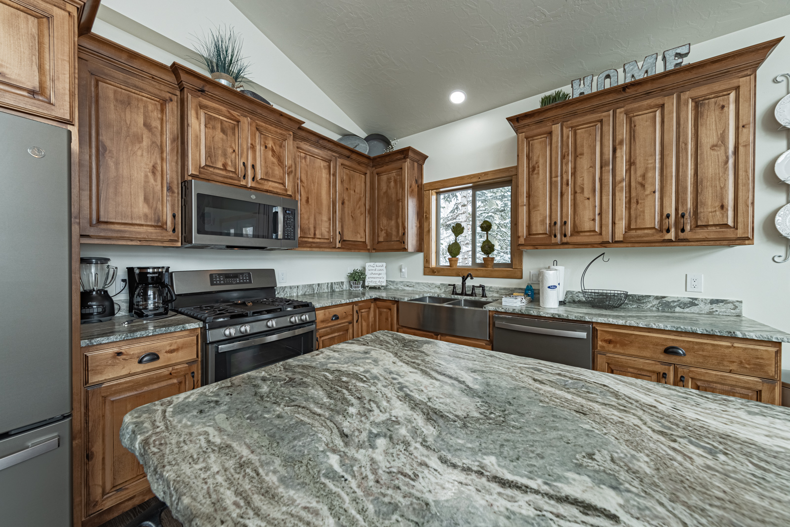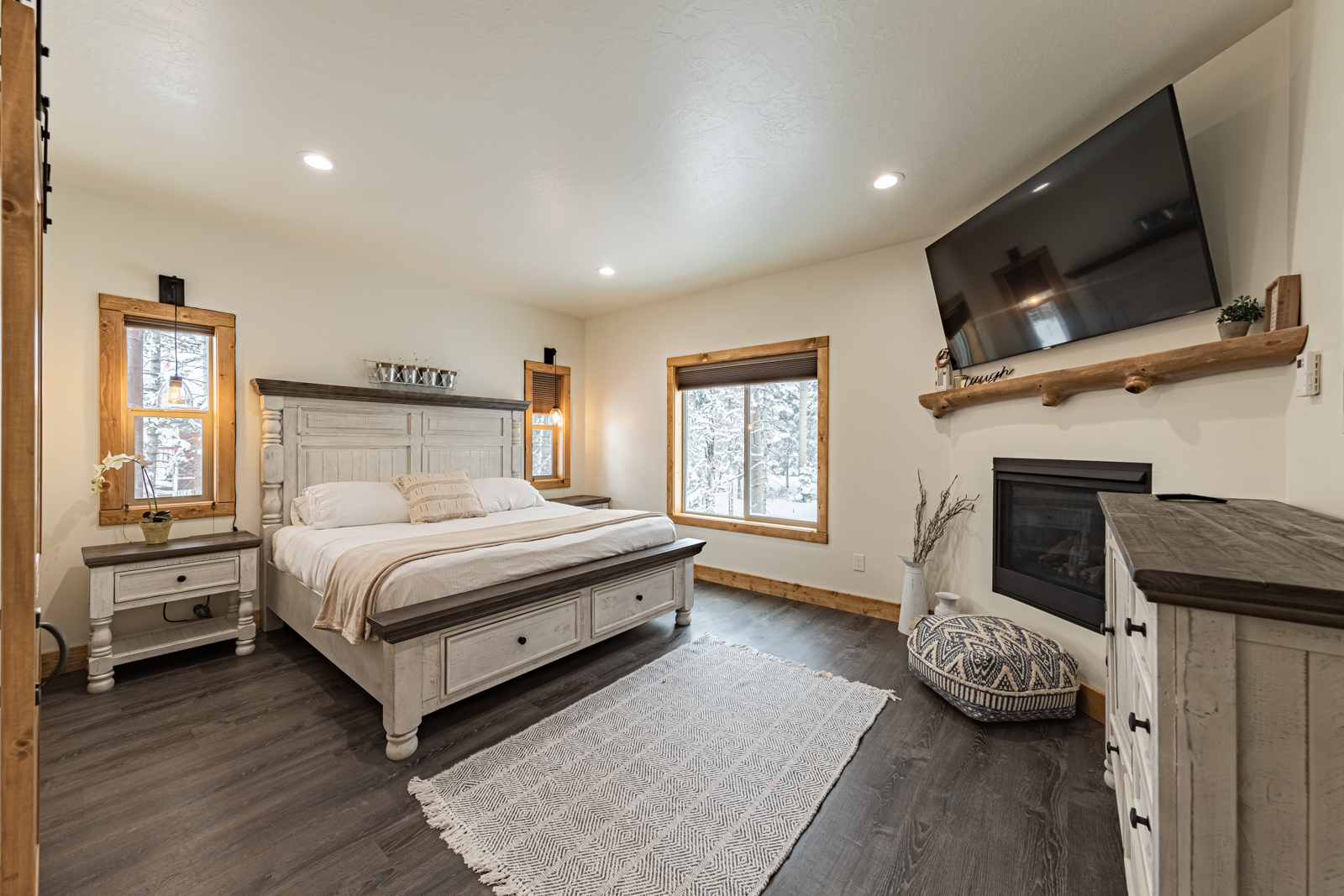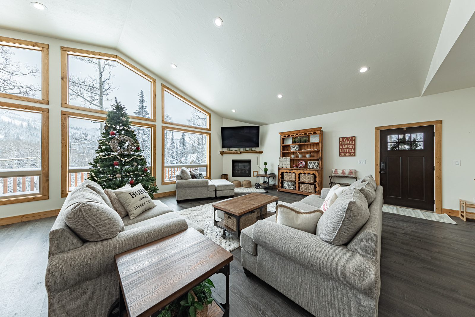 Step inside to a bright, open living area with large picture windows, comfortable furnishings, and a cozy fireplace — the perfect place to relax after a day on the slopes or trails. The fully equipped kitchen and family-sized dining area make it easy to enjoy meals together and create lasting memories.