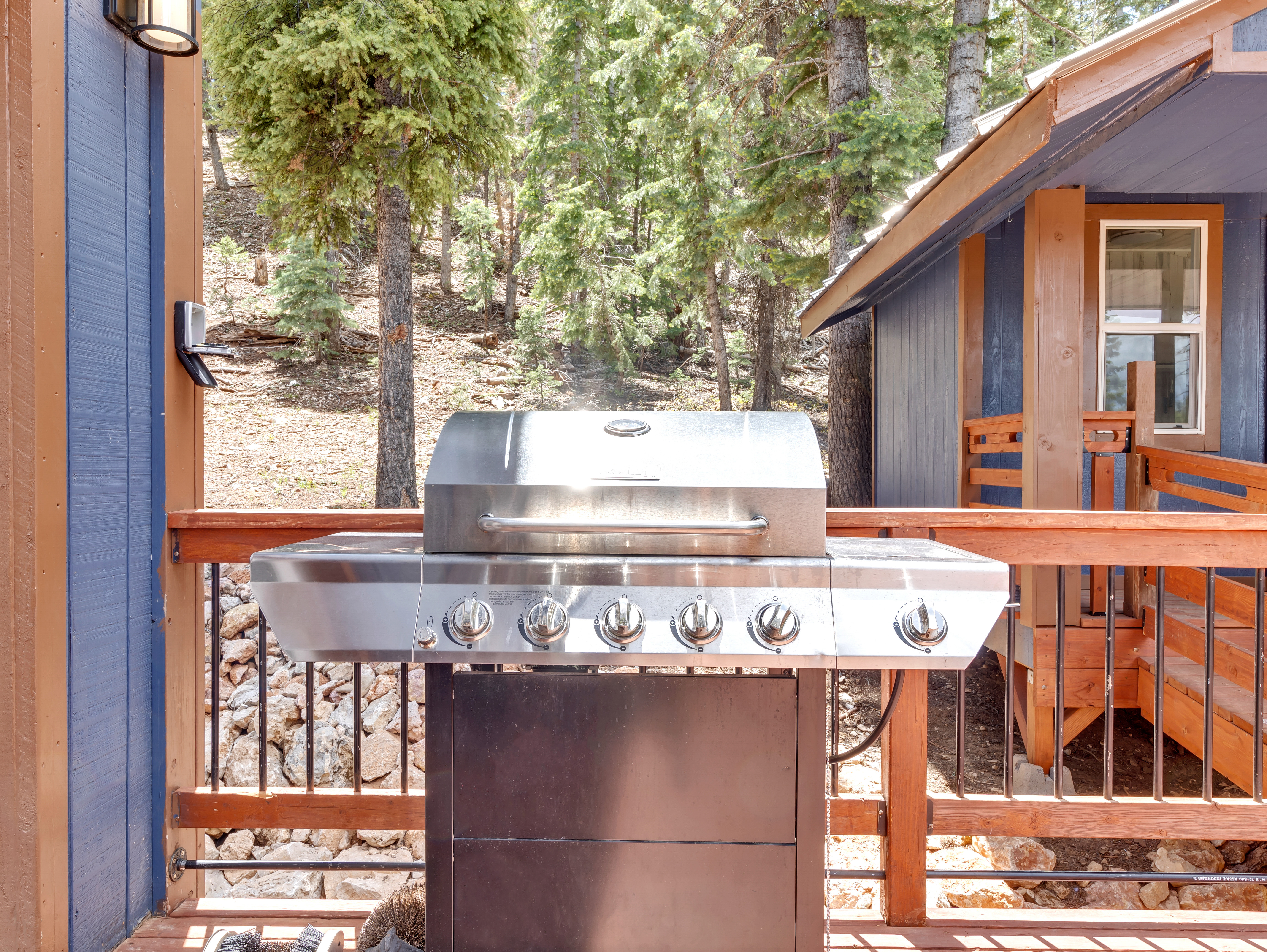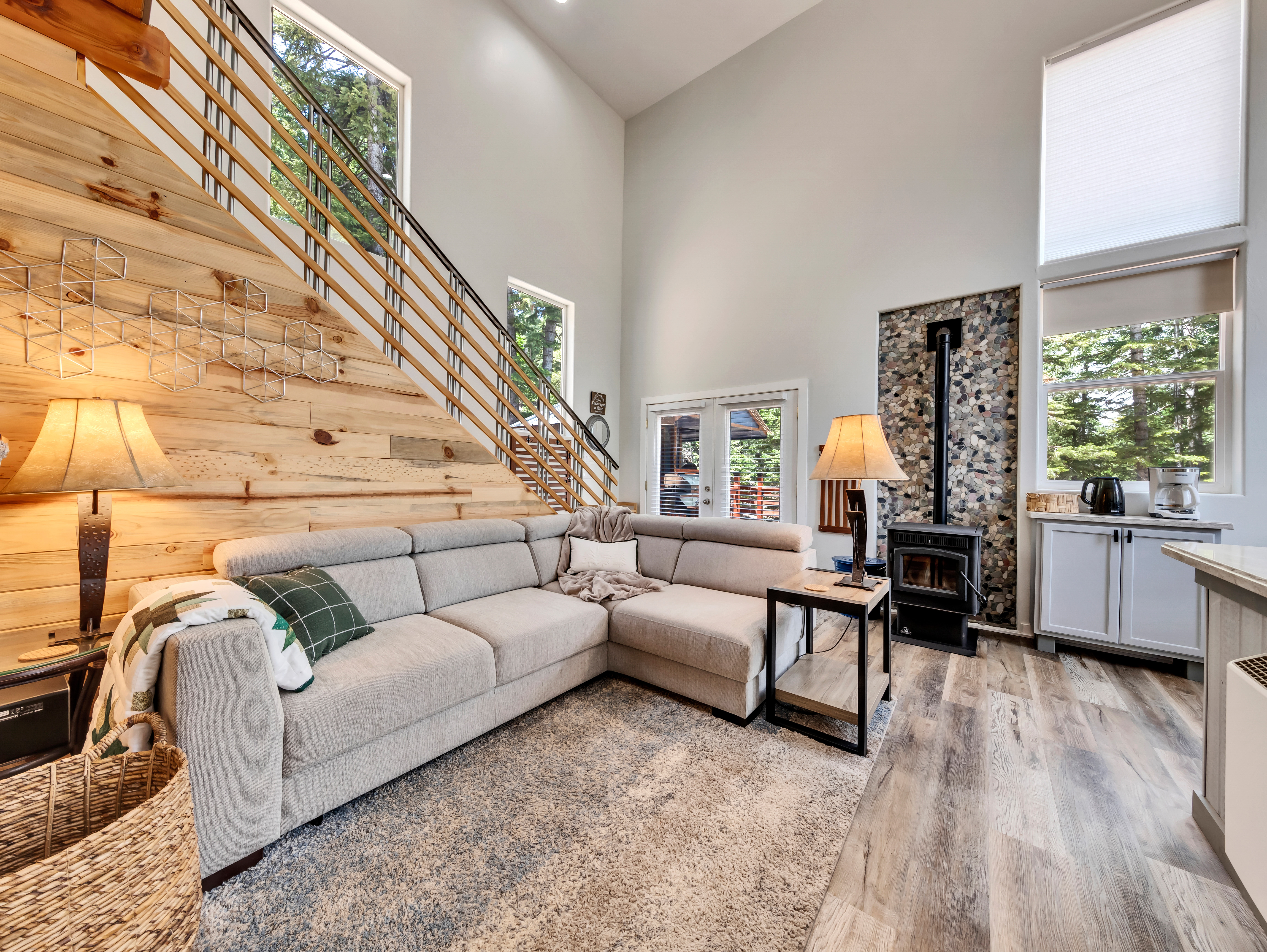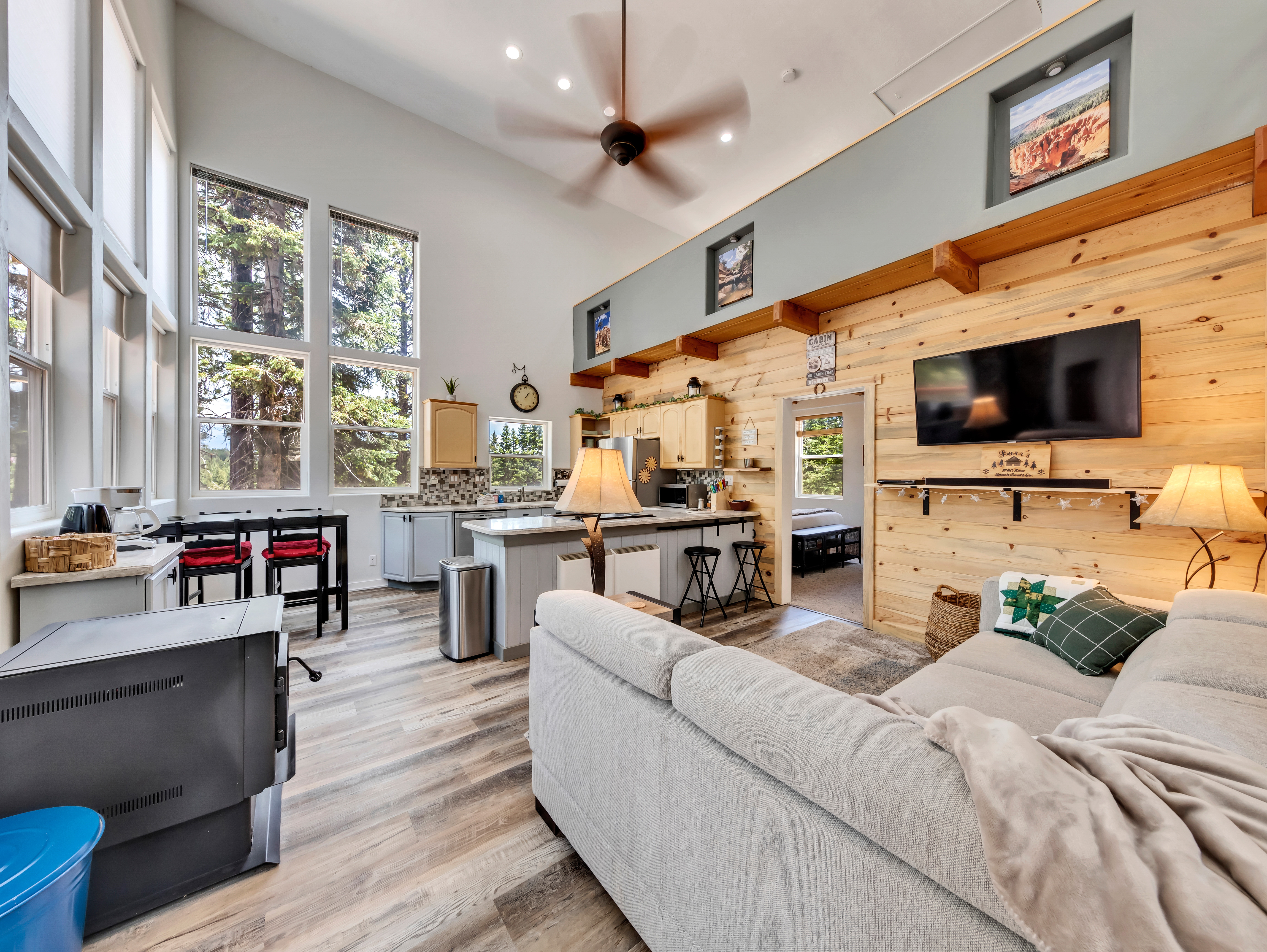 Arrive at the striking blue cabin, standing out beautifully against the lush forest. Inside, warm wood accents, tasteful décor, and a crackling fireplace create a cozy place to unwind after your adventures.