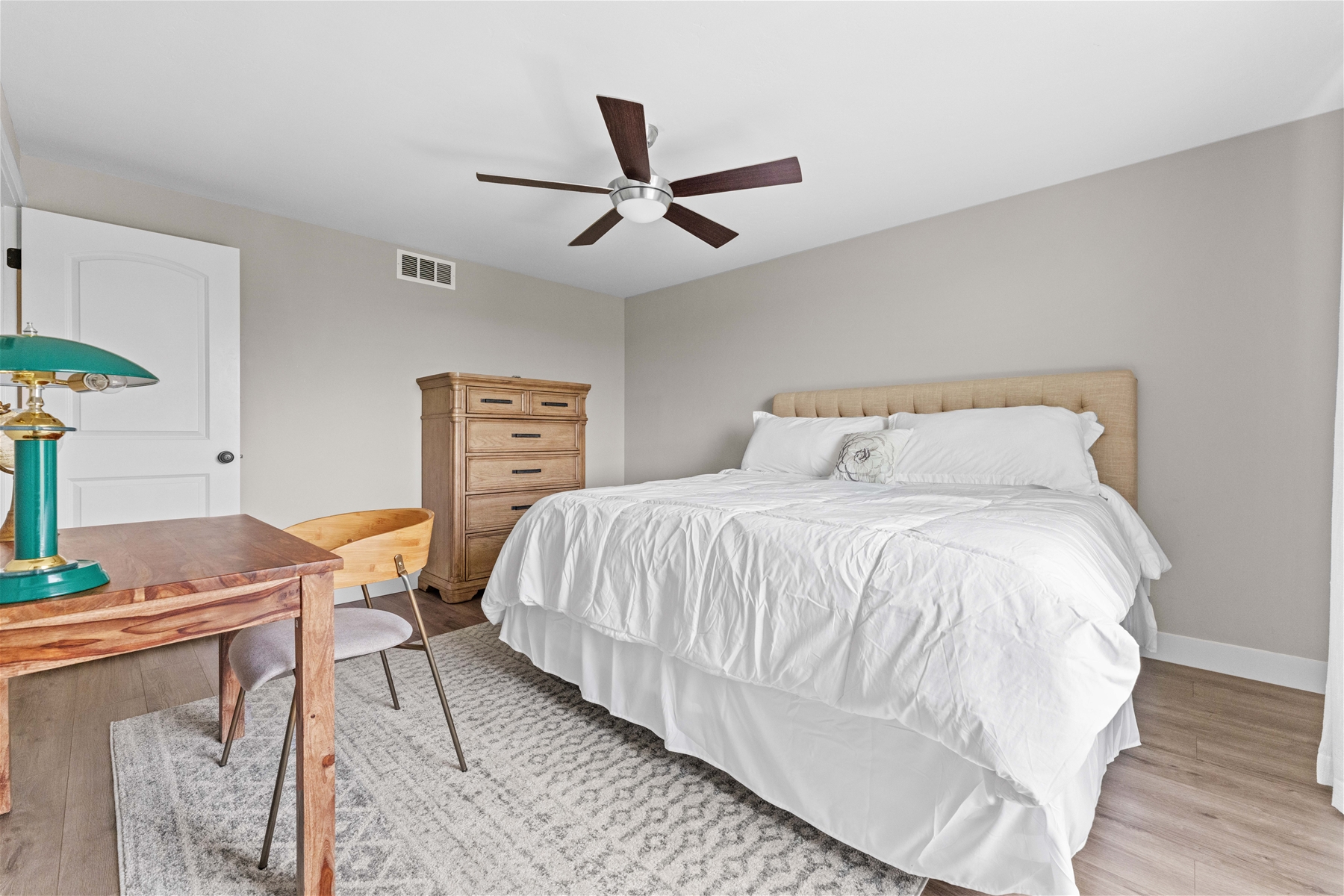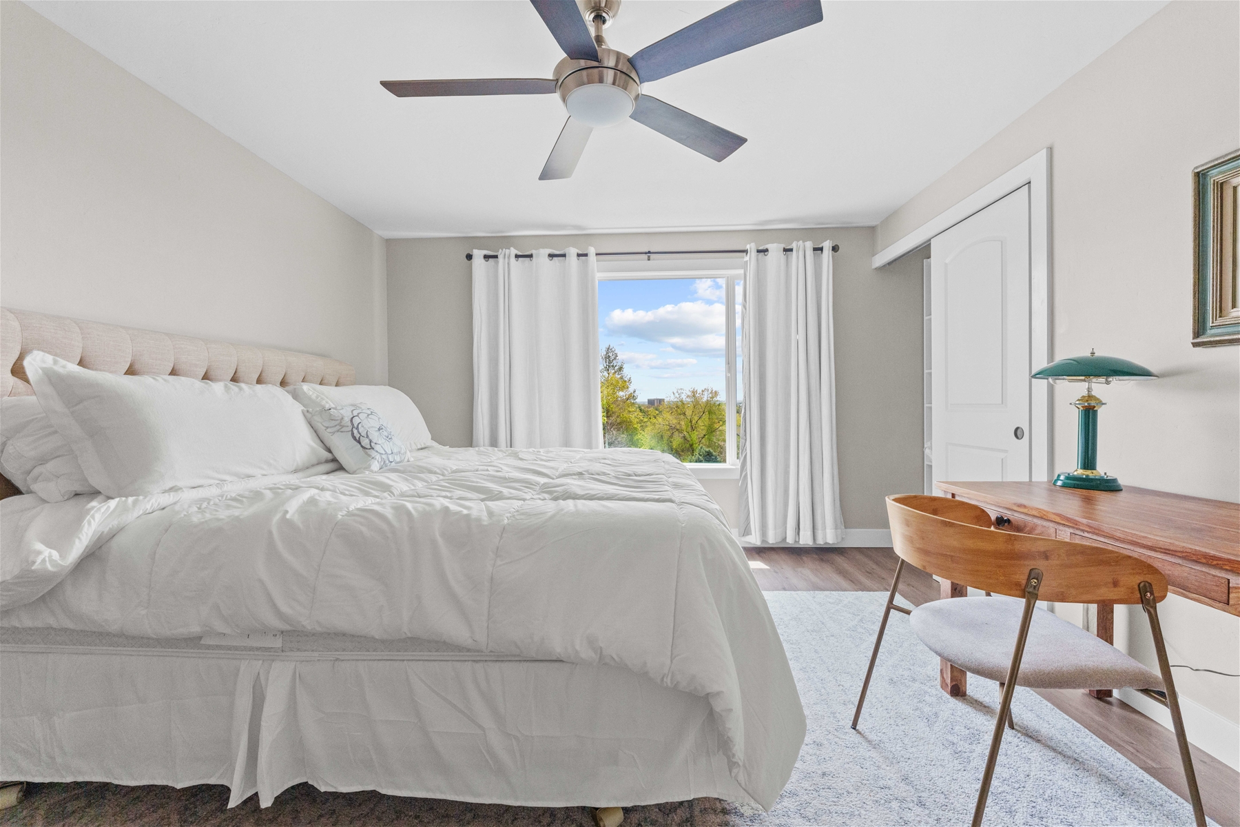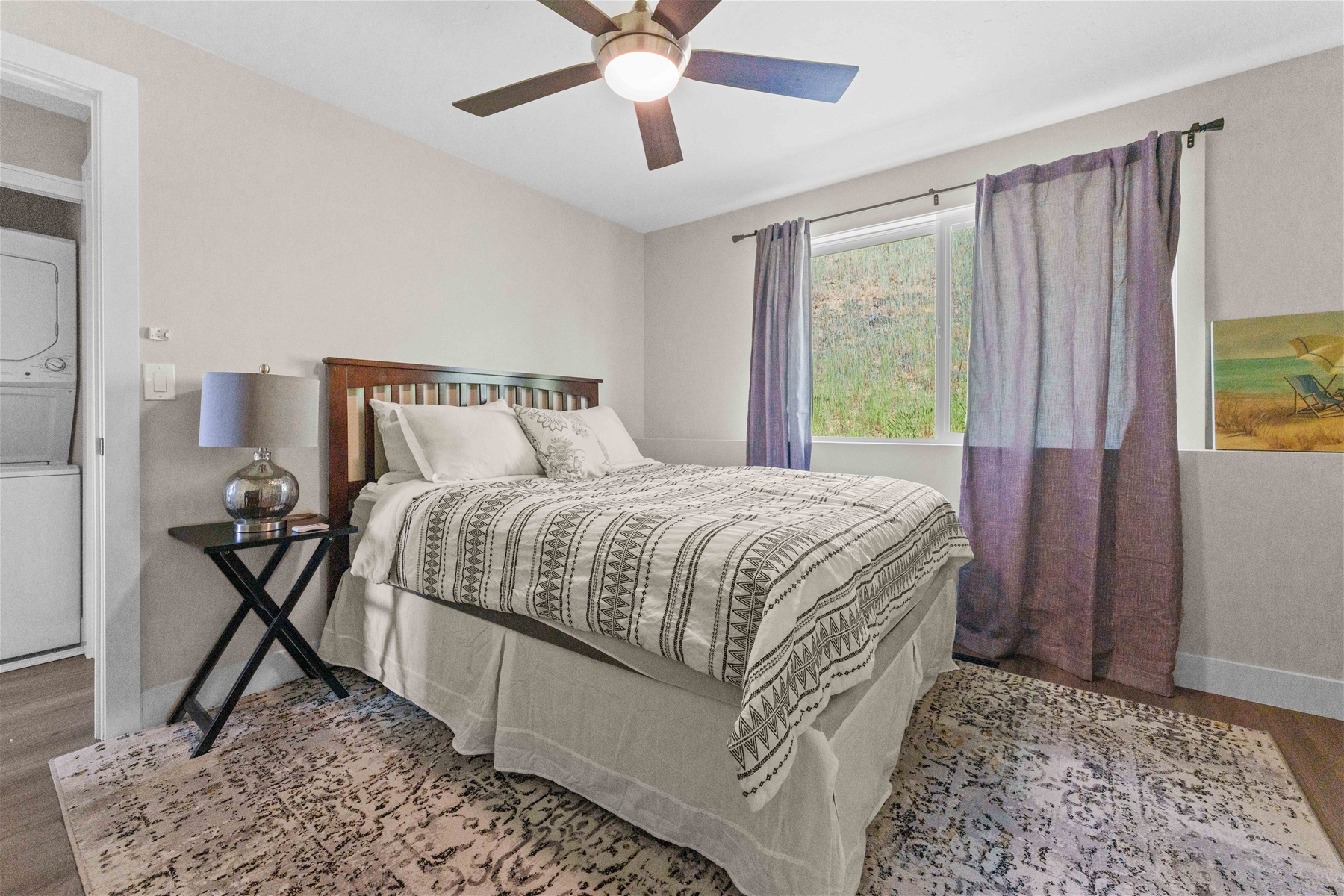 Each bedroom is thoughtfully furnished with a desk, providing a perfect workspace separate from the home’s common areas. The bathroom is conveniently located just outside the bedrooms, with laundry facilities directly opposite. Outside, the porch offers plenty of space to enjoy the sun and the expansive city views.
