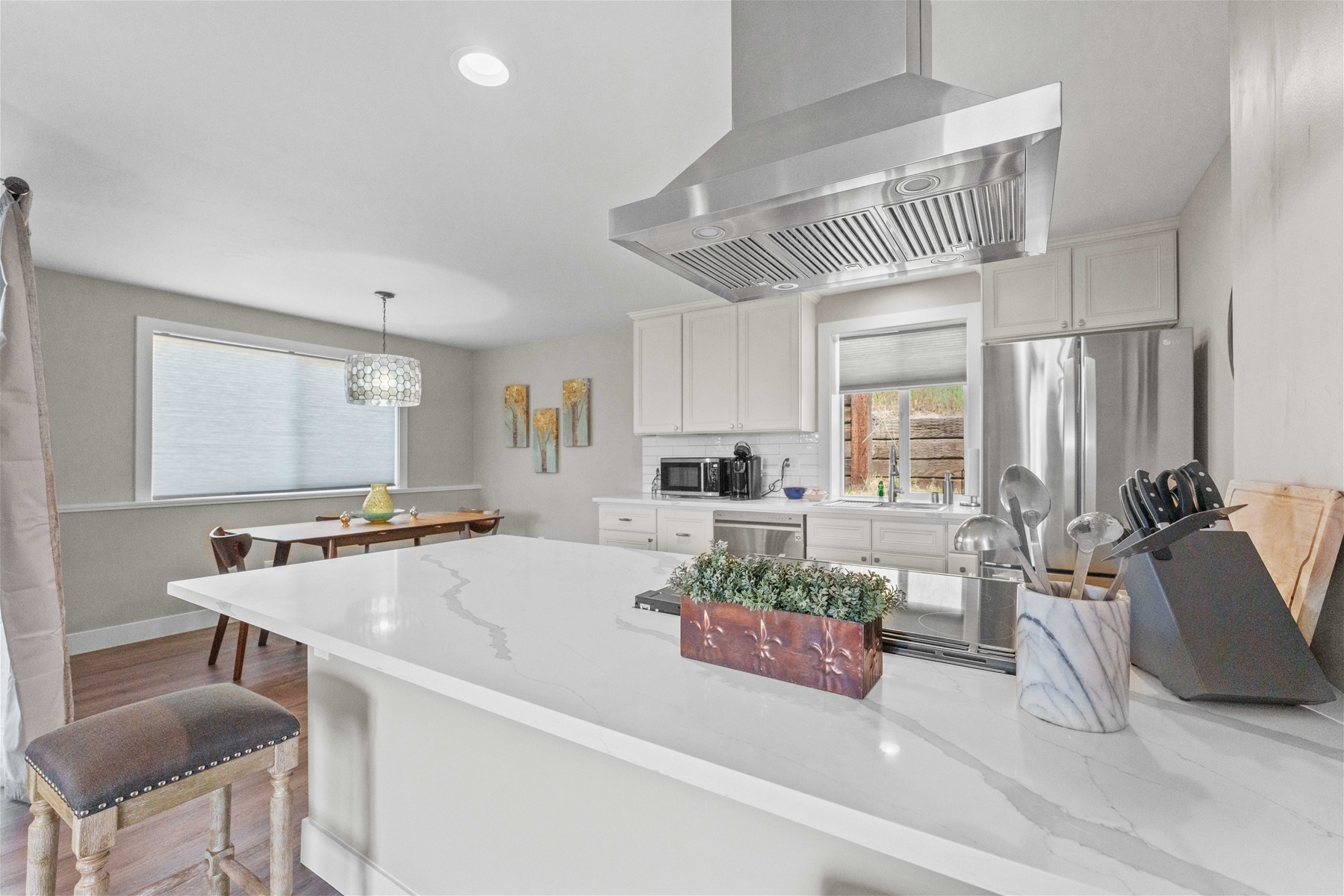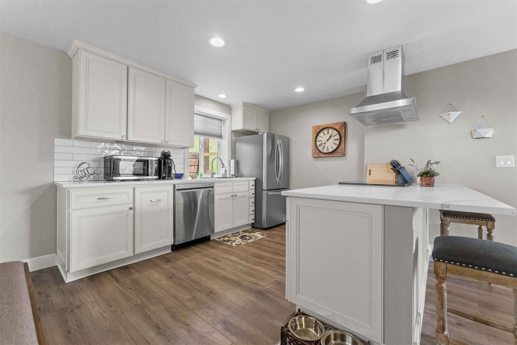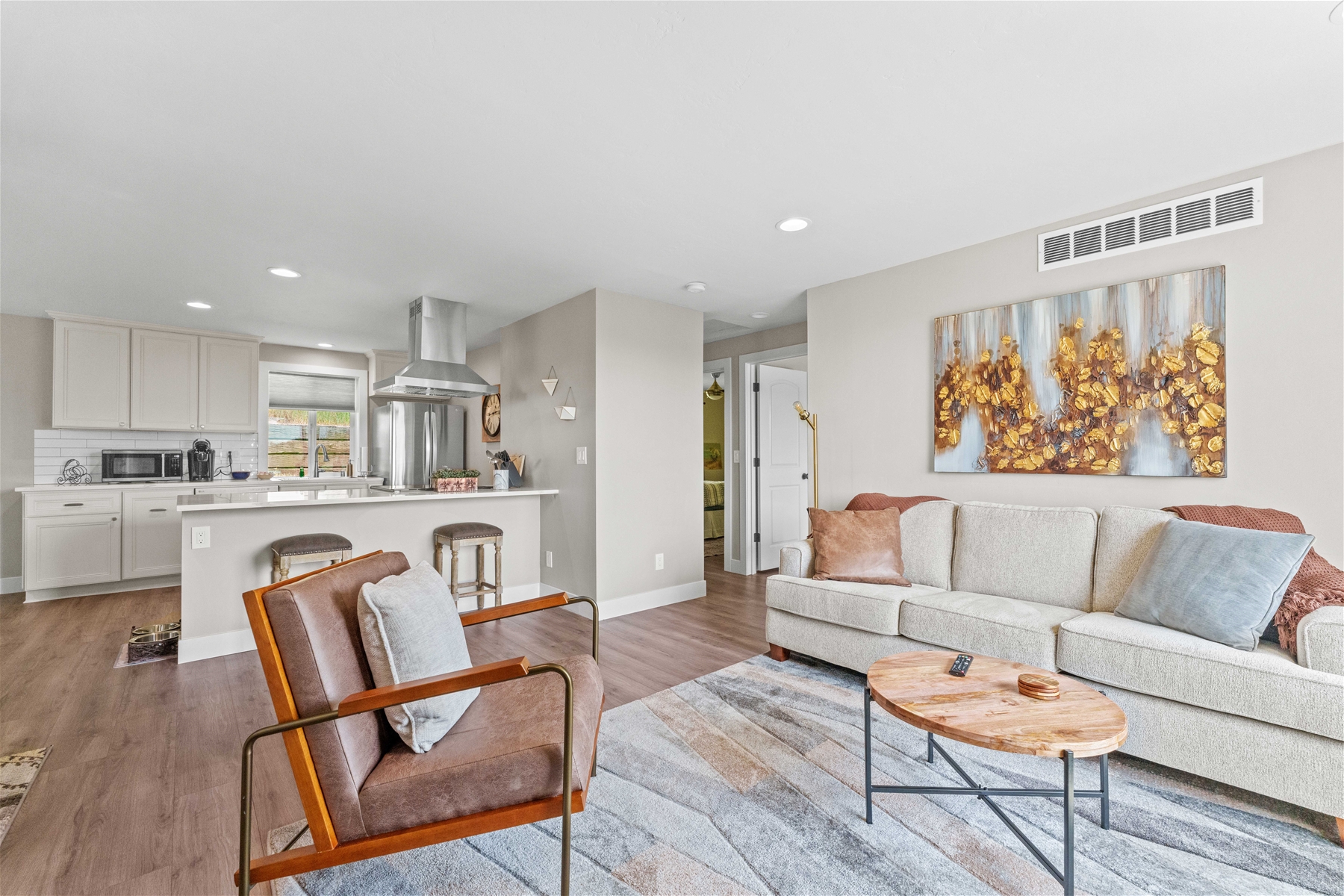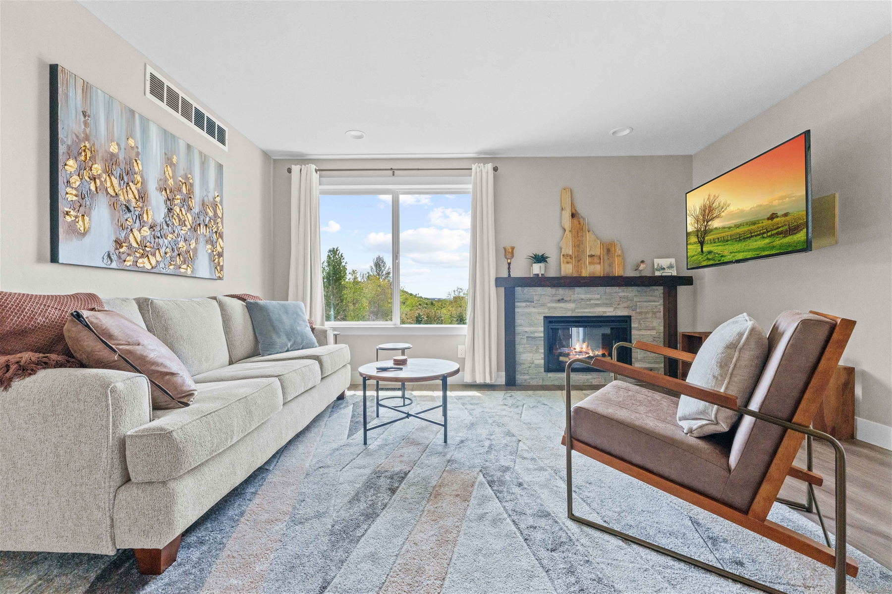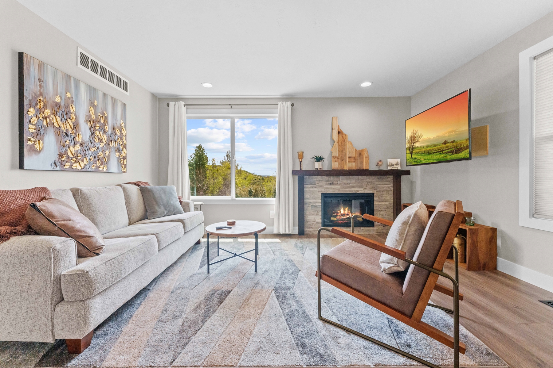 Nestled on a tranquil hillside, this modern home offers a peaceful retreat filled with comfort and serenity. As you enter, natural light floods through large windows, illuminating every room and enhancing the welcoming atmosphere. To the right, the living room features a 55” wall-mounted smart TV and ample seating for a relaxing viewing experience. To the left, the well-equipped kitchen boasts an electric range, microwave, dishwasher, and extensive cabinet space.