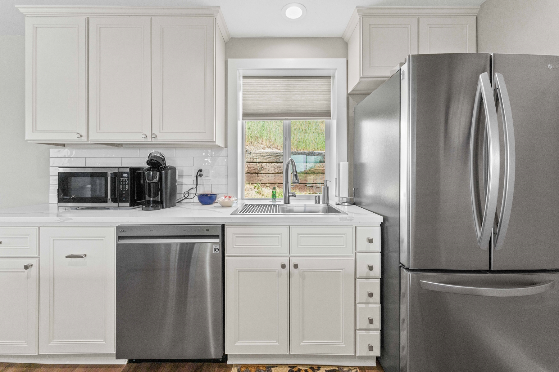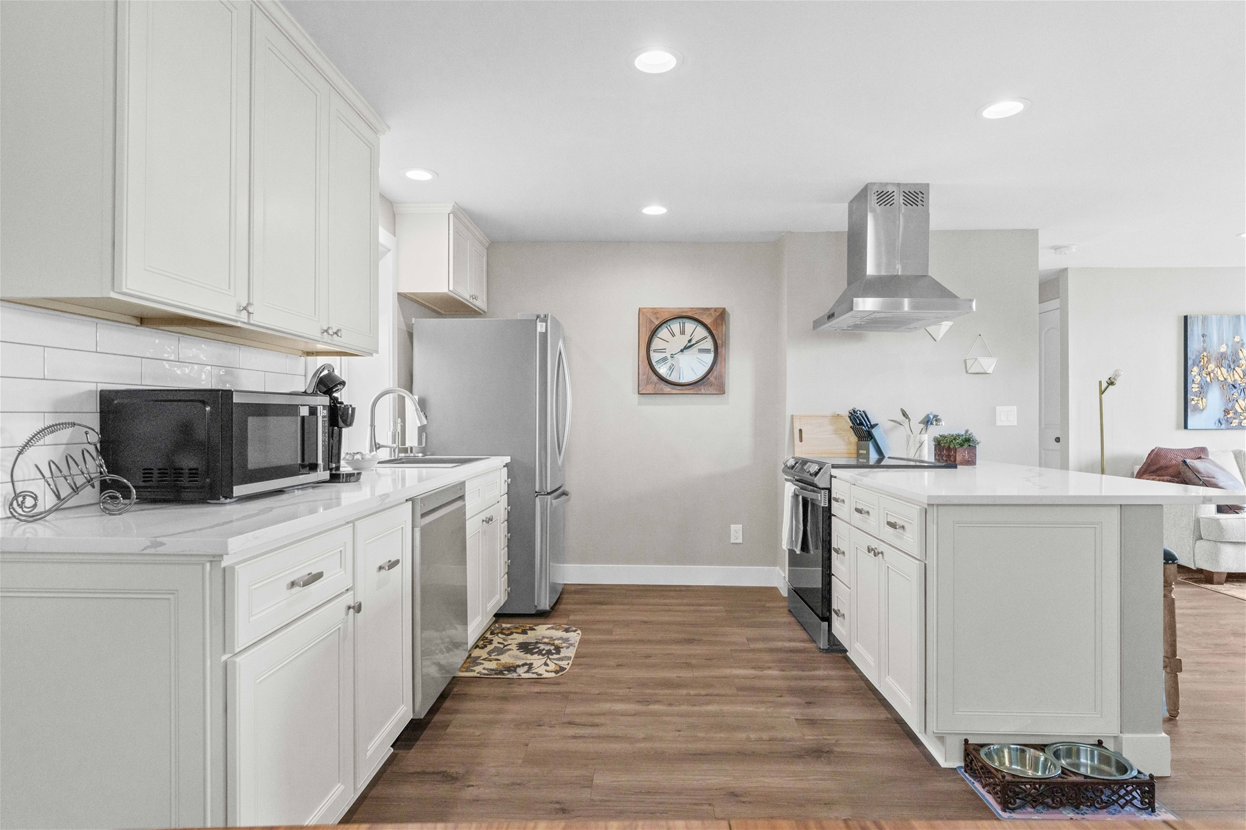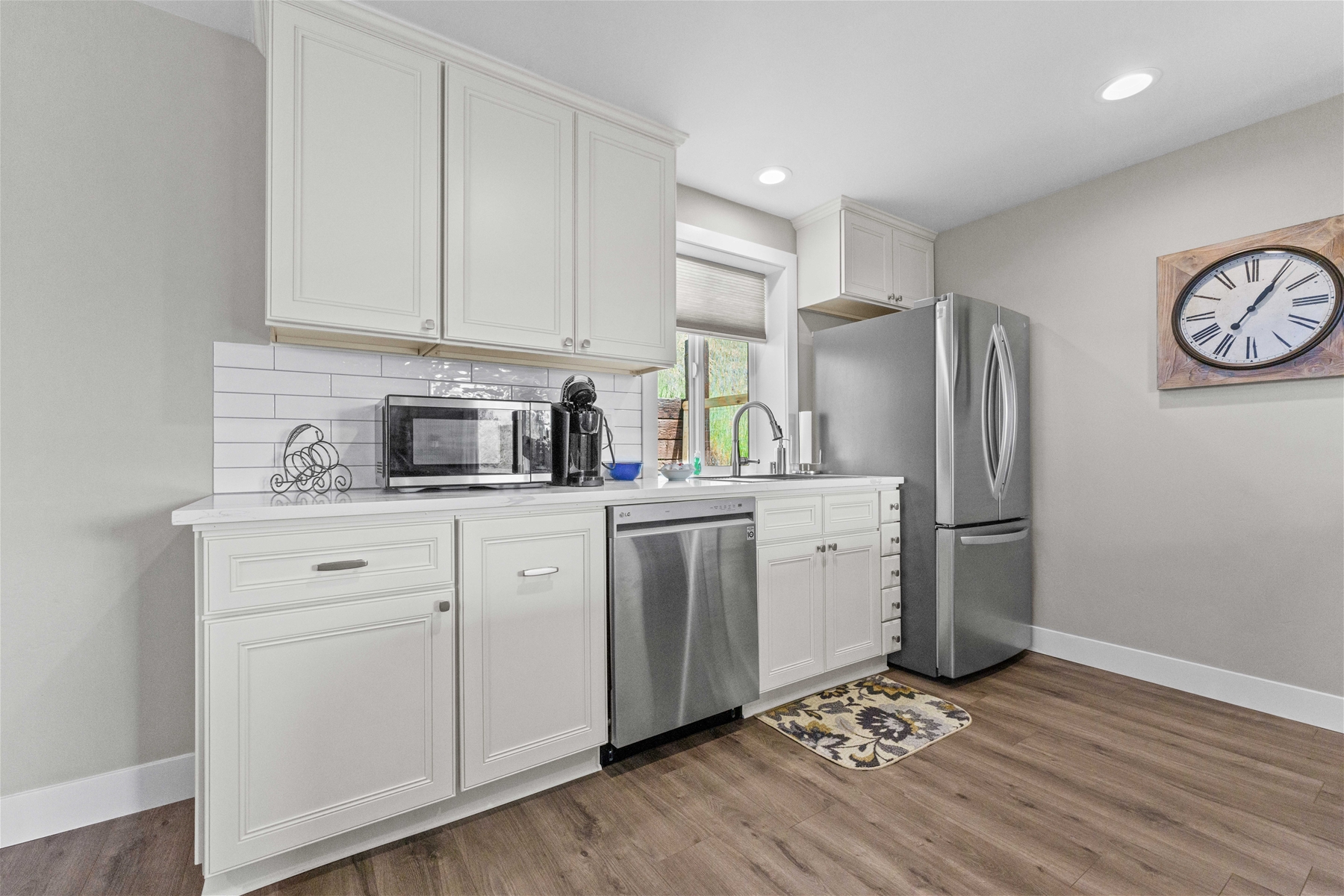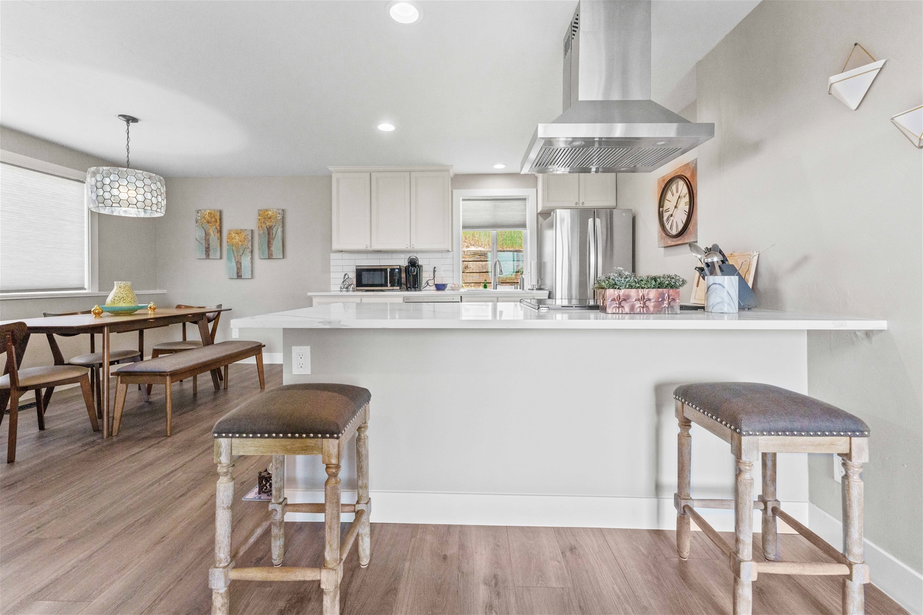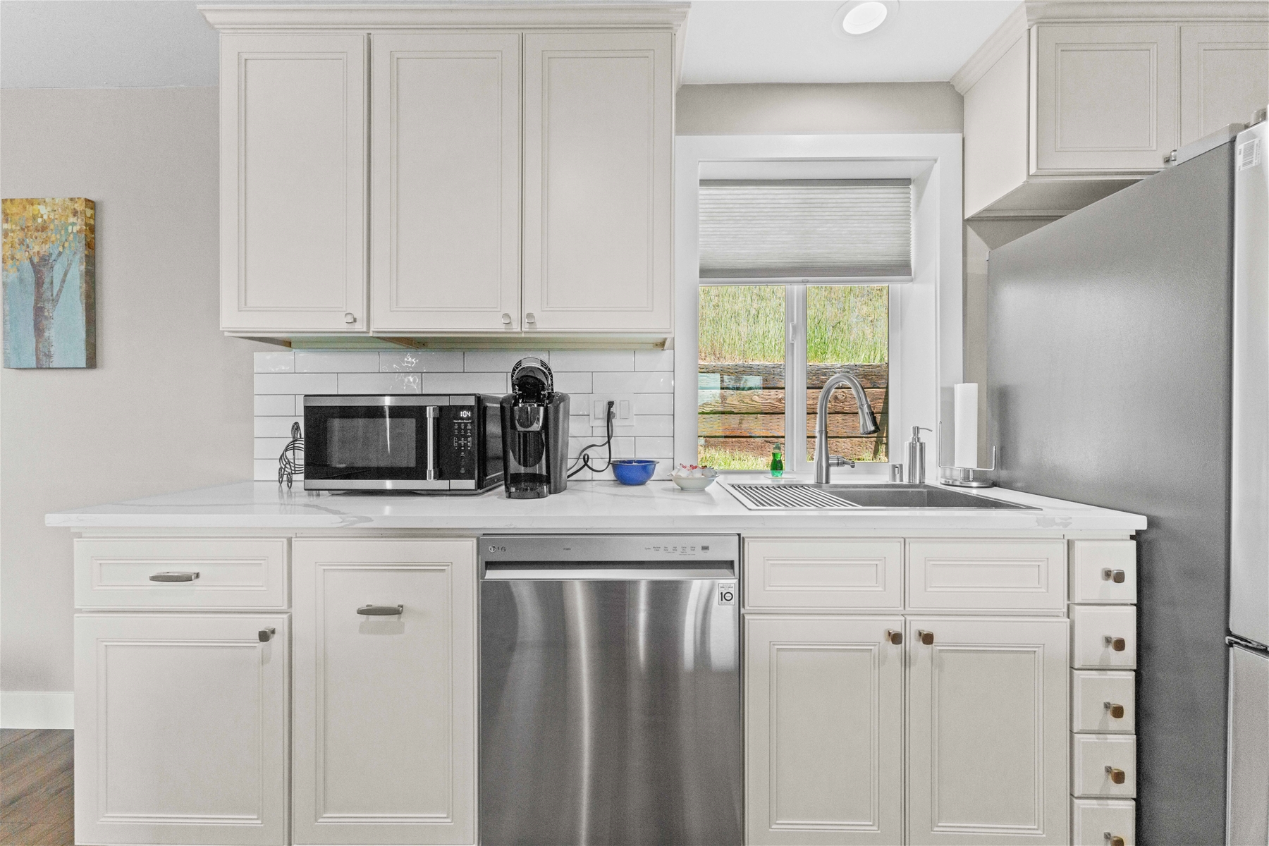 Nestled on a tranquil hillside, this modern home offers a peaceful retreat filled with comfort and serenity. As you enter, natural light floods through large windows, illuminating every room and enhancing the welcoming atmosphere. To the right, the living room features a 55” wall-mounted smart TV and ample seating for a relaxing viewing experience. To the left, the well-equipped kitchen boasts an electric range, microwave, dishwasher, and extensive cabinet space.