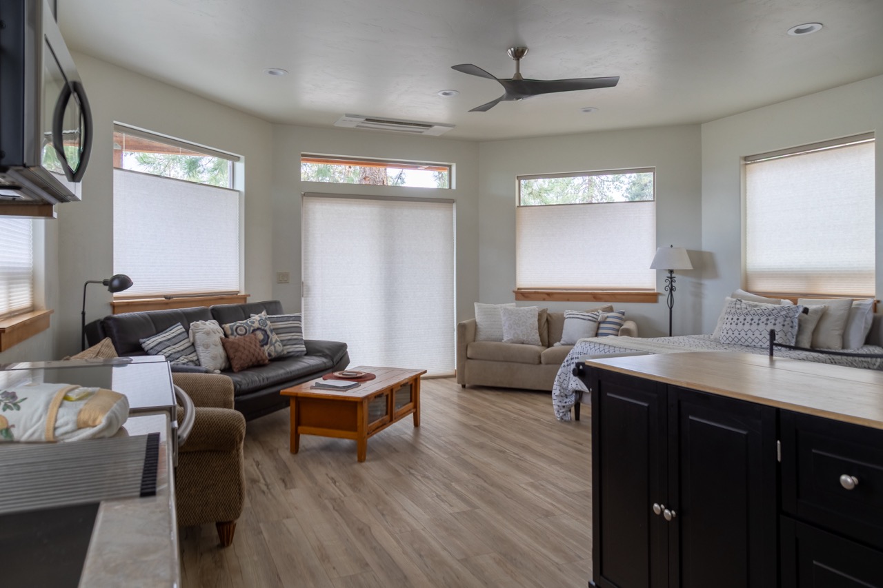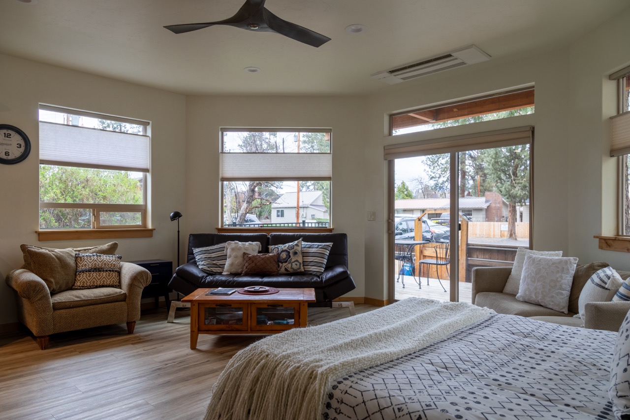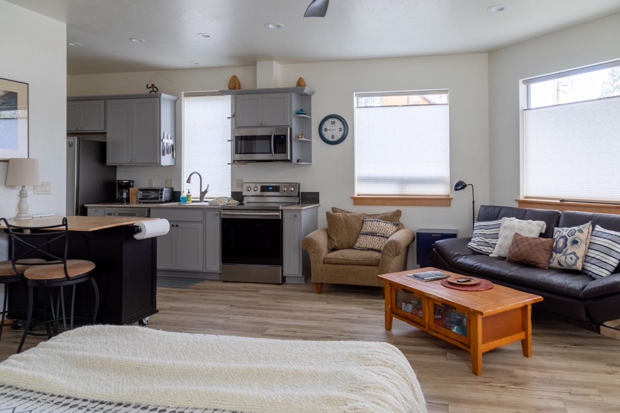 The studio features a fully equipped kitchen, perfect for preparing meals at home, along with a full bathroom and in-unit washer and dryer—a rare and convenient find in a downtown studio. Inside, you’ll enjoy comfortable seating and a bright, functional layout, while the outdoor patio provides a great spot to relax after a day exploring Central Oregon.