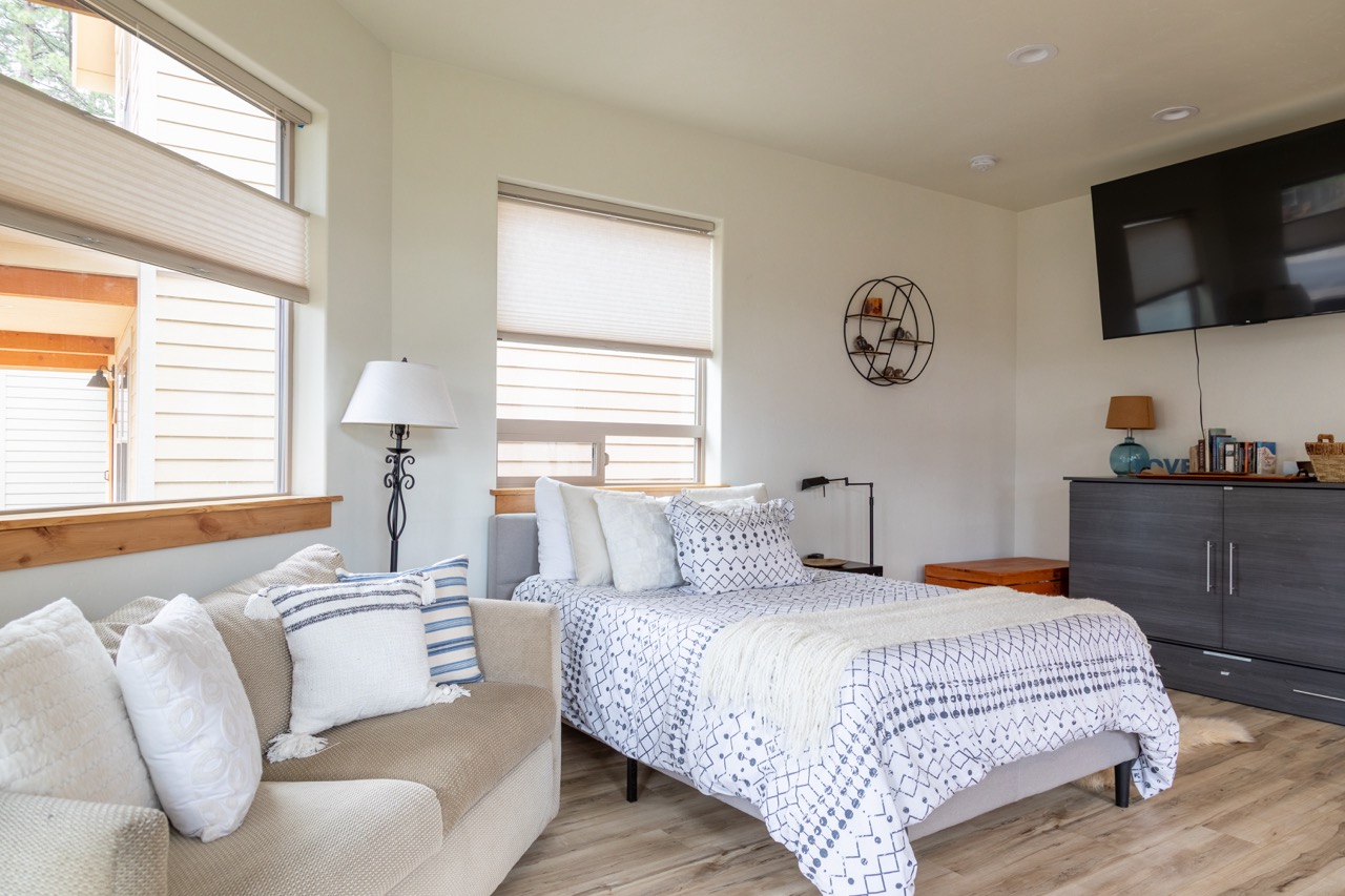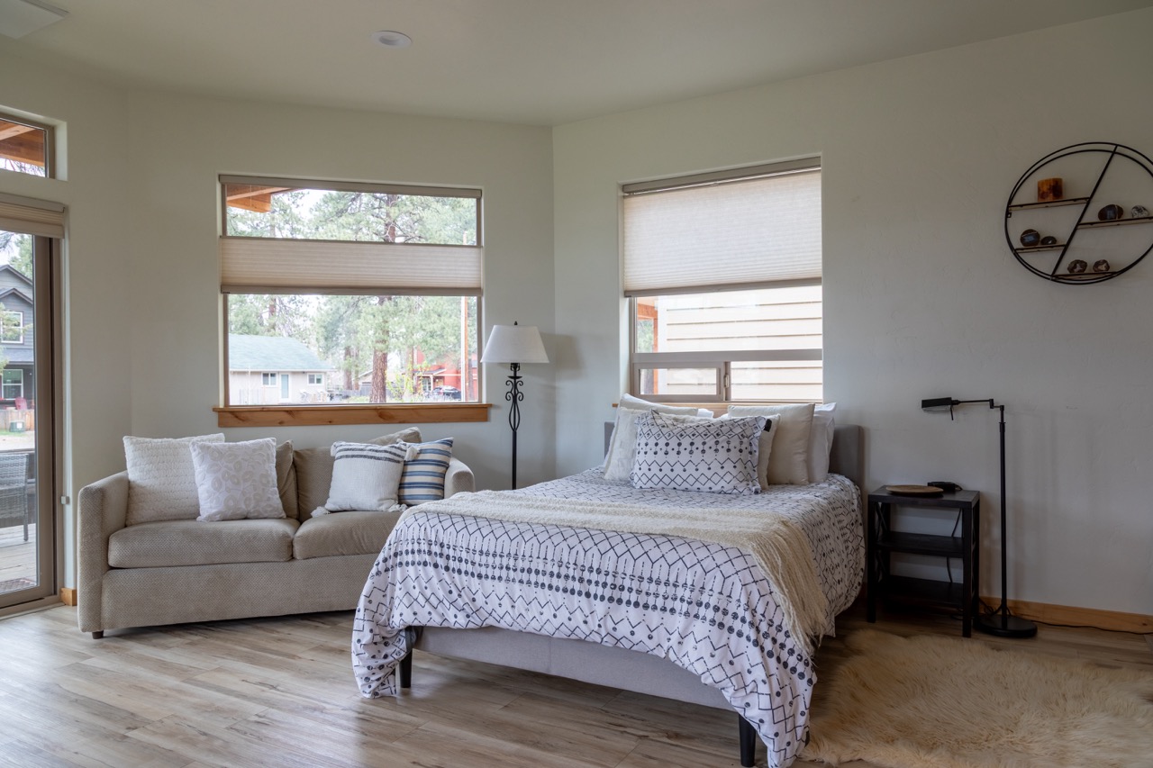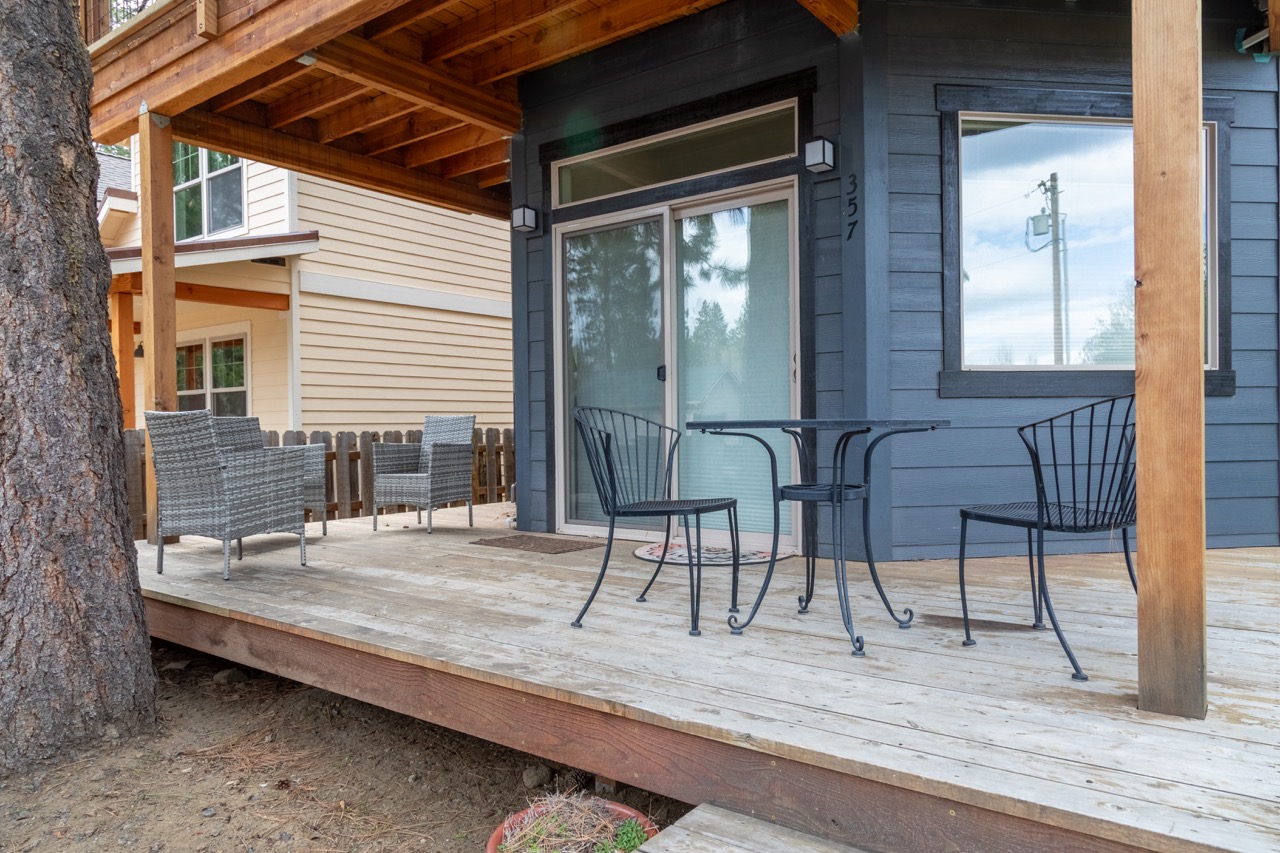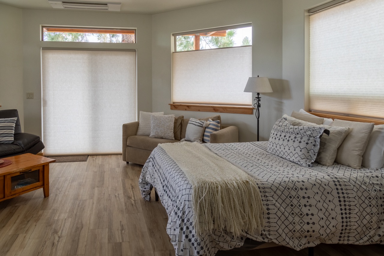 The studio features a fully equipped kitchen, perfect for preparing meals at home, along with a full bathroom and in-unit washer and dryer—a rare and convenient find in a downtown studio. Inside, you’ll enjoy comfortable seating and a bright, functional layout, while the outdoor patio provides a great spot to relax after a day exploring Central Oregon.
