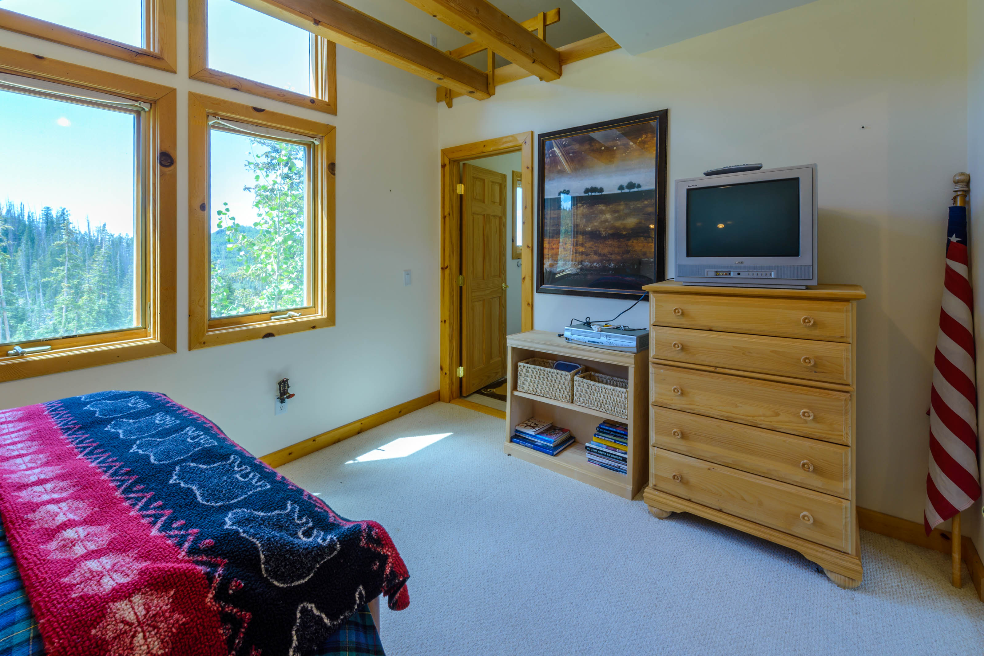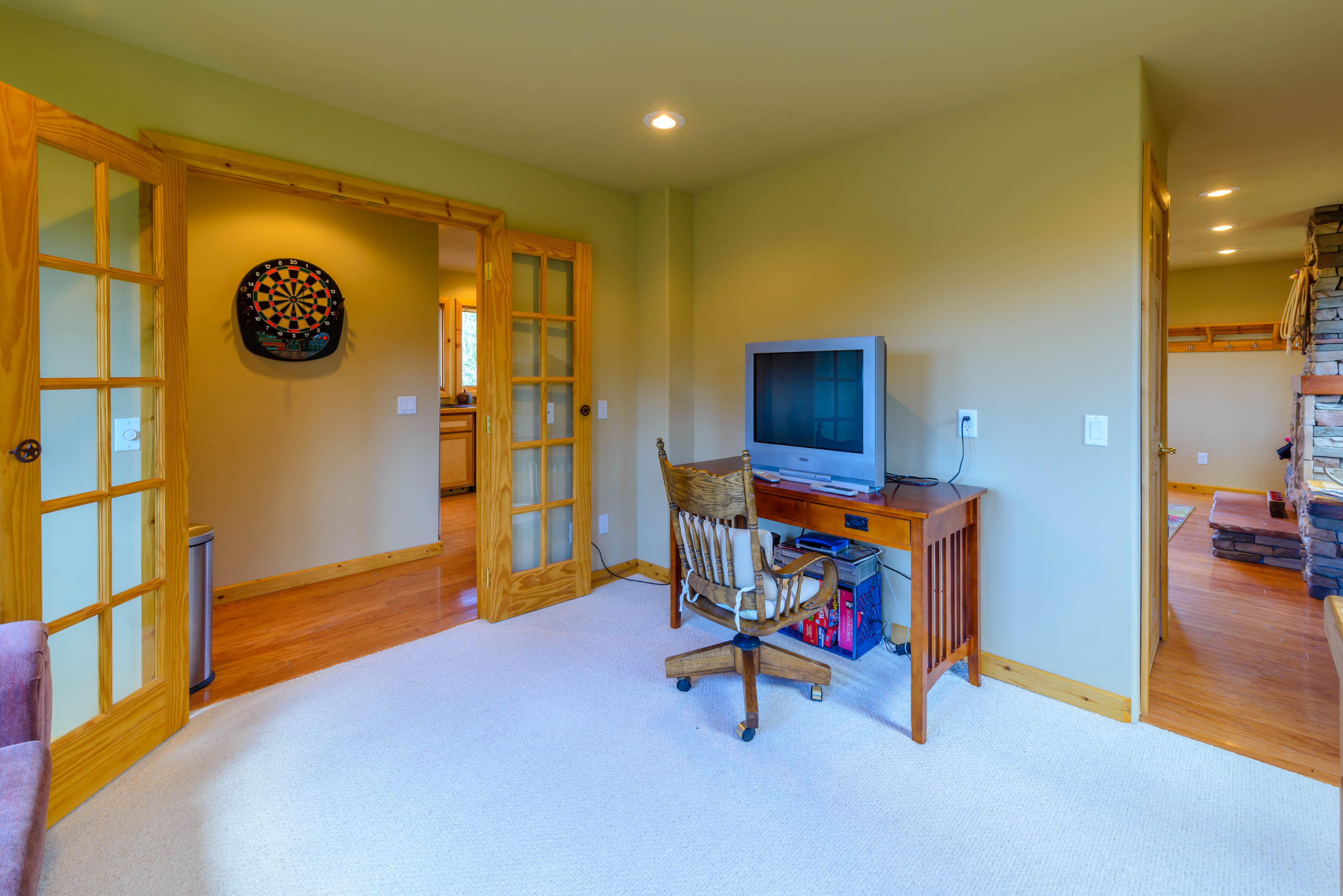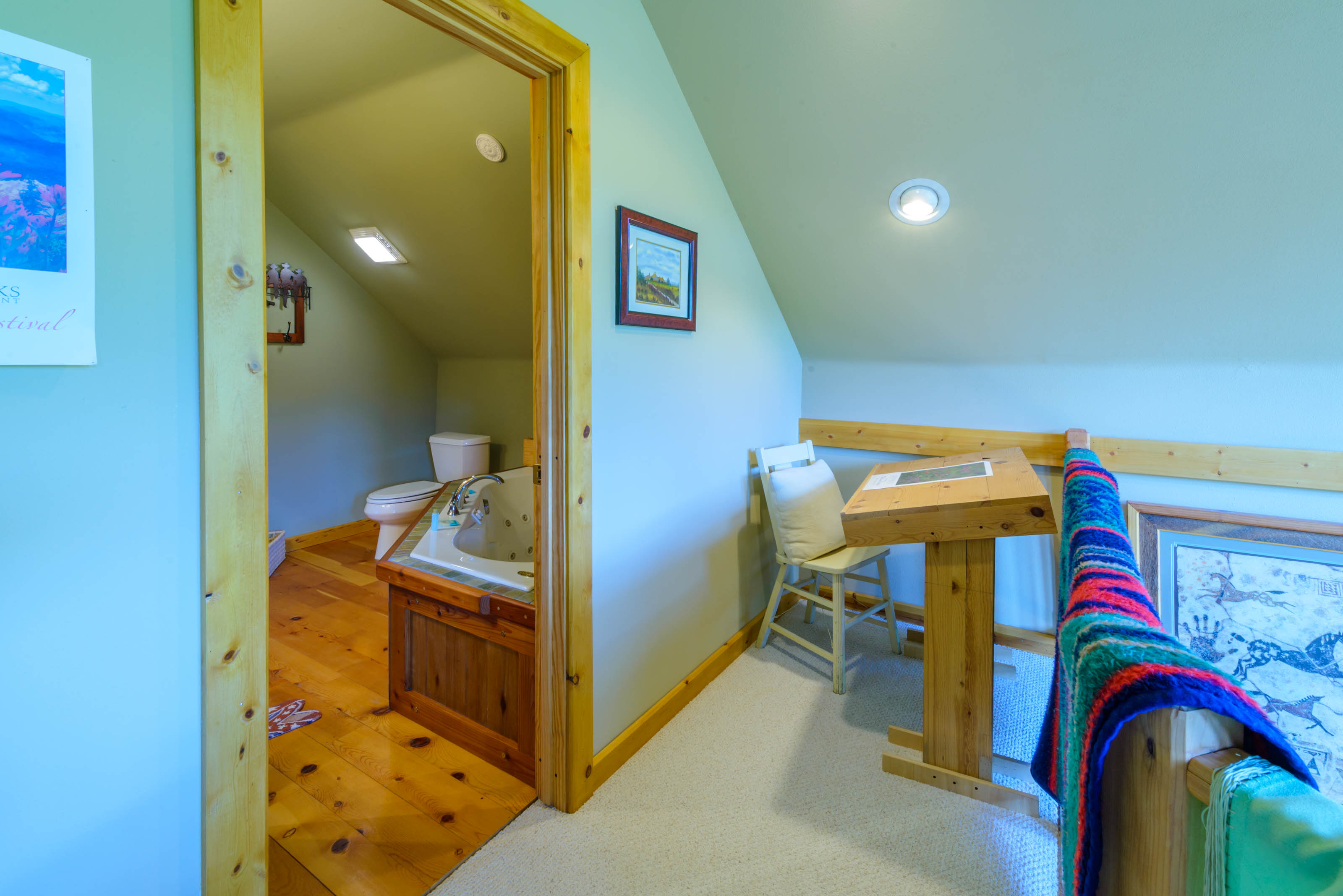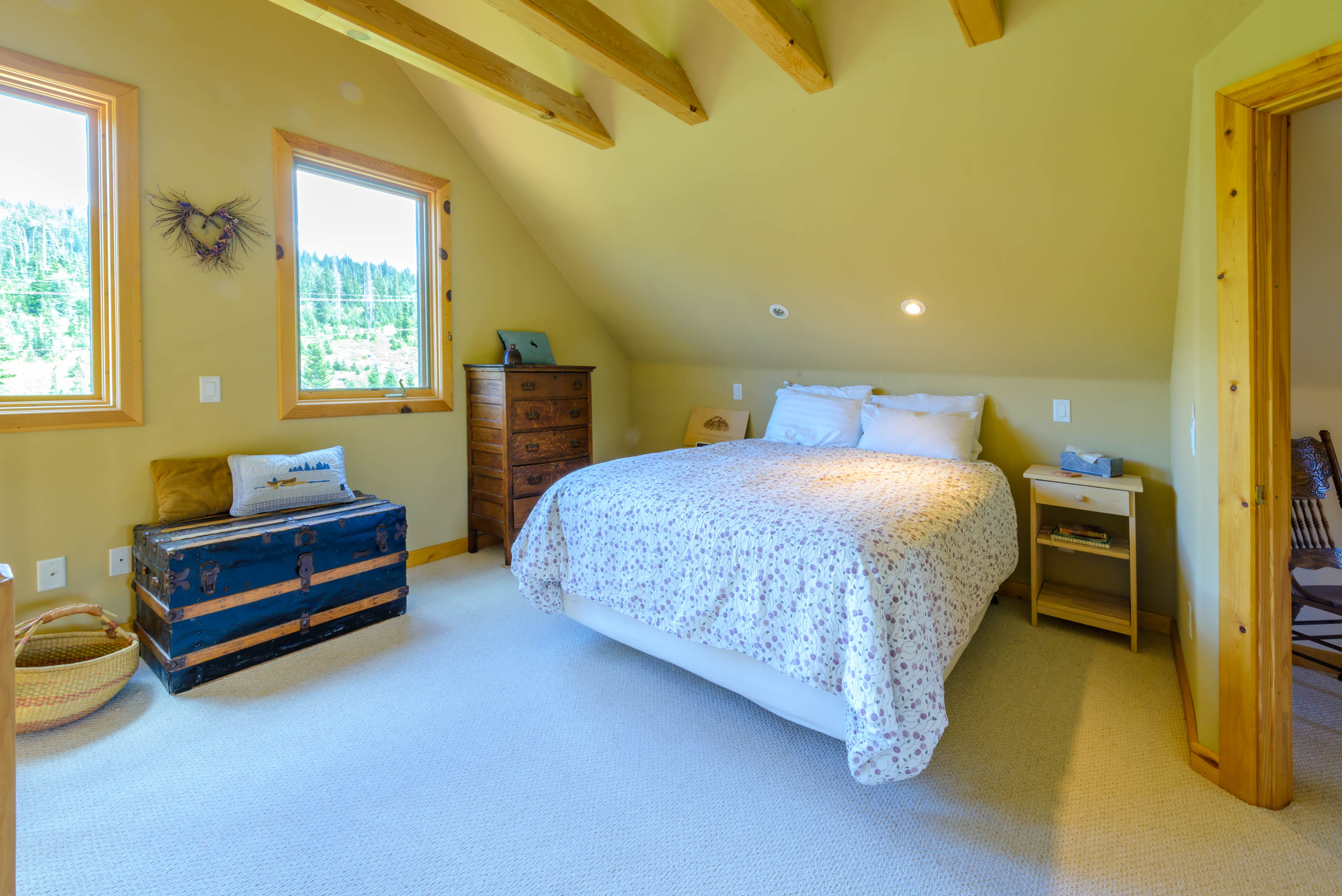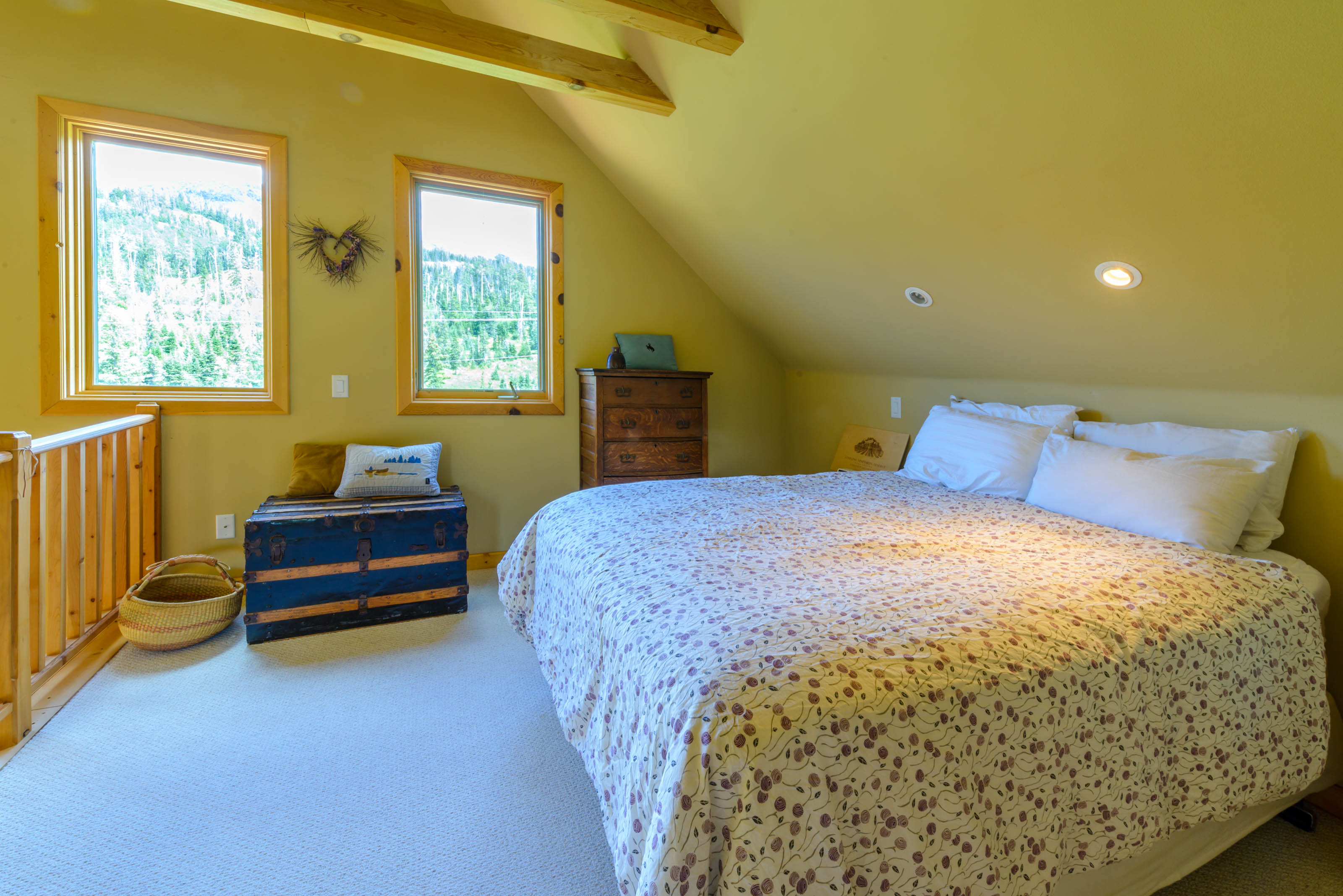 Upstairs, the master bedroom is a beautiful open loft suite with a king bed and ensuite bathroom featuring a soaking tub and separate shower. The second bedroom includes a full-size bed and an attached bathroom. On the main level, an office/family room combo offers a sleeper sofa, providing flexible sleeping arrangements for families or groups. A washer and dryer are located on the basement level for your convenience.