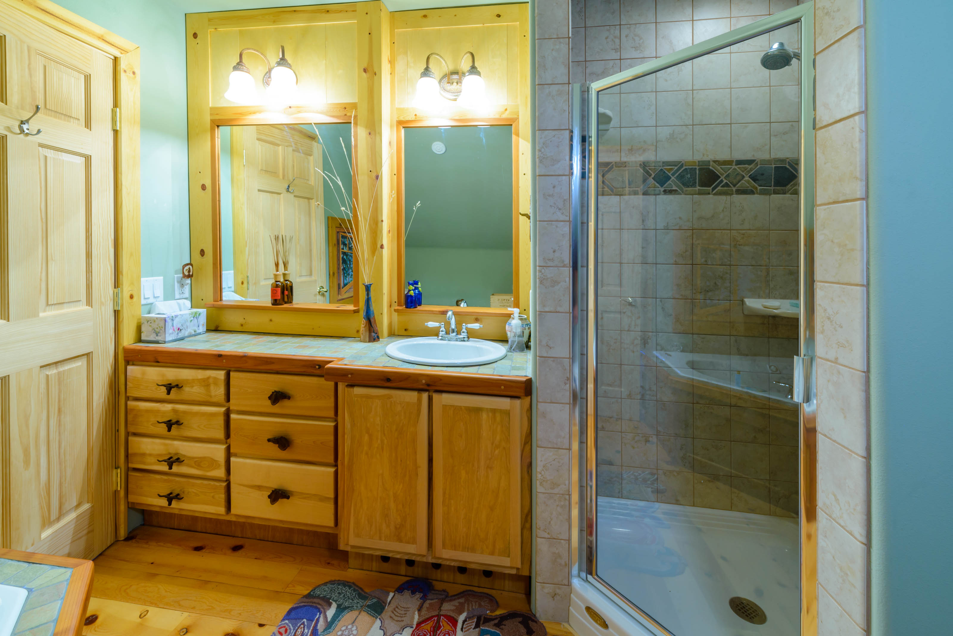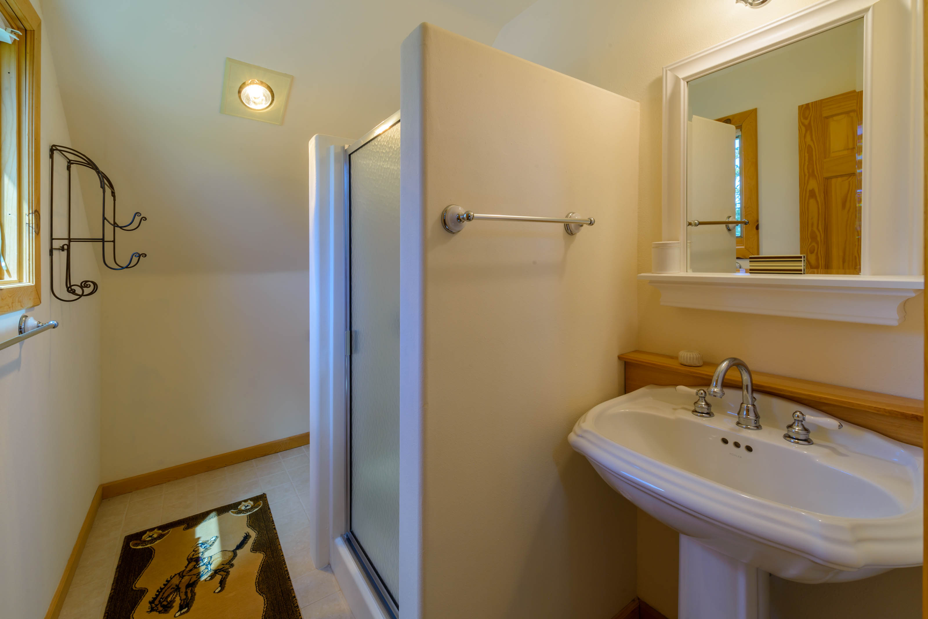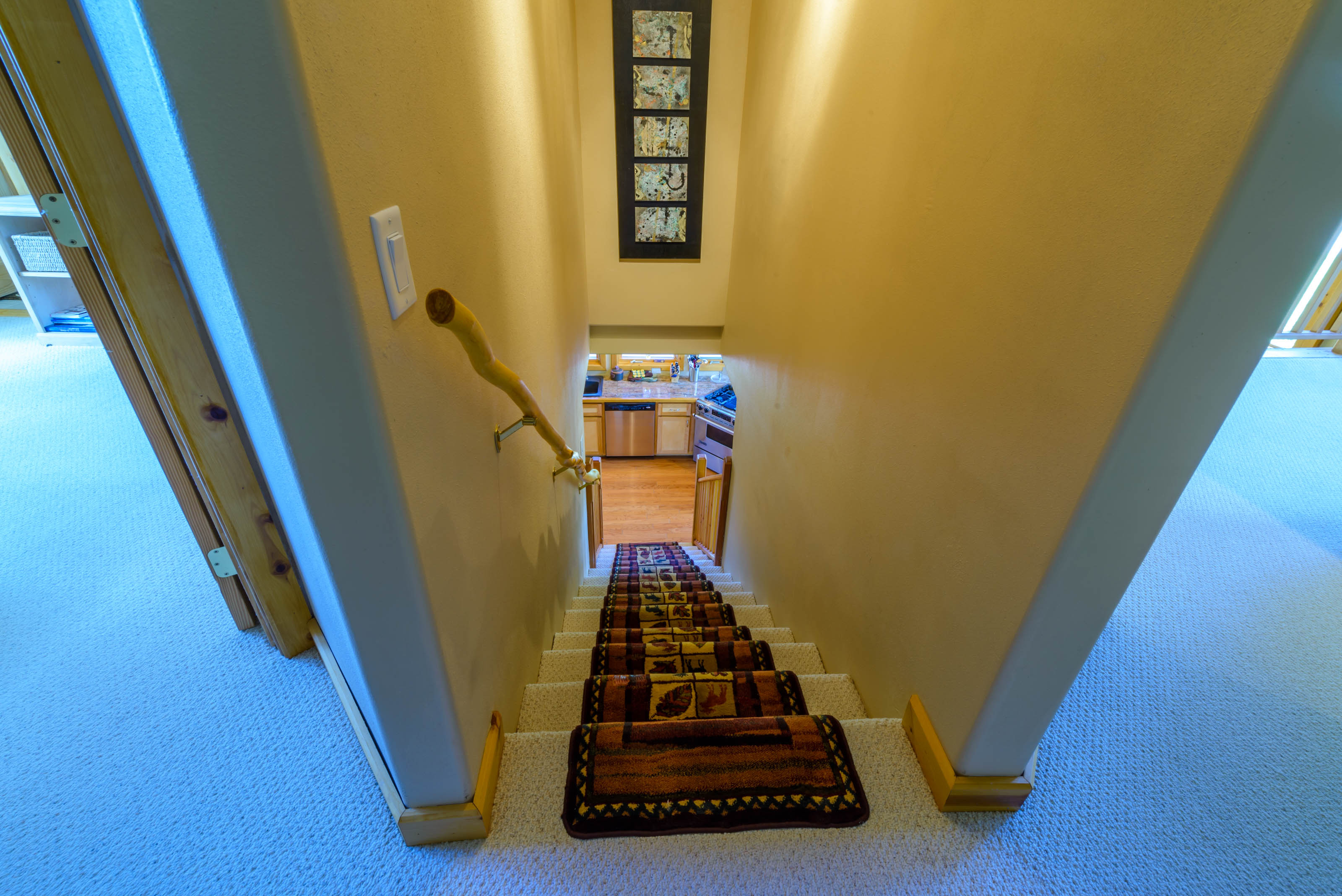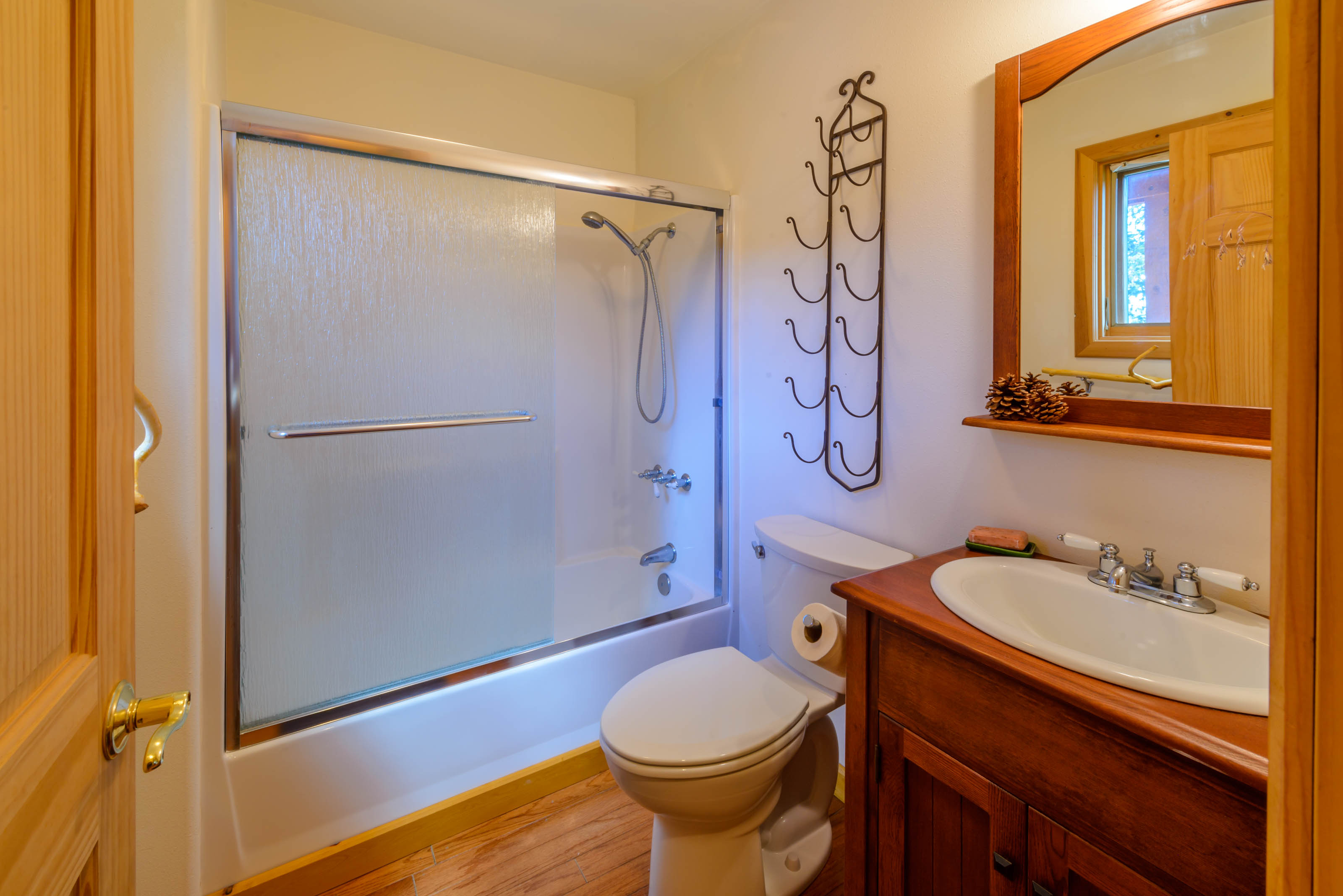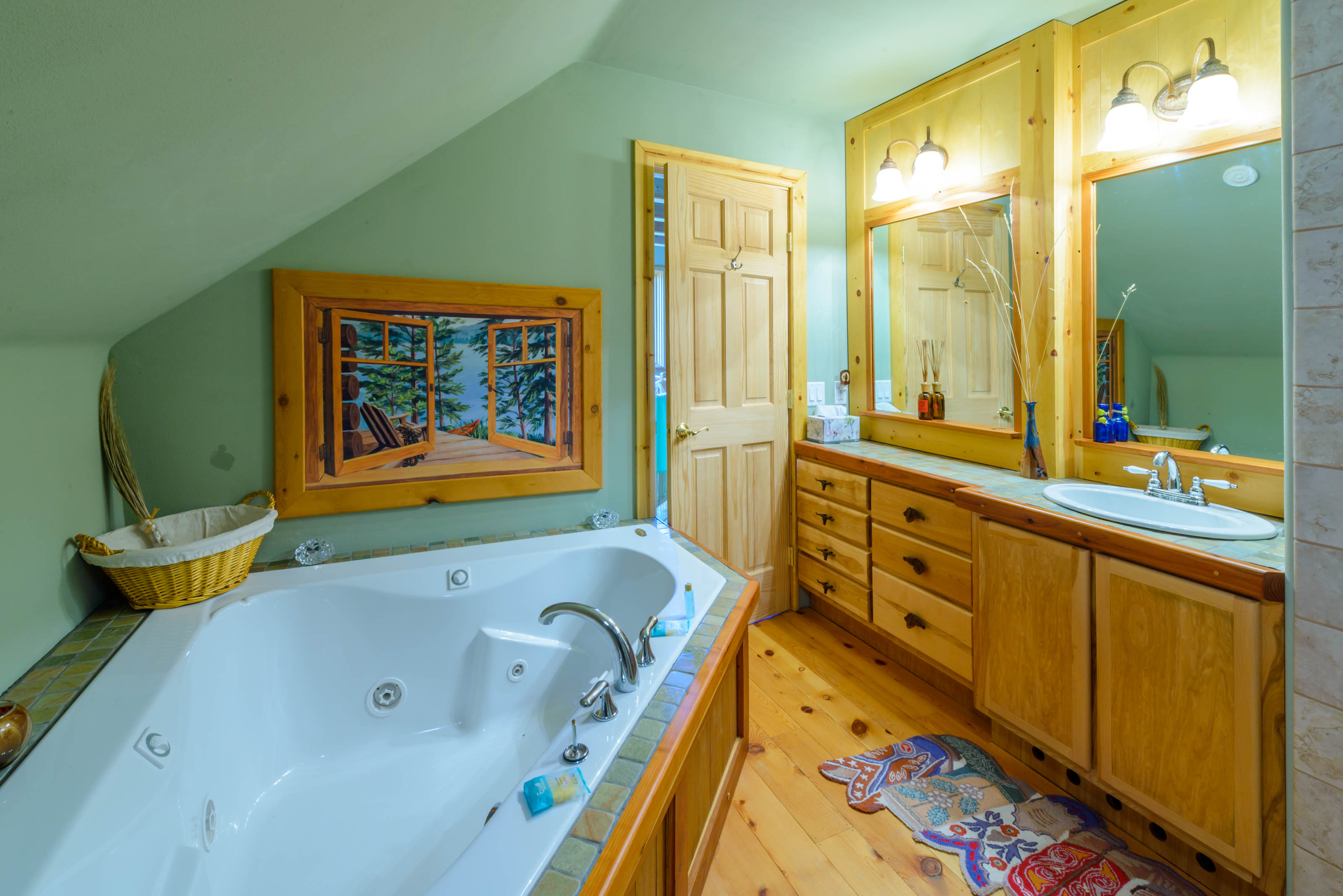 Upstairs, the master bedroom is a beautiful open loft suite with a king bed and ensuite bathroom featuring a soaking tub and separate shower. The second bedroom includes a full-size bed and an attached bathroom. On the main level, an office/family room combo offers a sleeper sofa, providing flexible sleeping arrangements for families or groups. A washer and dryer are located on the basement level for your convenience.