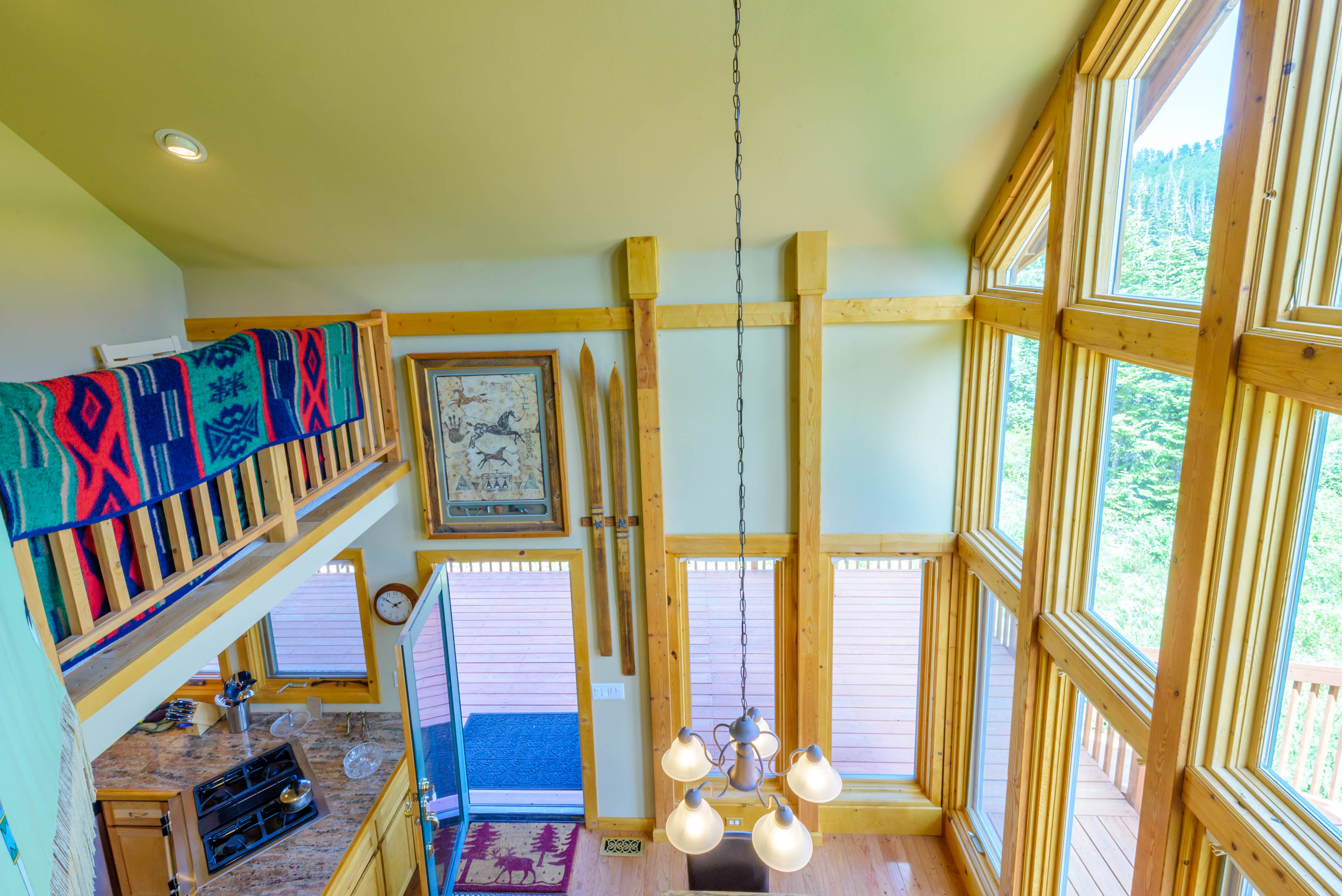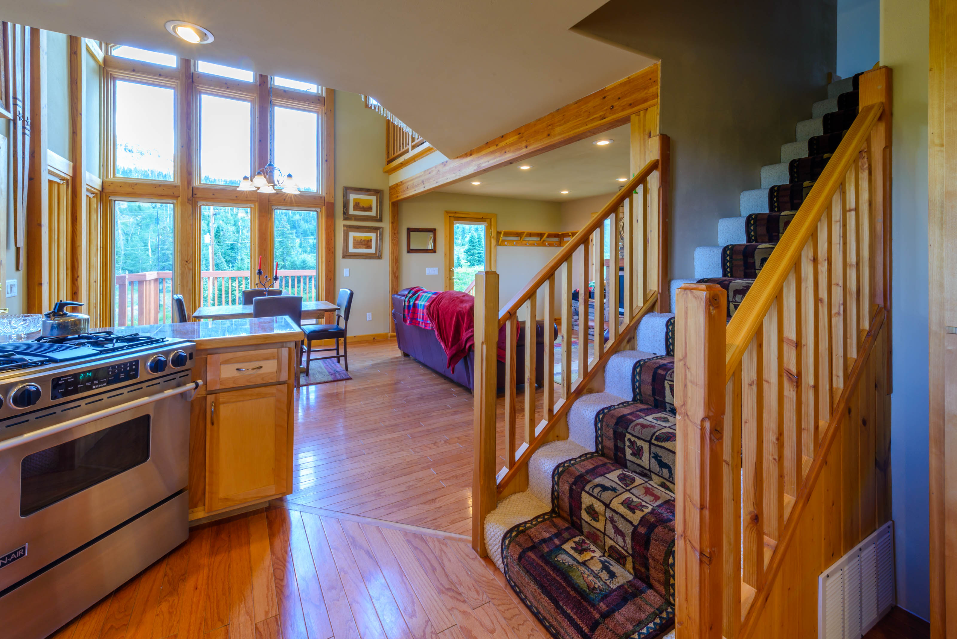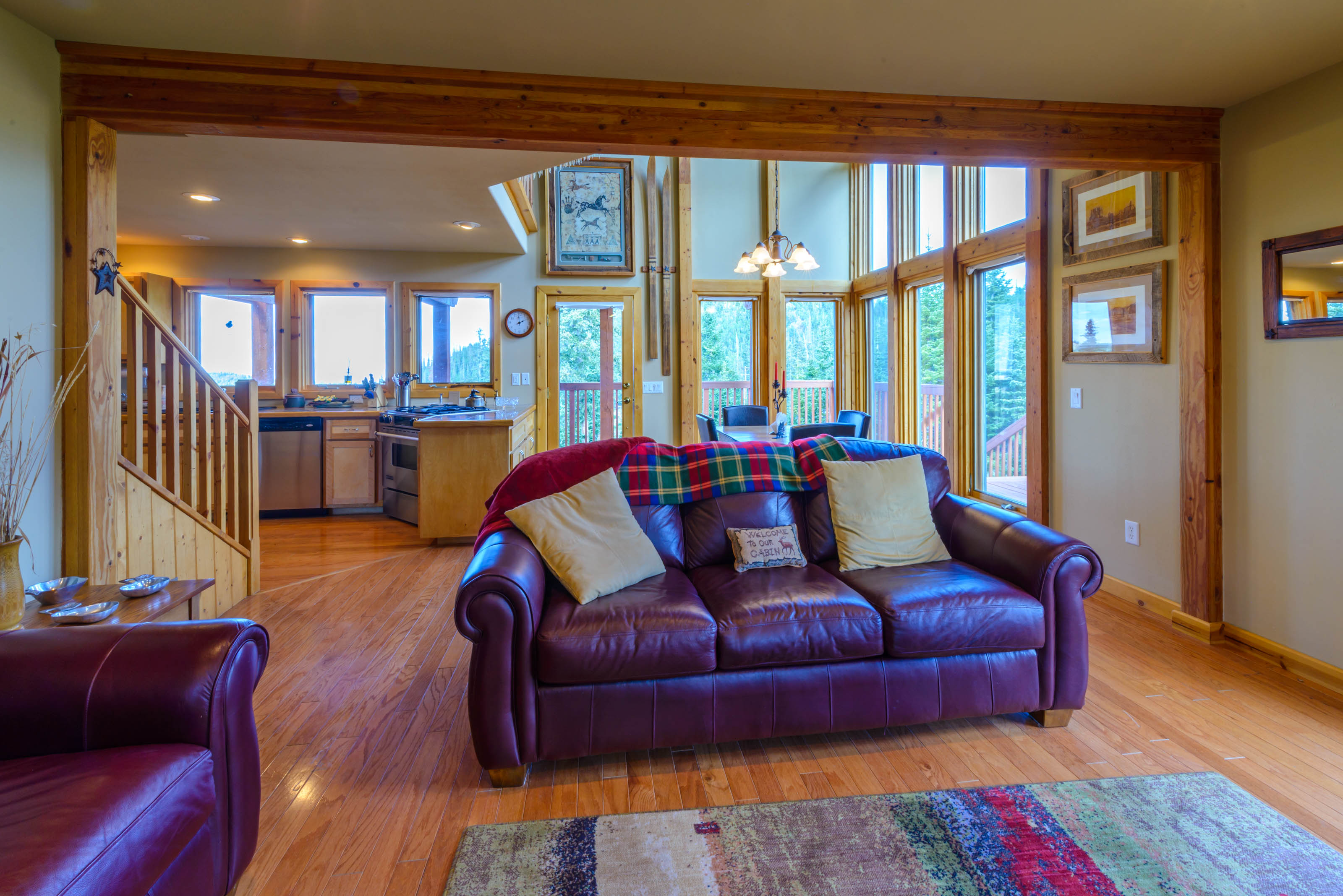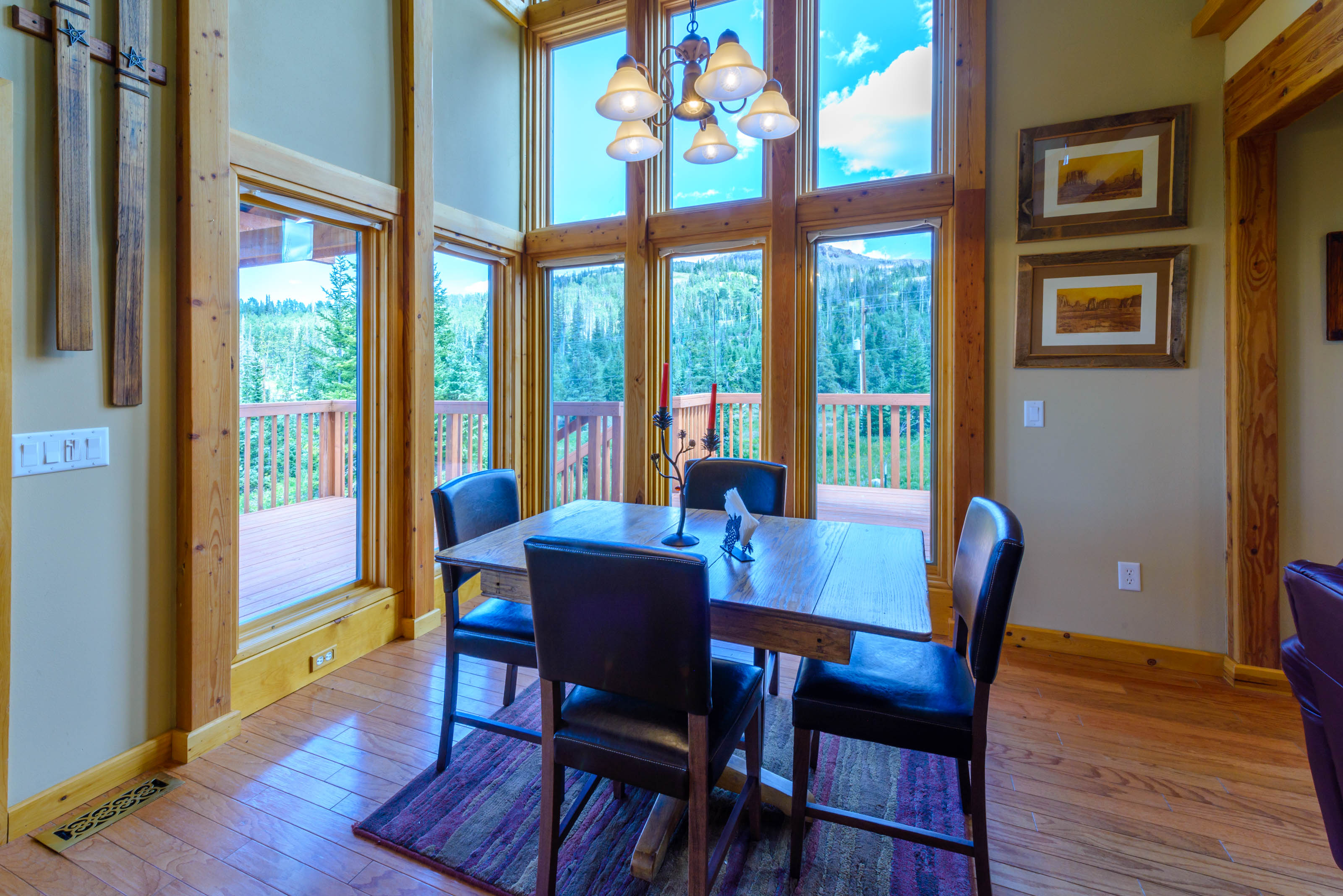 Enjoy meals in the separate dining area, then unwind in the cozy living space that opens onto a covered wrap-around deck with outdoor seating and a gas BBQ, perfect for taking in mountain air and forest views.