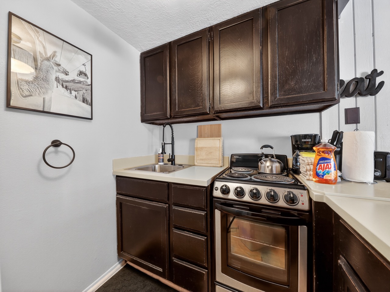 Inside, the condo is warm and welcoming with a wood-burning fireplace, Wi-Fi, and a thoughtfully stocked kitchen featuring a 4-burner stove and oven. This condo is perfect for refueling after a day on the mountain. Sleeping arrangements comfortably accommodate up to six: a queen bed in the private bedroom plus two queen sleeper sofas in the living area.