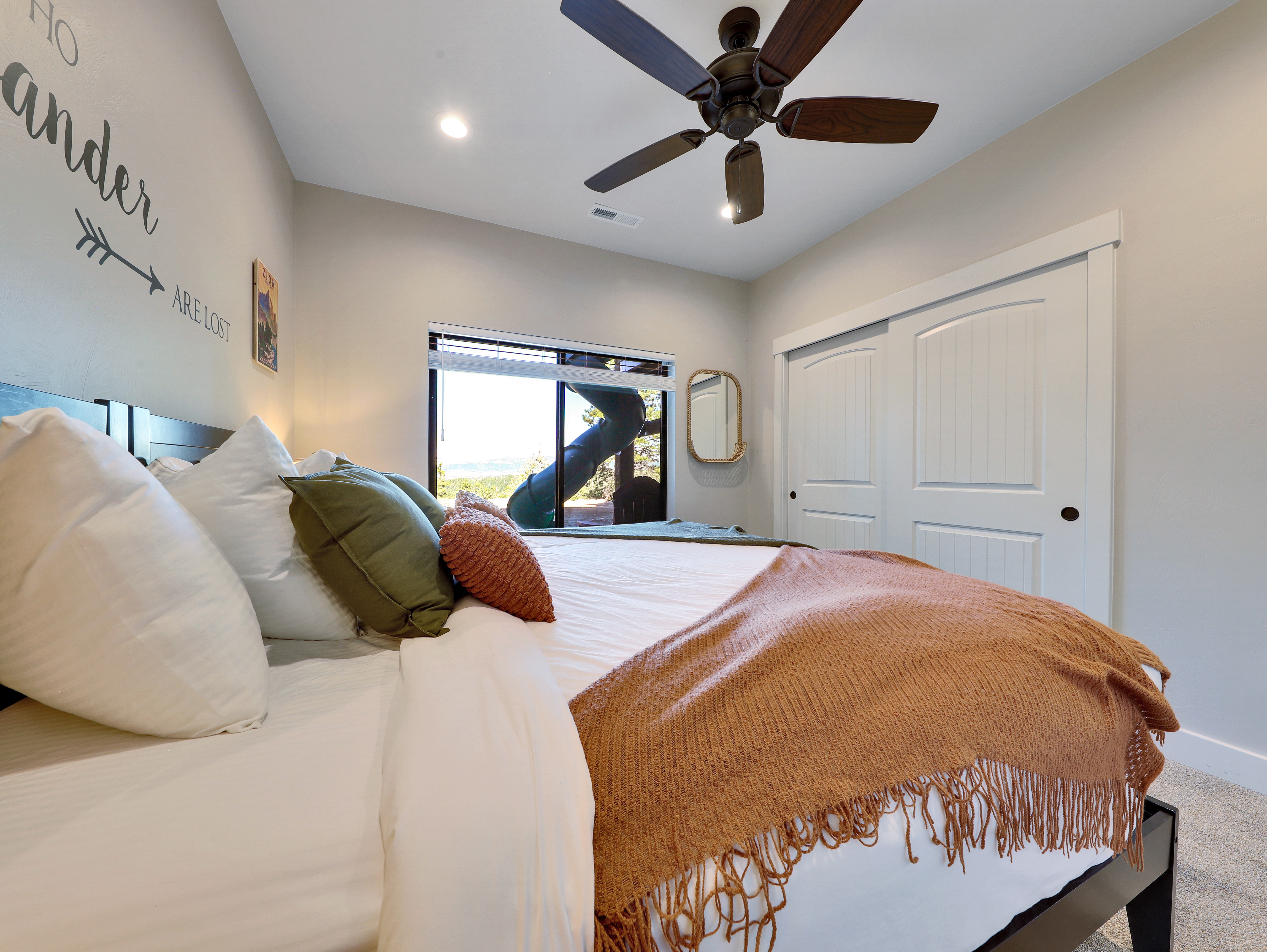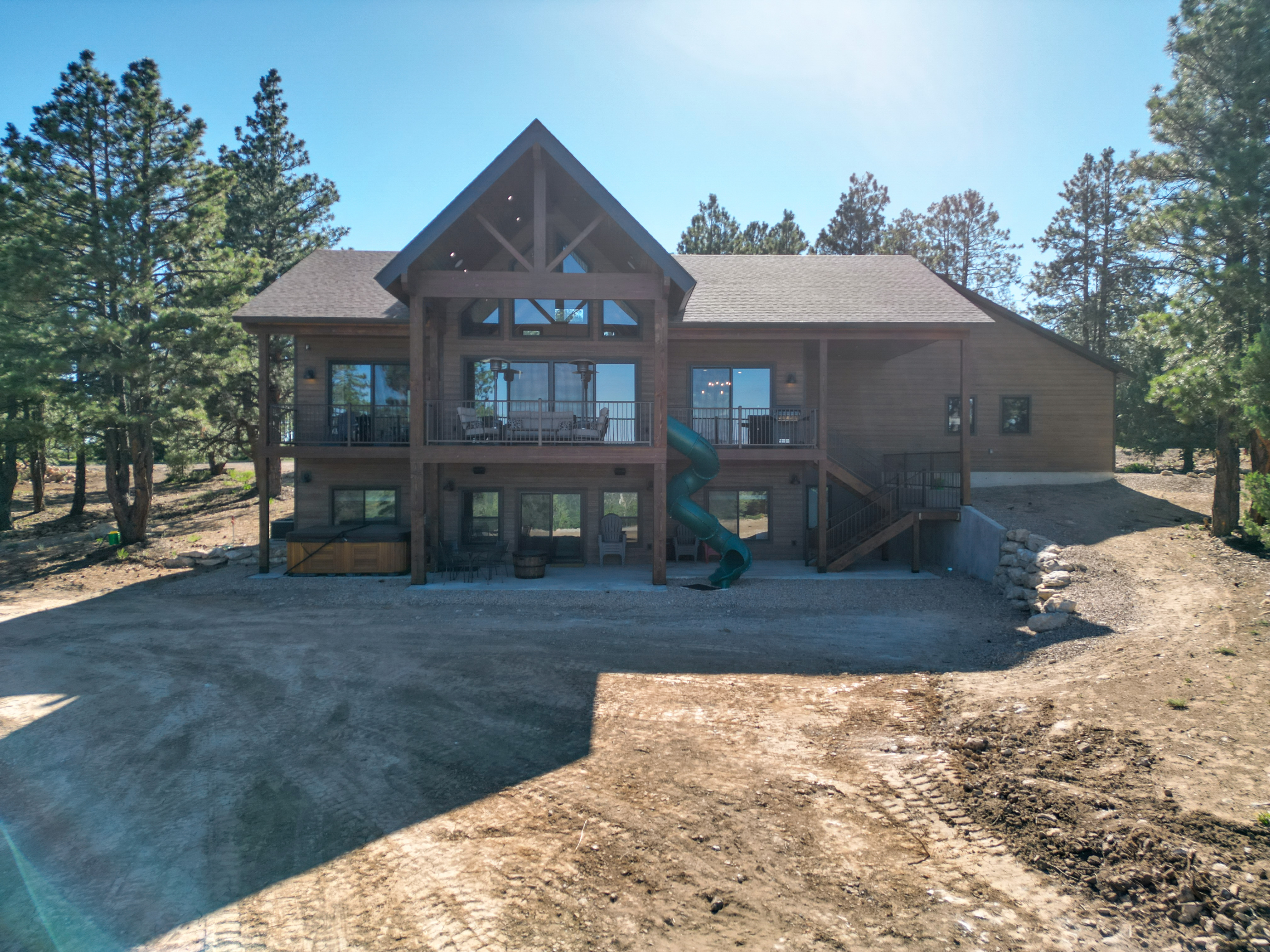 Built for family fun, this cabin sports several fun little extras, including a slide off the back porch and a hammock (available in the warm months), a playroom hidden in the bunk room, a gas fireplace in the great room, a gas fire pit on the lower patio and a wood fire pit in the backyard (must sign firepit agreement before use). If you somehow have more guests than beds, an RV pad with full hookups is convenient to the garage.