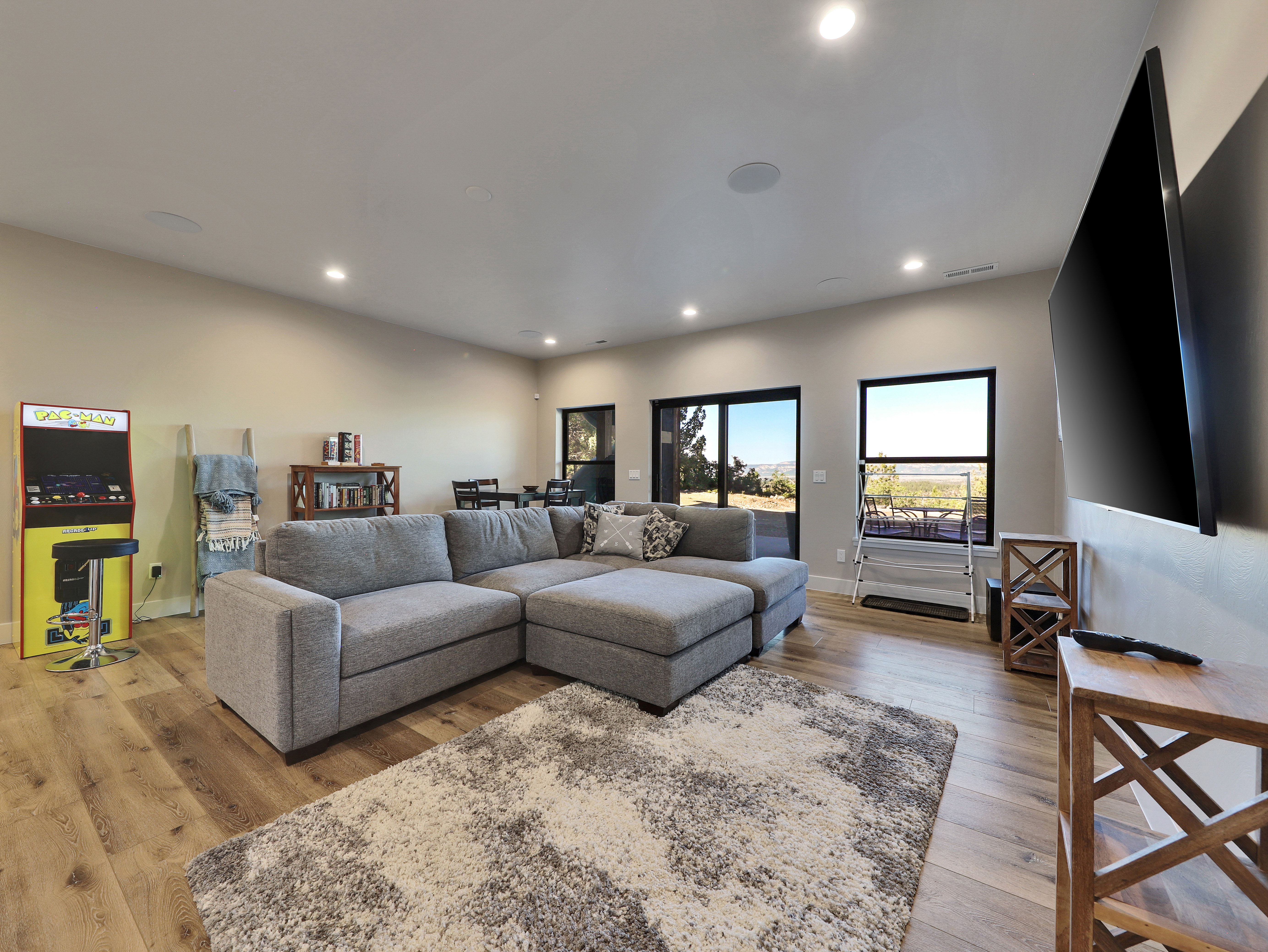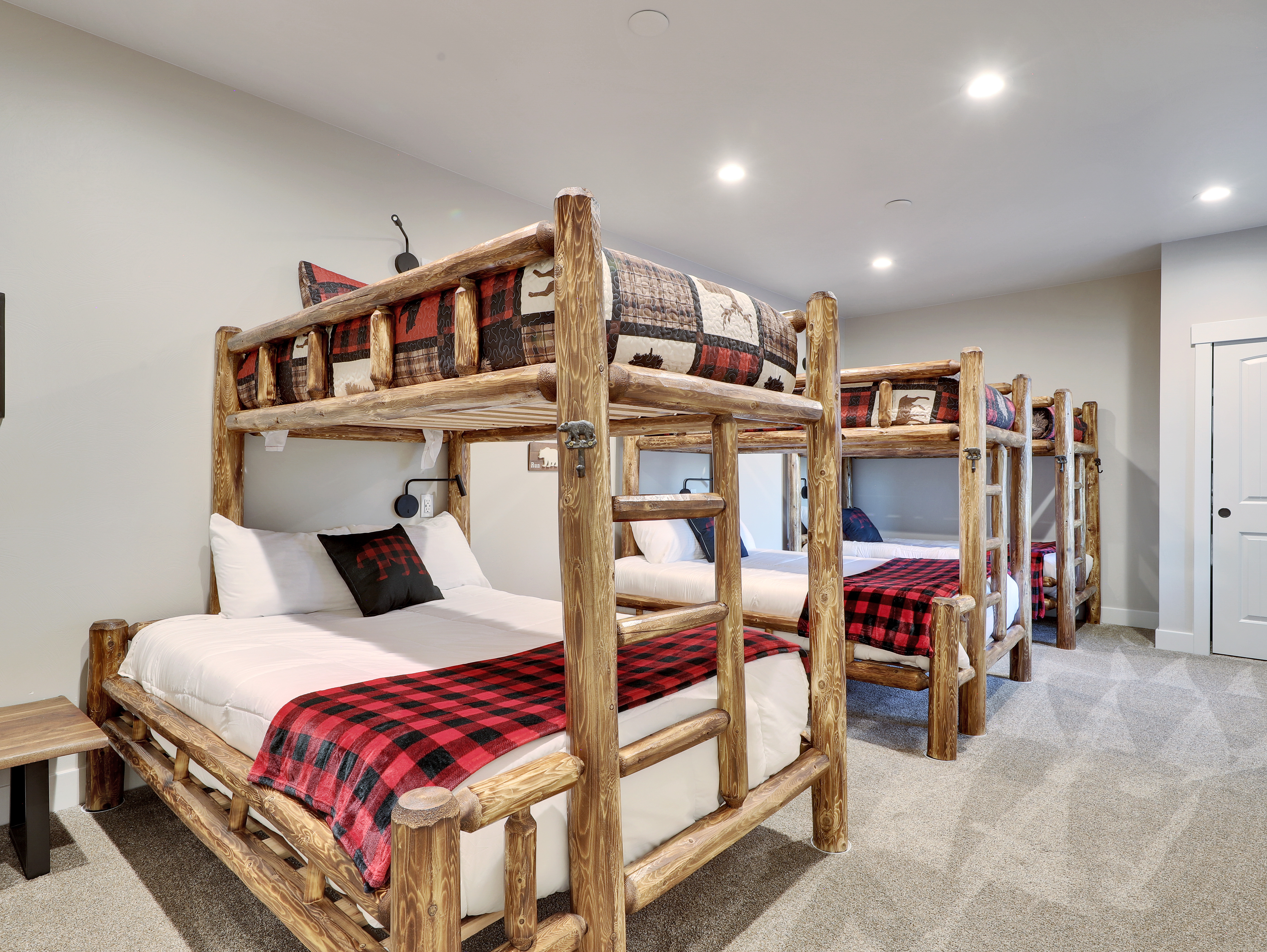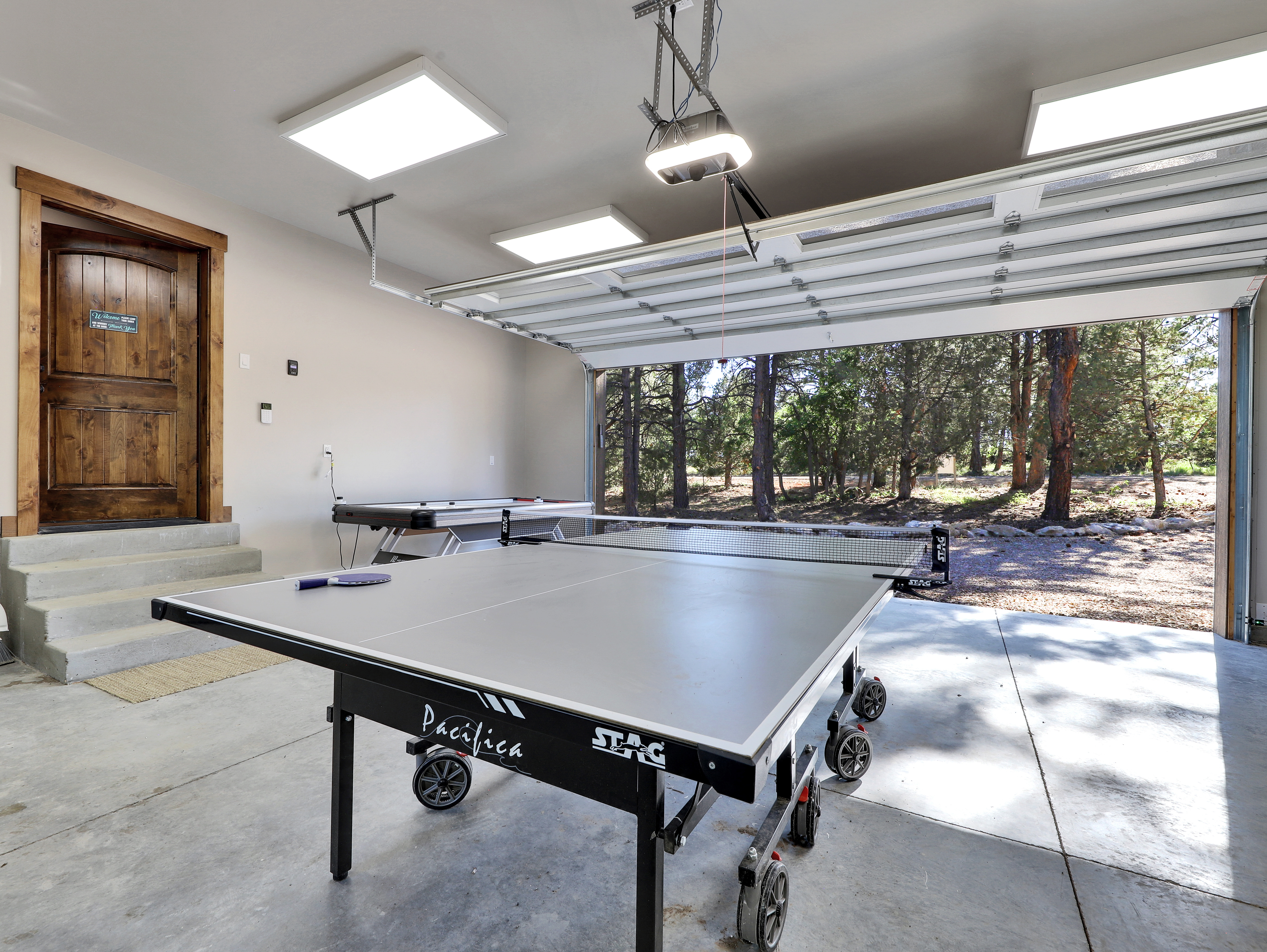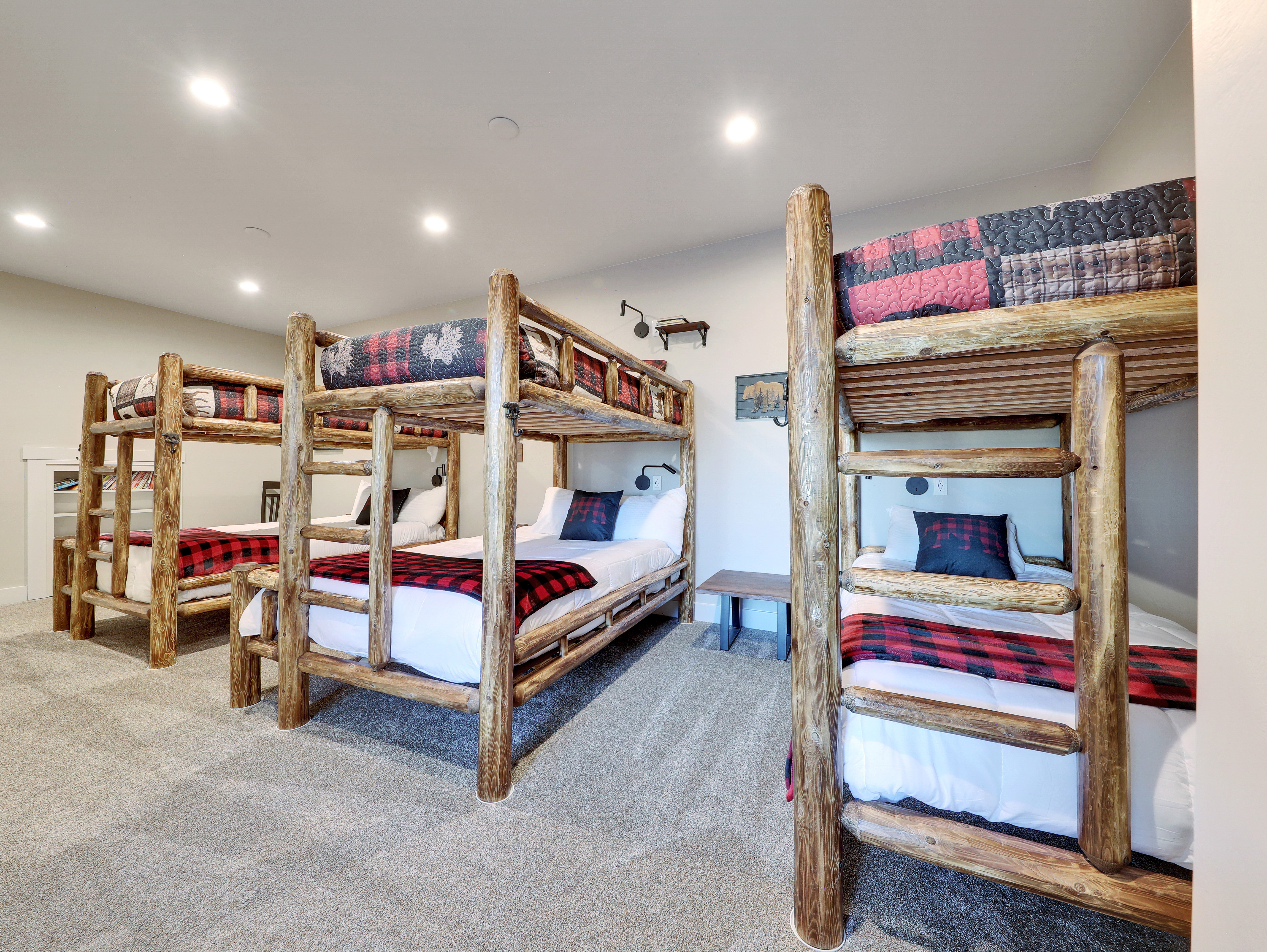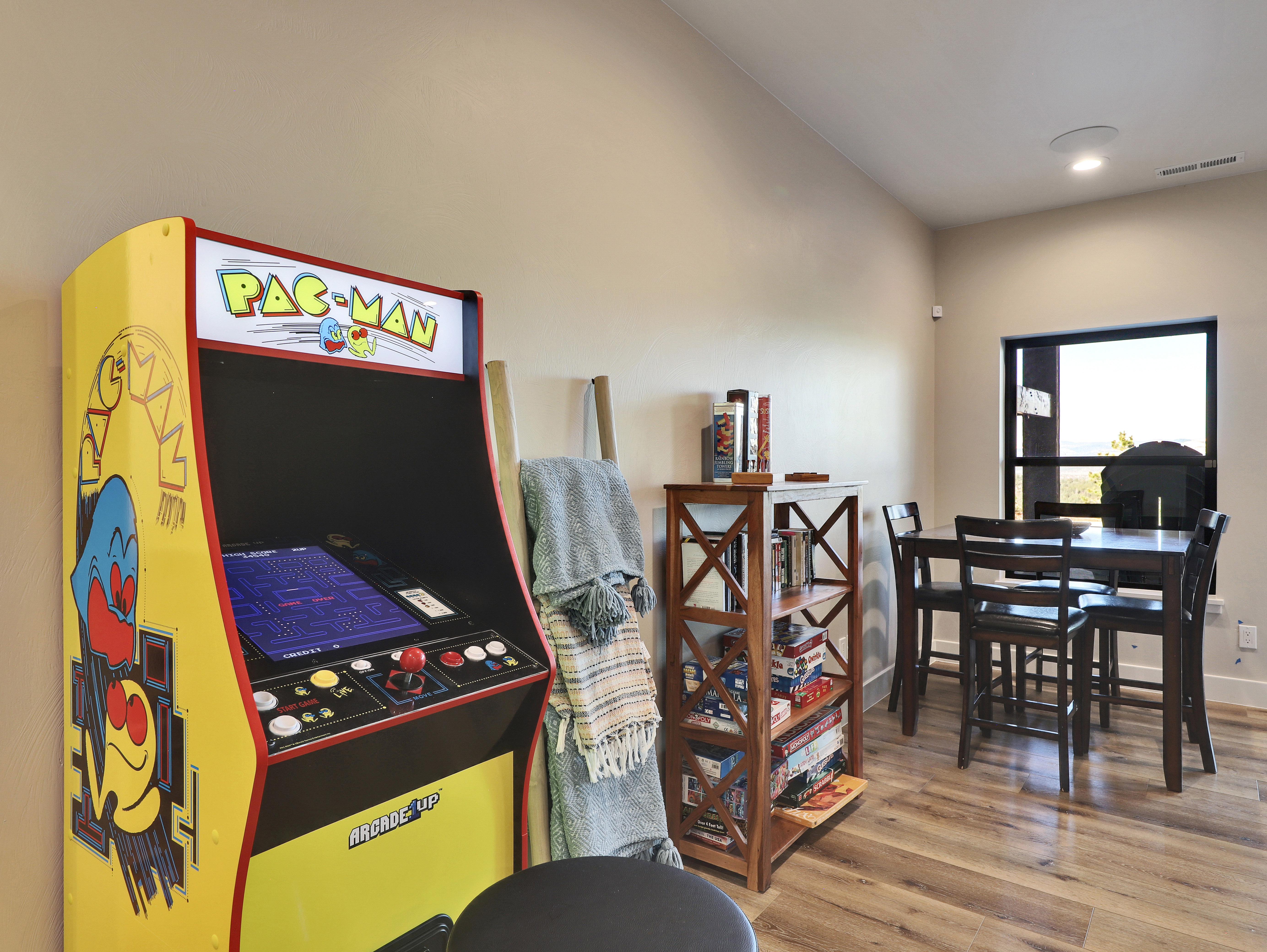 The cabin is well-stocked with board games, a retro arcade-style video game cabinet, ping pong and air hockey tables, and a generous selection of books.