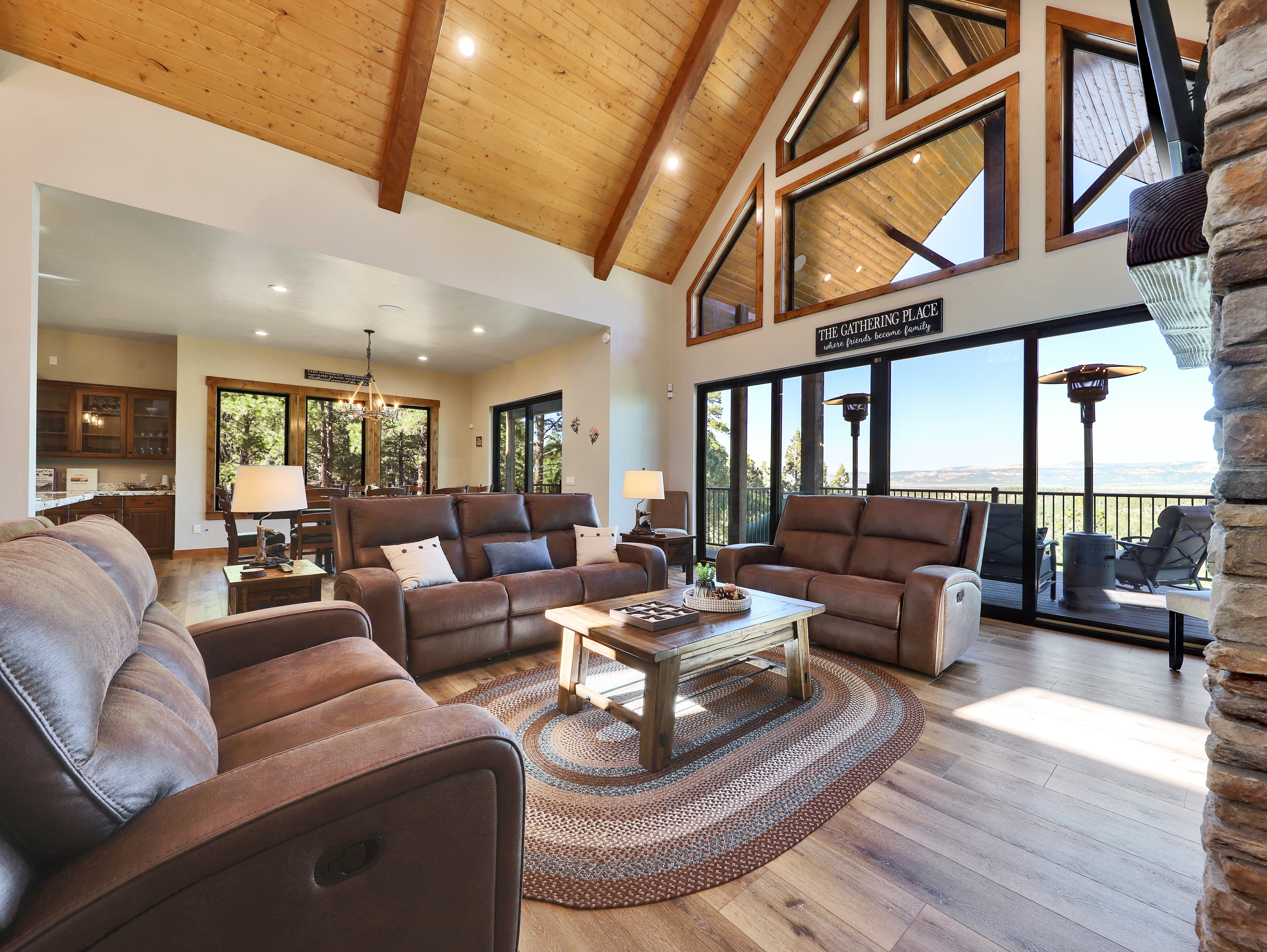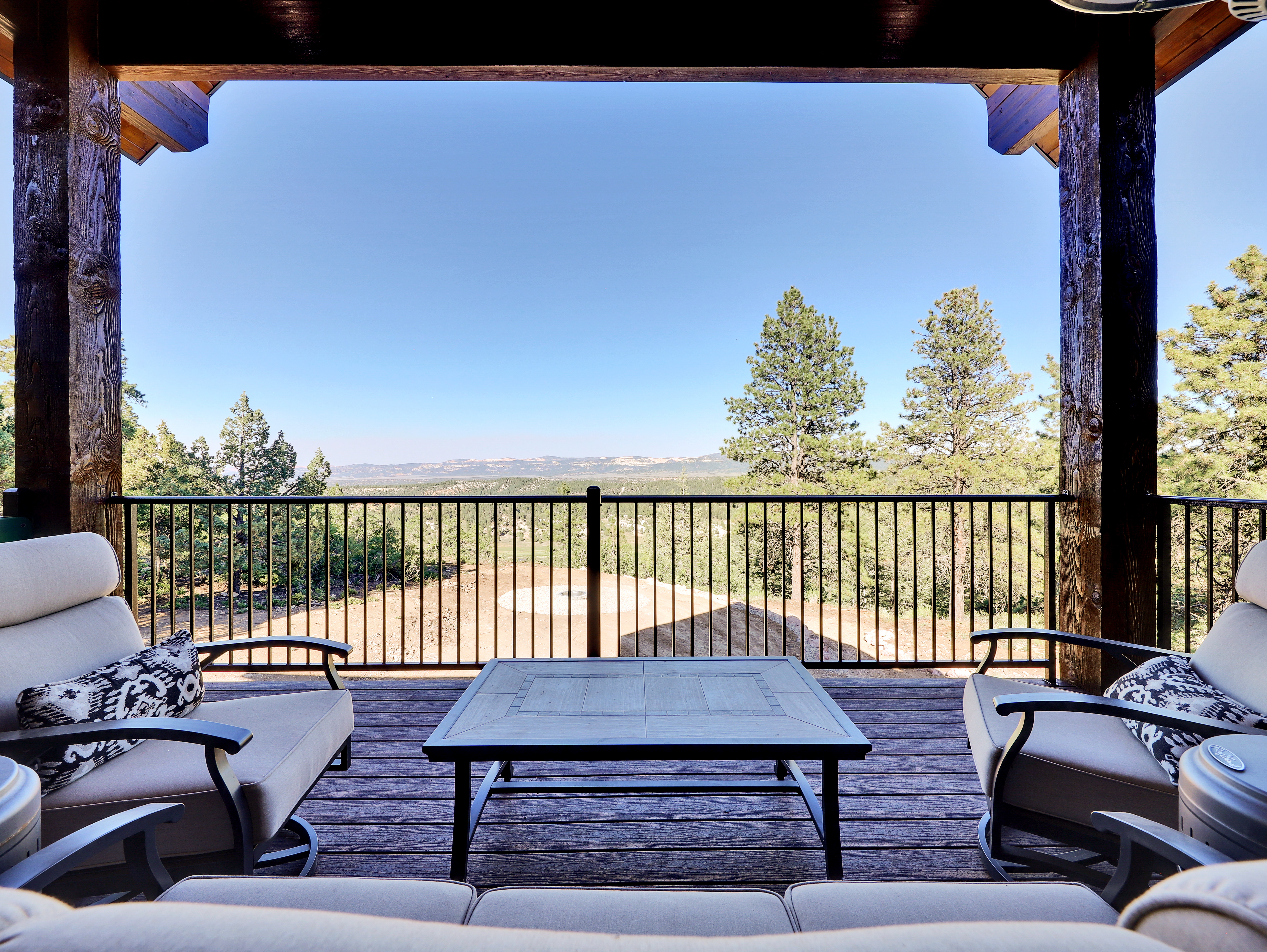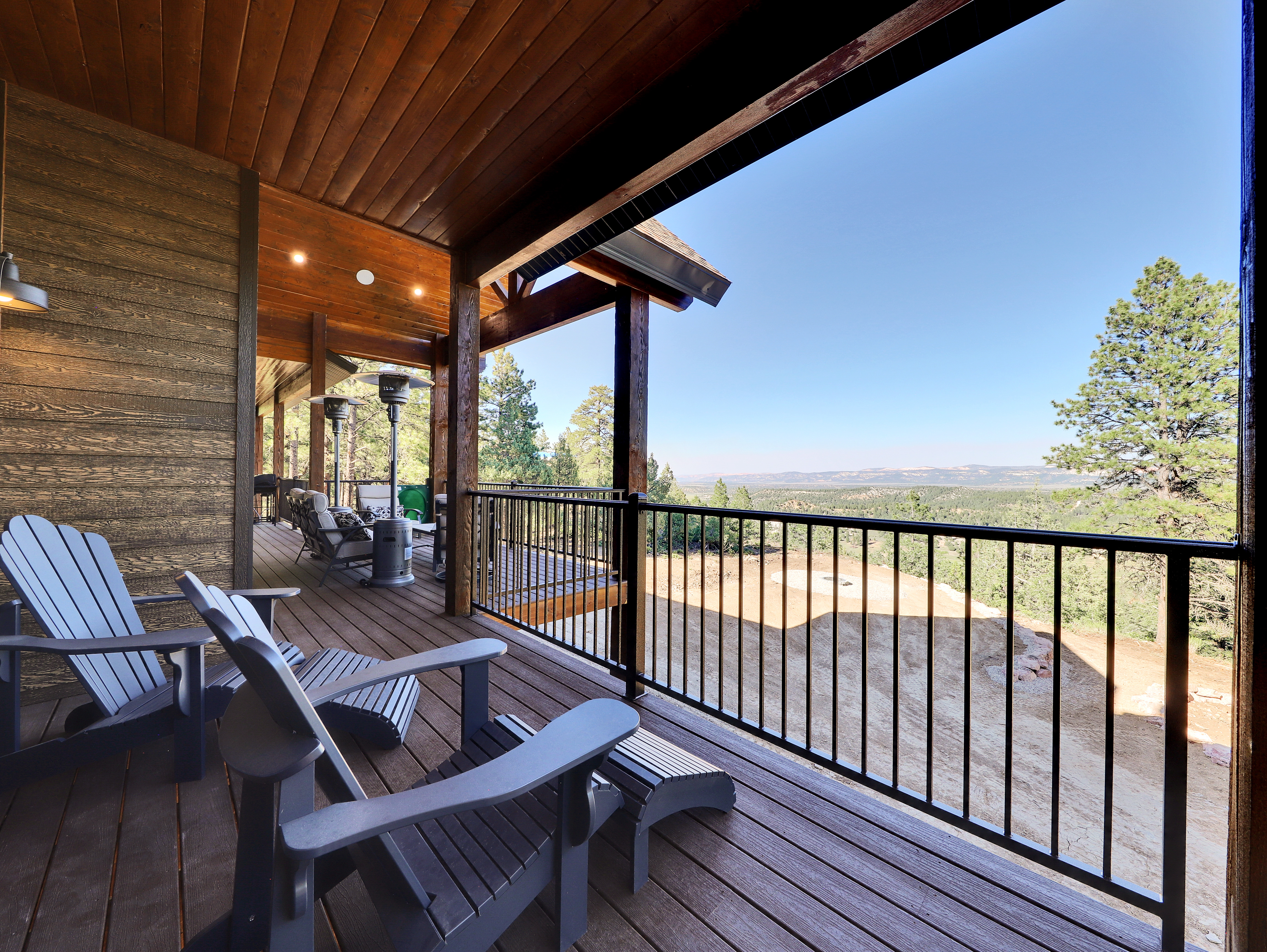 The property features an amazing view off the back deck, including an oversized hot tub on the patio (situated perfectly for stargazing) and comfortable outdoor seating for the whole family.