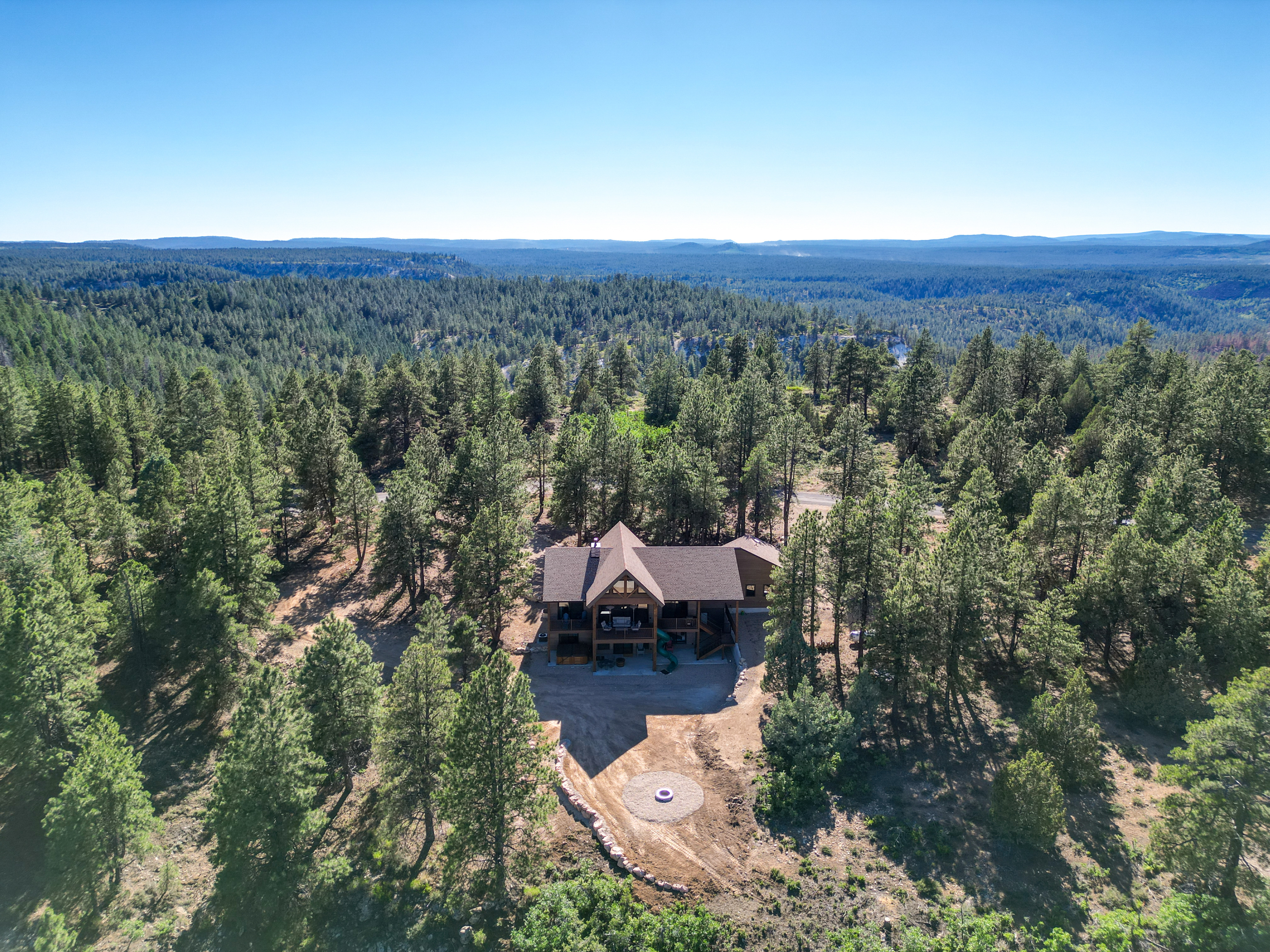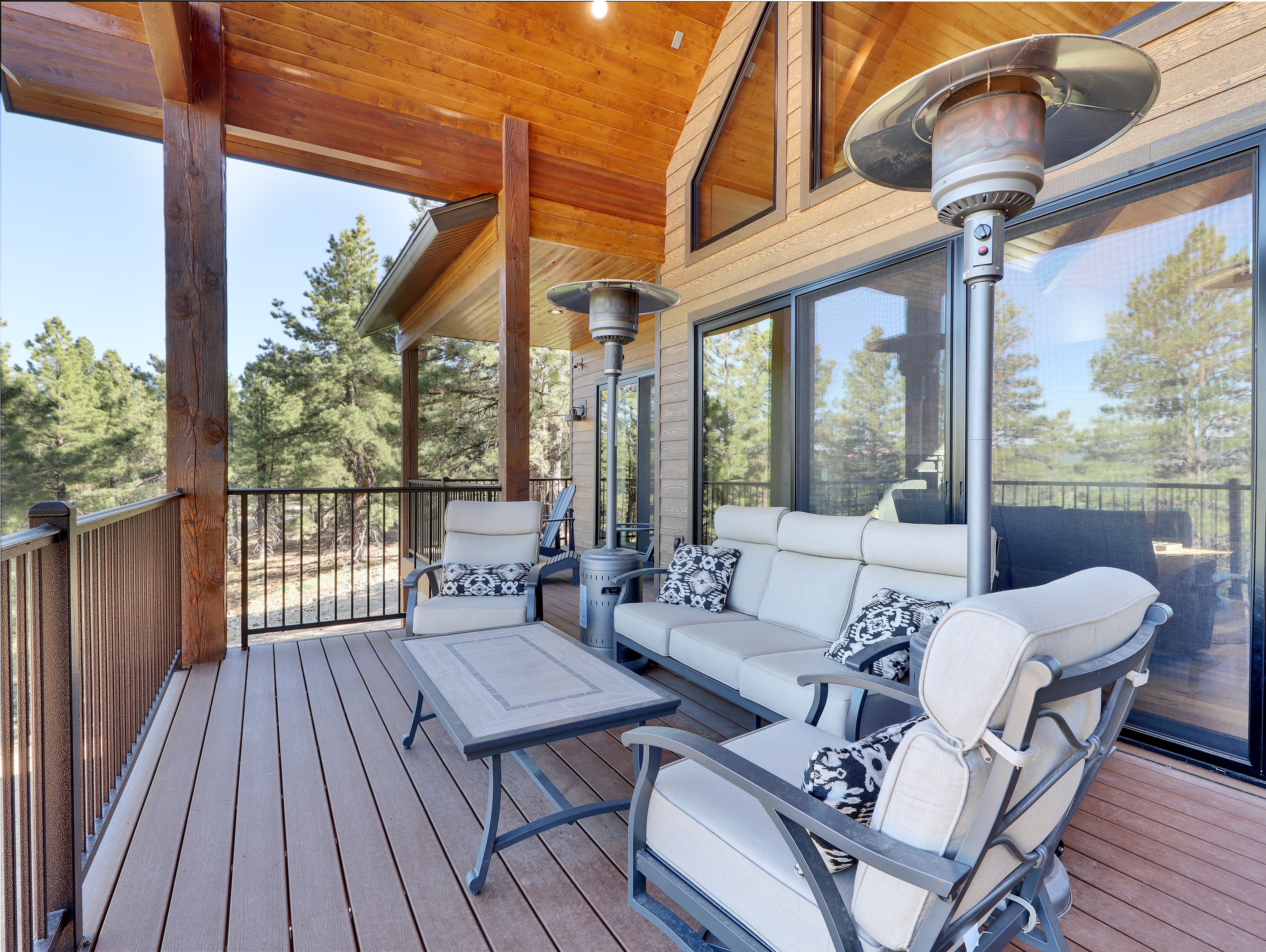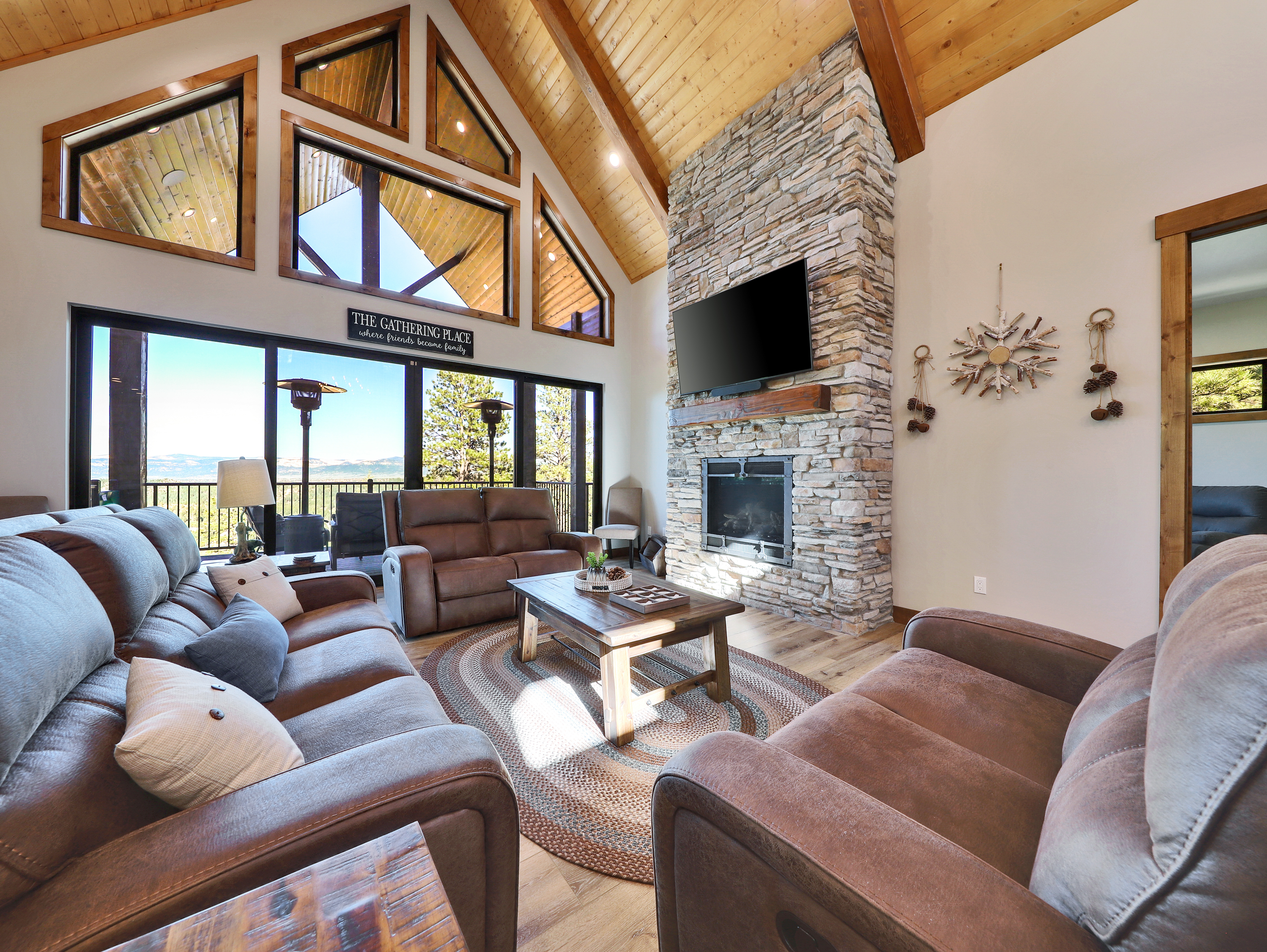 The property features an amazing view off the back deck, including an oversized hot tub on the patio (situated perfectly for stargazing) and comfortable outdoor seating for the whole family.