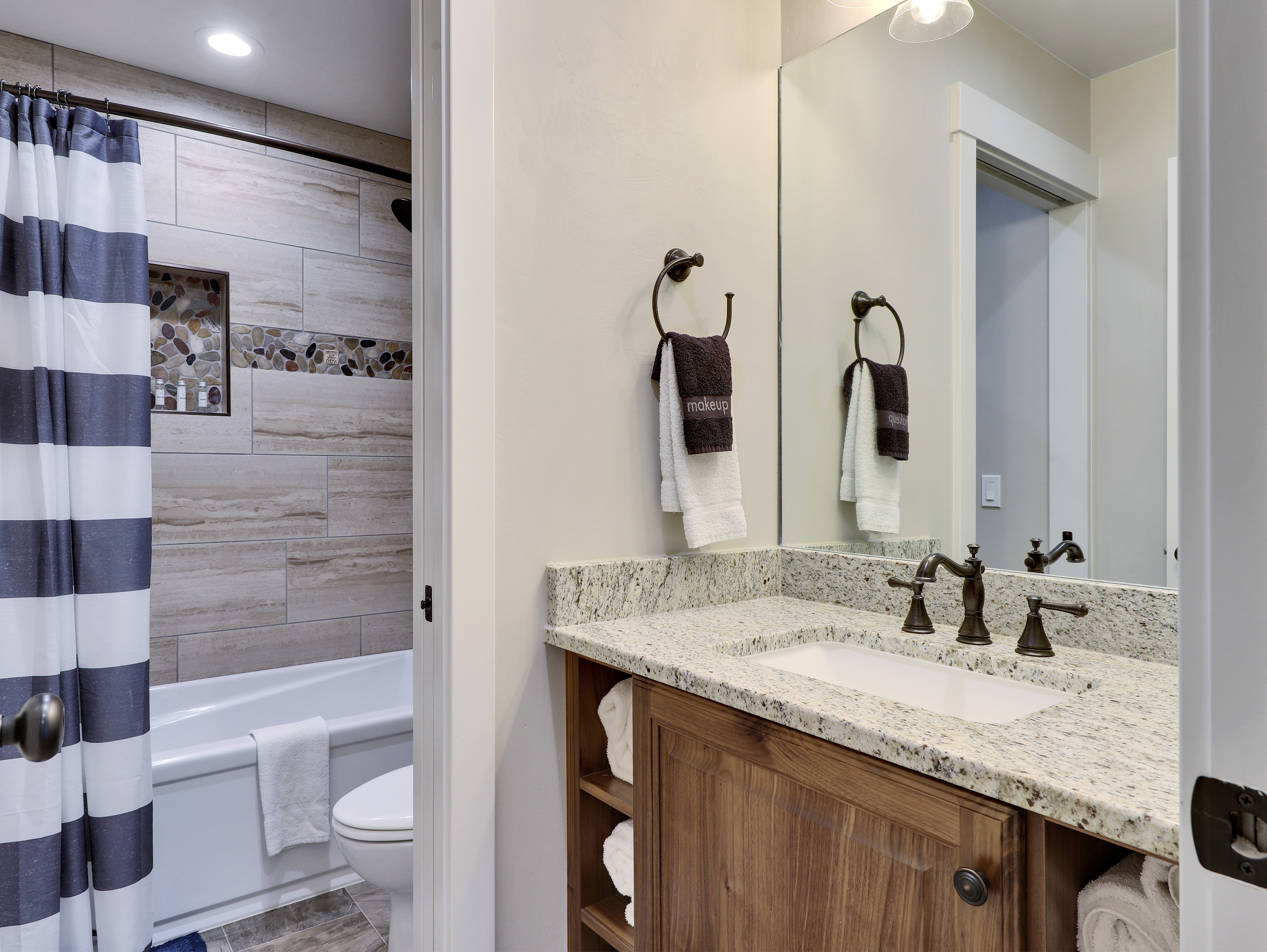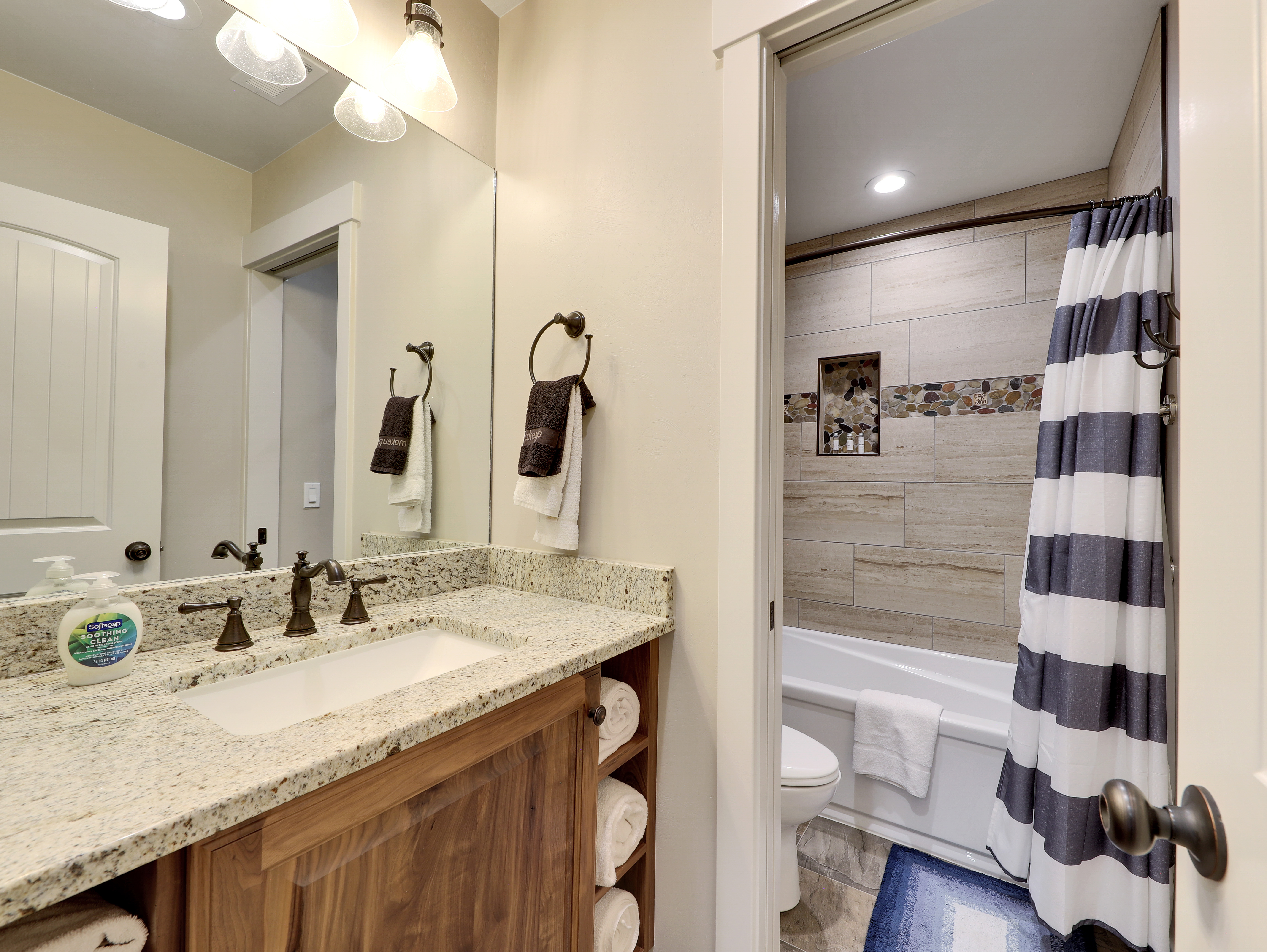 While restaurants are convenient, home is much closer. The spacious kitchen is fully equipped with modern appliances. Dining spaces easily accommodate large gatherings, with dishes and comfortable seating for up to 12 (though that is by no means a hard limit). Also available is an outdoor barbecue grill and alfresco seating on the large back deck.