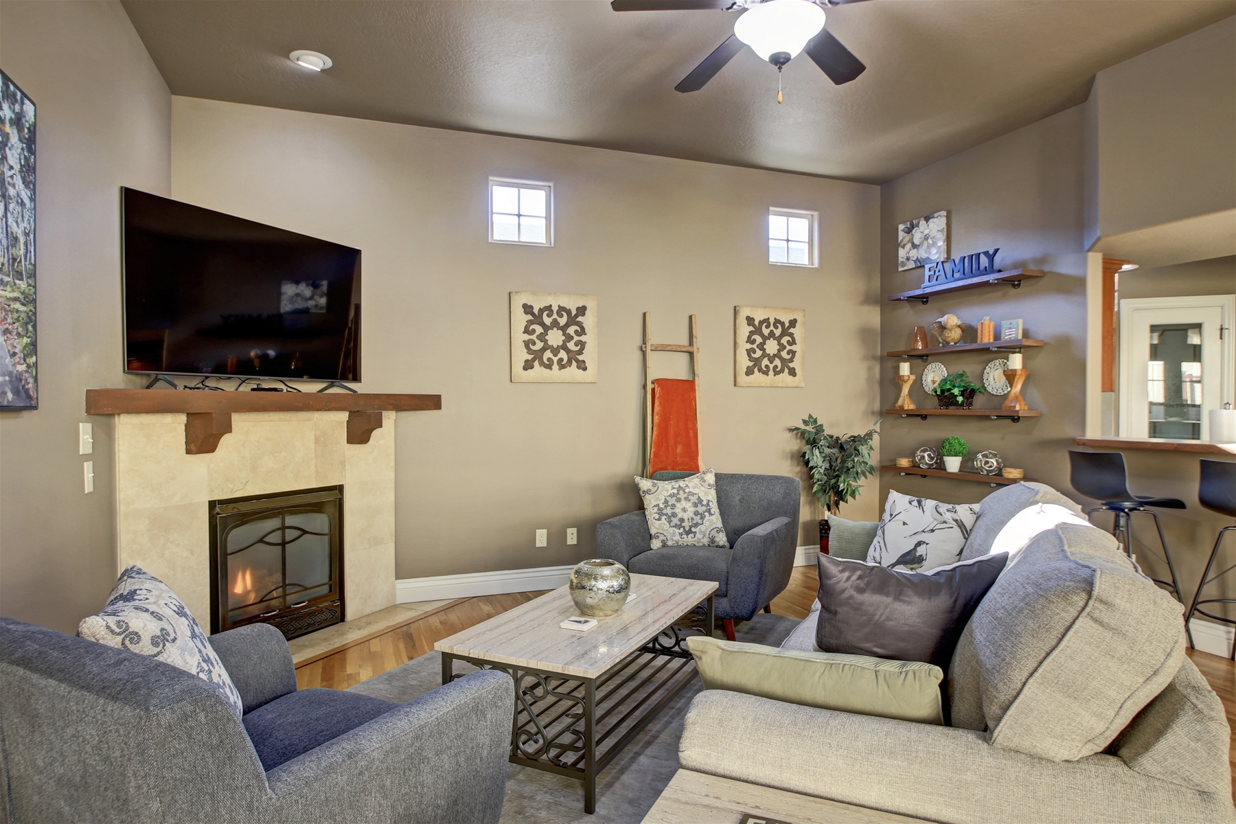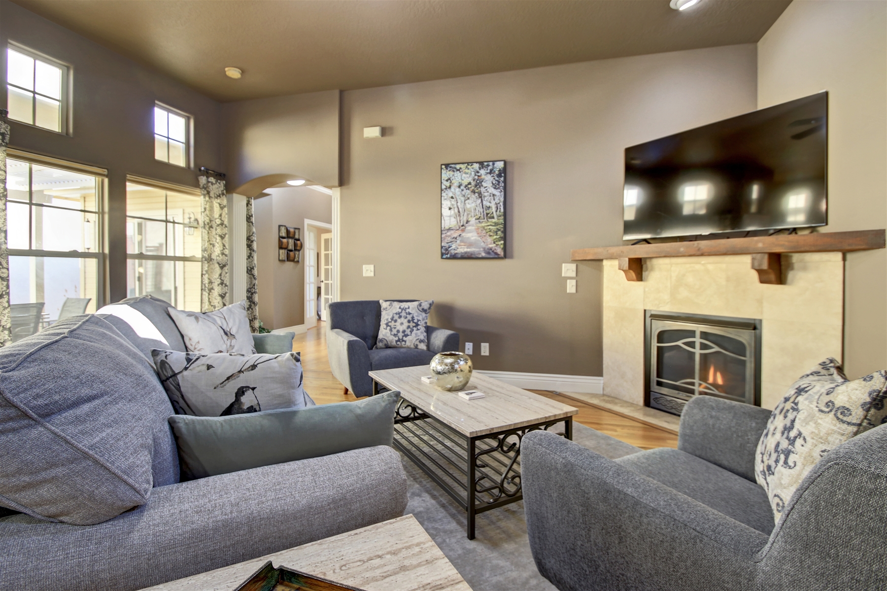 Spacious Living: This fully furnished 3-bedroom, 2-bath home boasts an open-concept floor plan with 10-foot ceilings, hardwood floors, and a cozy gas fireplace.