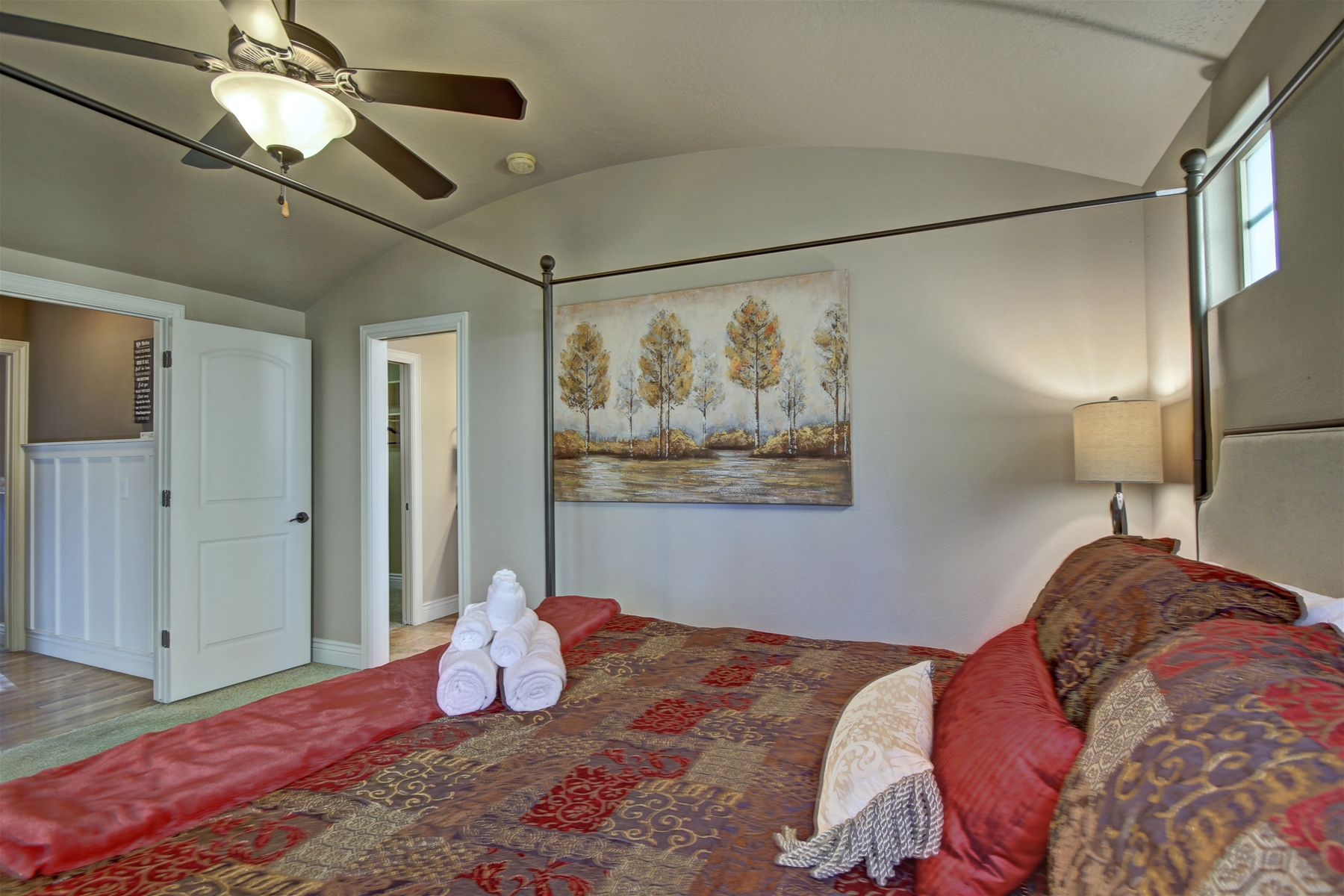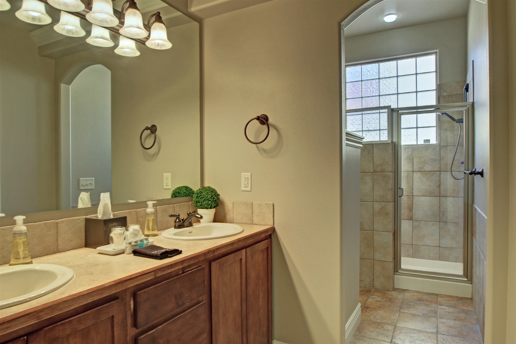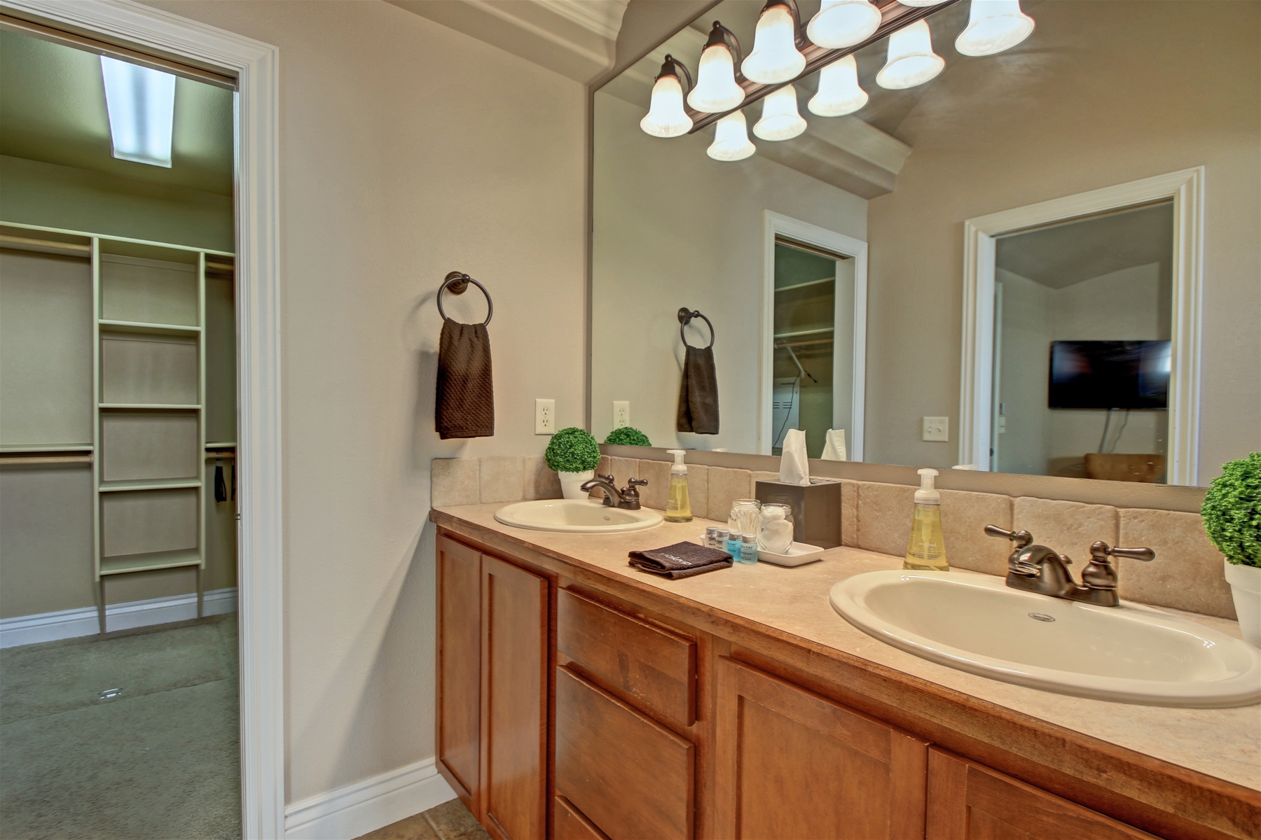 Luxurious Master Suite: Unwind in the master bedroom featuring double sinks, a Mediterranean walk-in shower, and a spacious walk-in closet.