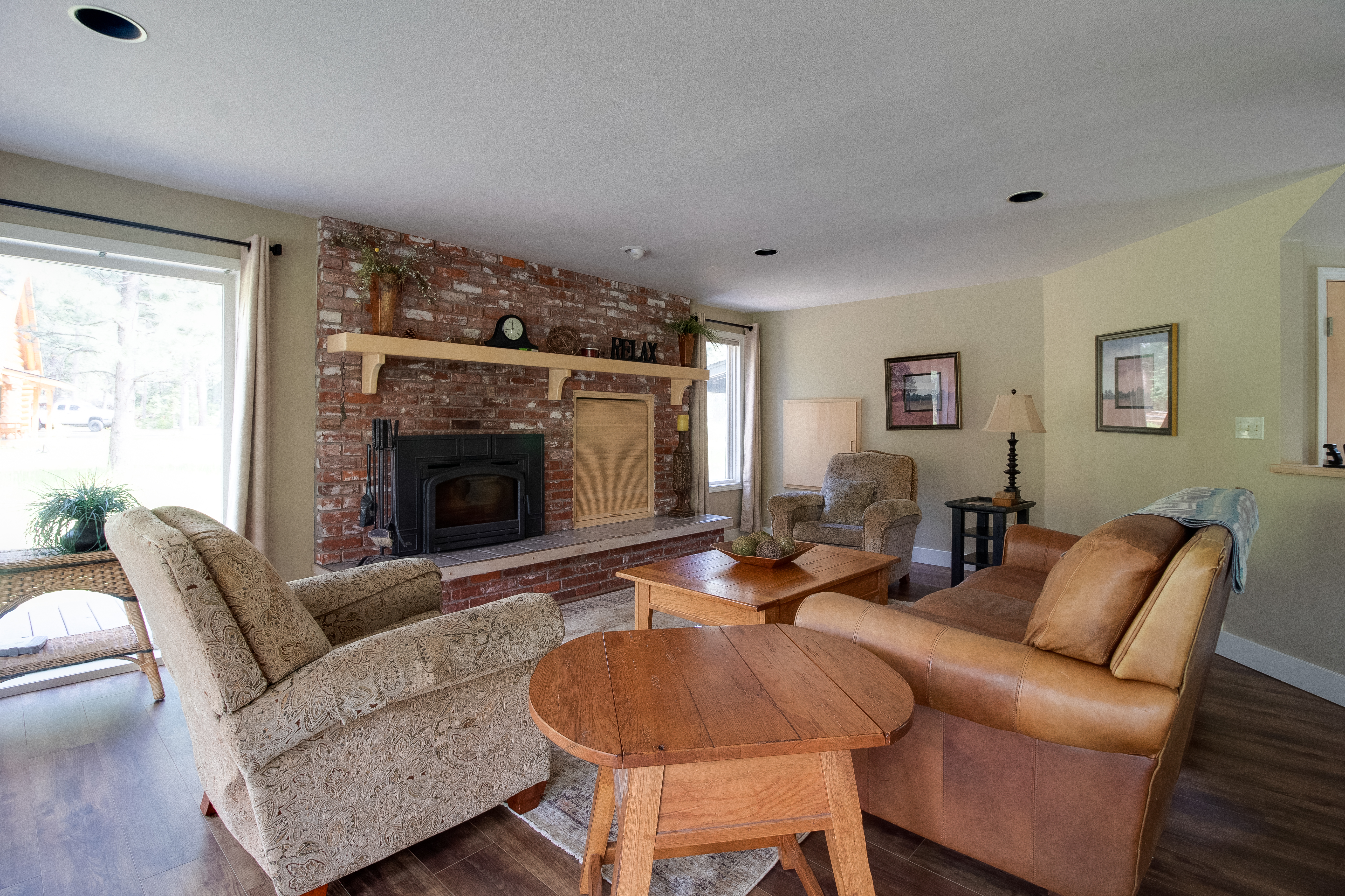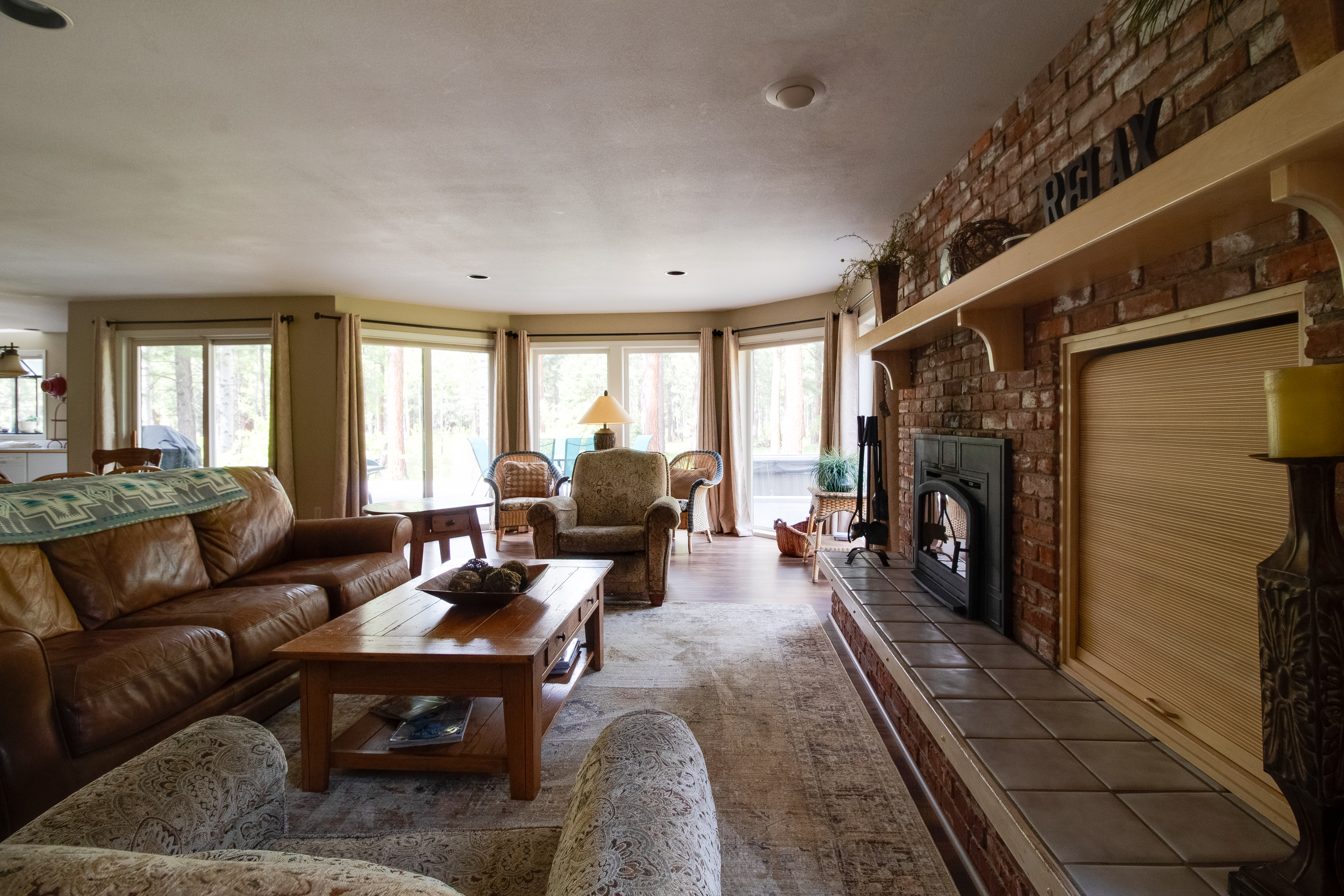A separate living room with a wood-burning fireplace and large windows that bring the outdoors in