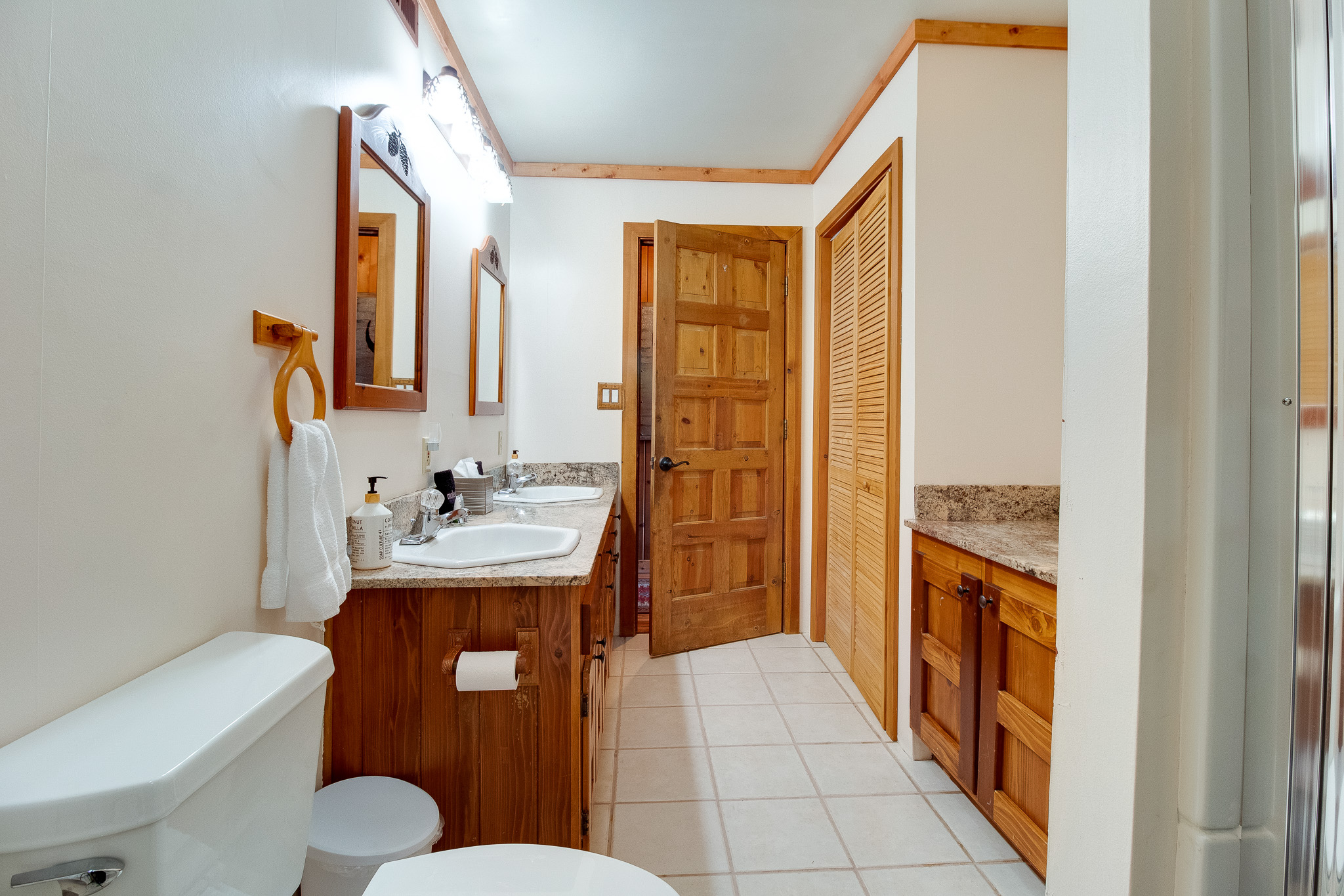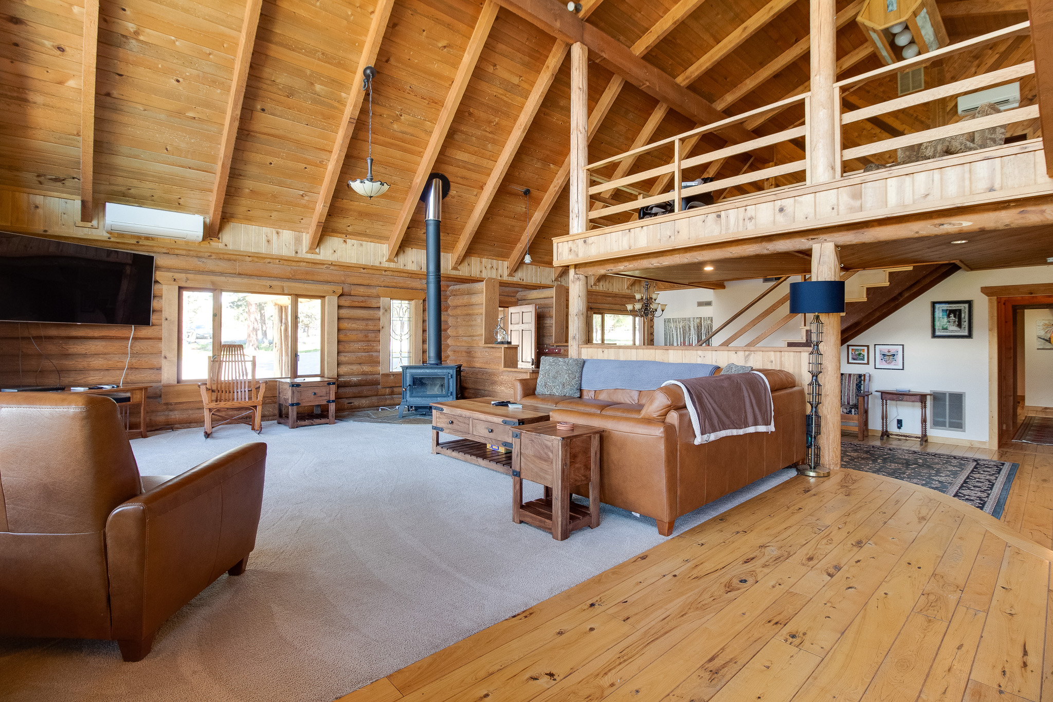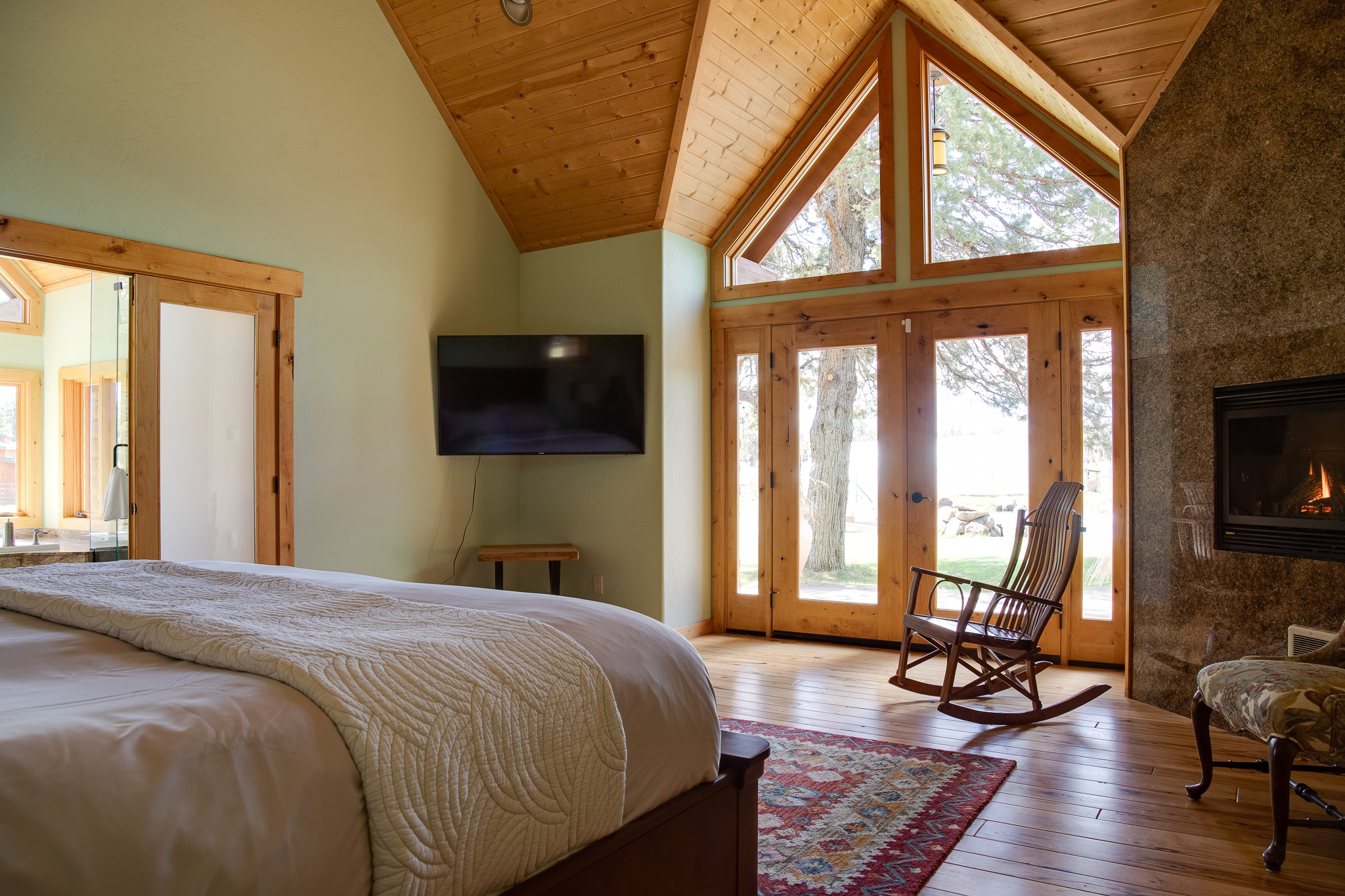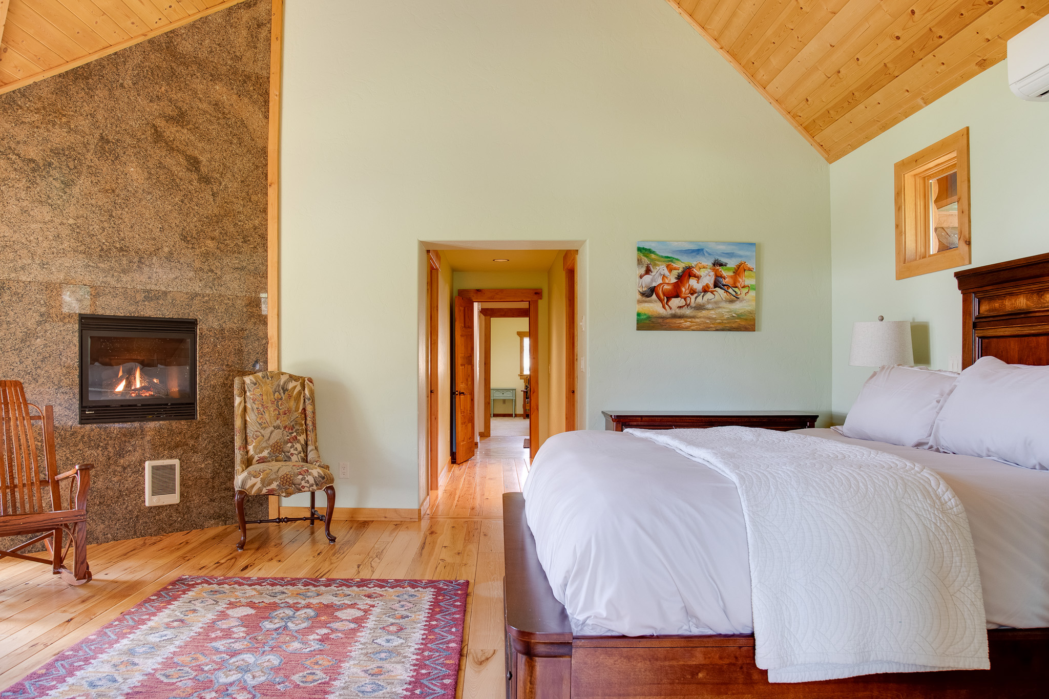 As you enter the main house, you'll be struck by the open and inviting atmosphere. The spacious living room features a cozy wood-burning fireplace, perfect for relaxing after a long day of outdoor activities. The master bedroom is equipped with a gas fireplace, providing a luxurious and romantic ambiance. The master bathroom boasts a walk-in shower and a soaking tub, allowing you to unwind and relax in total comfort.