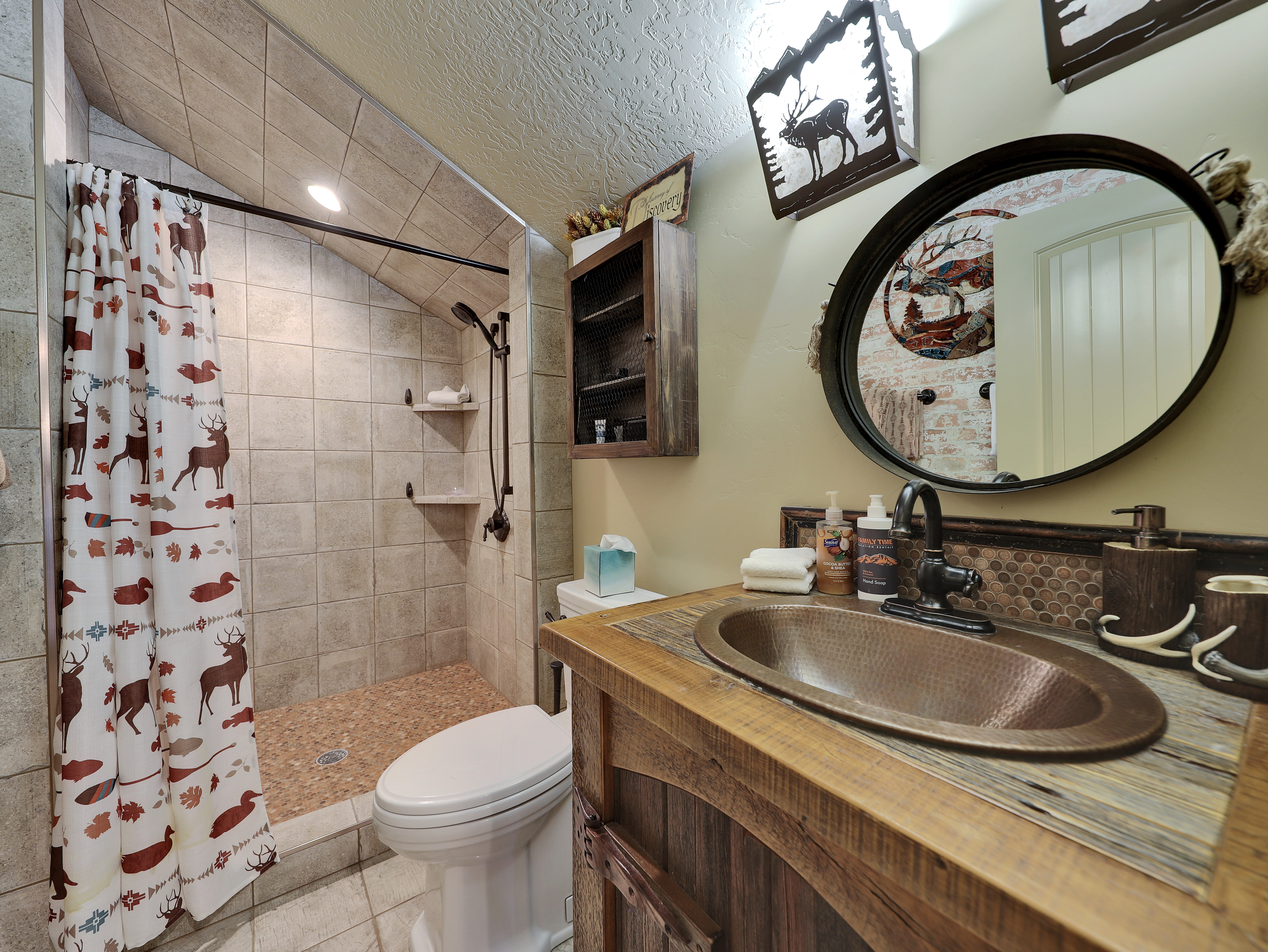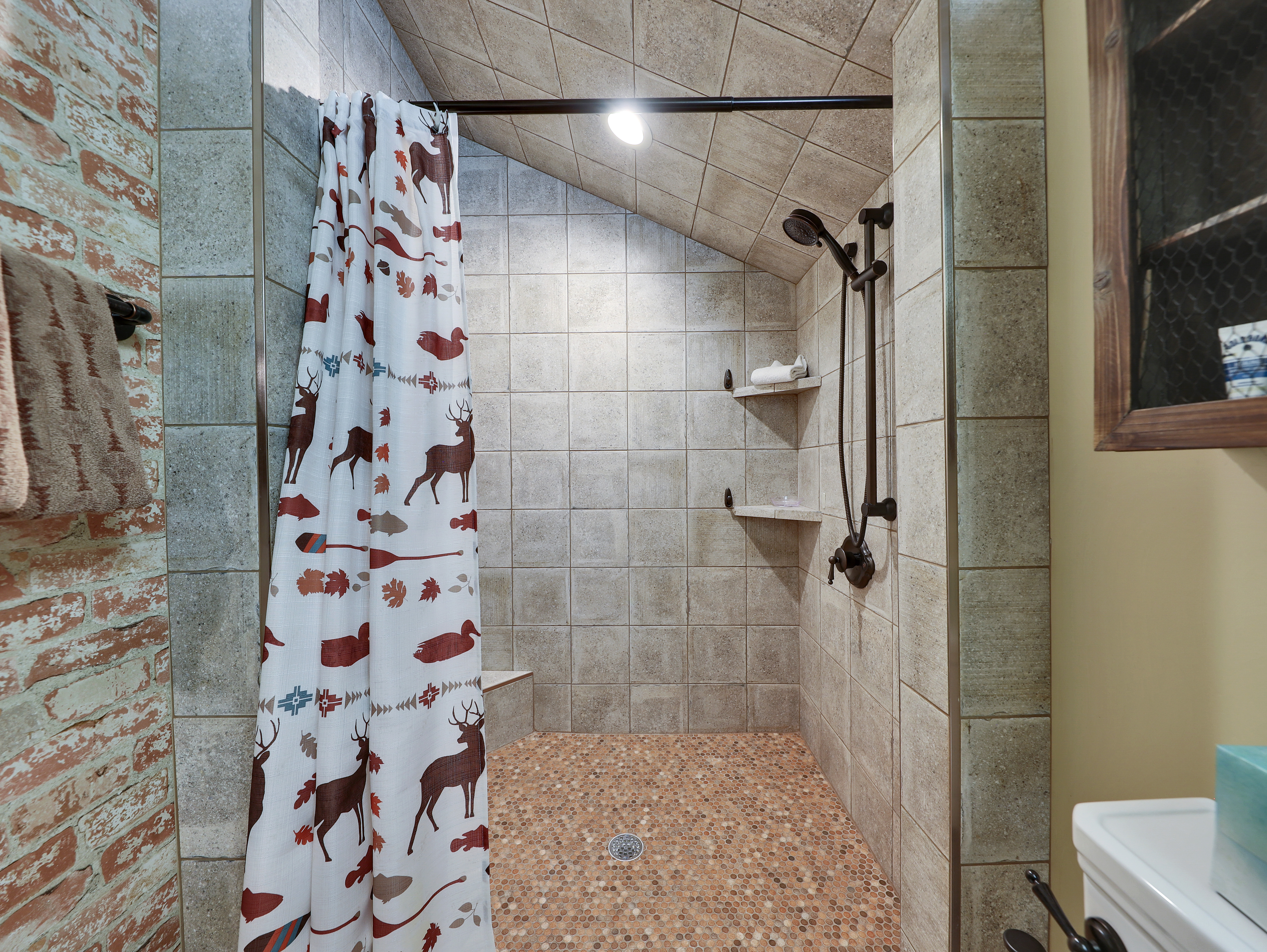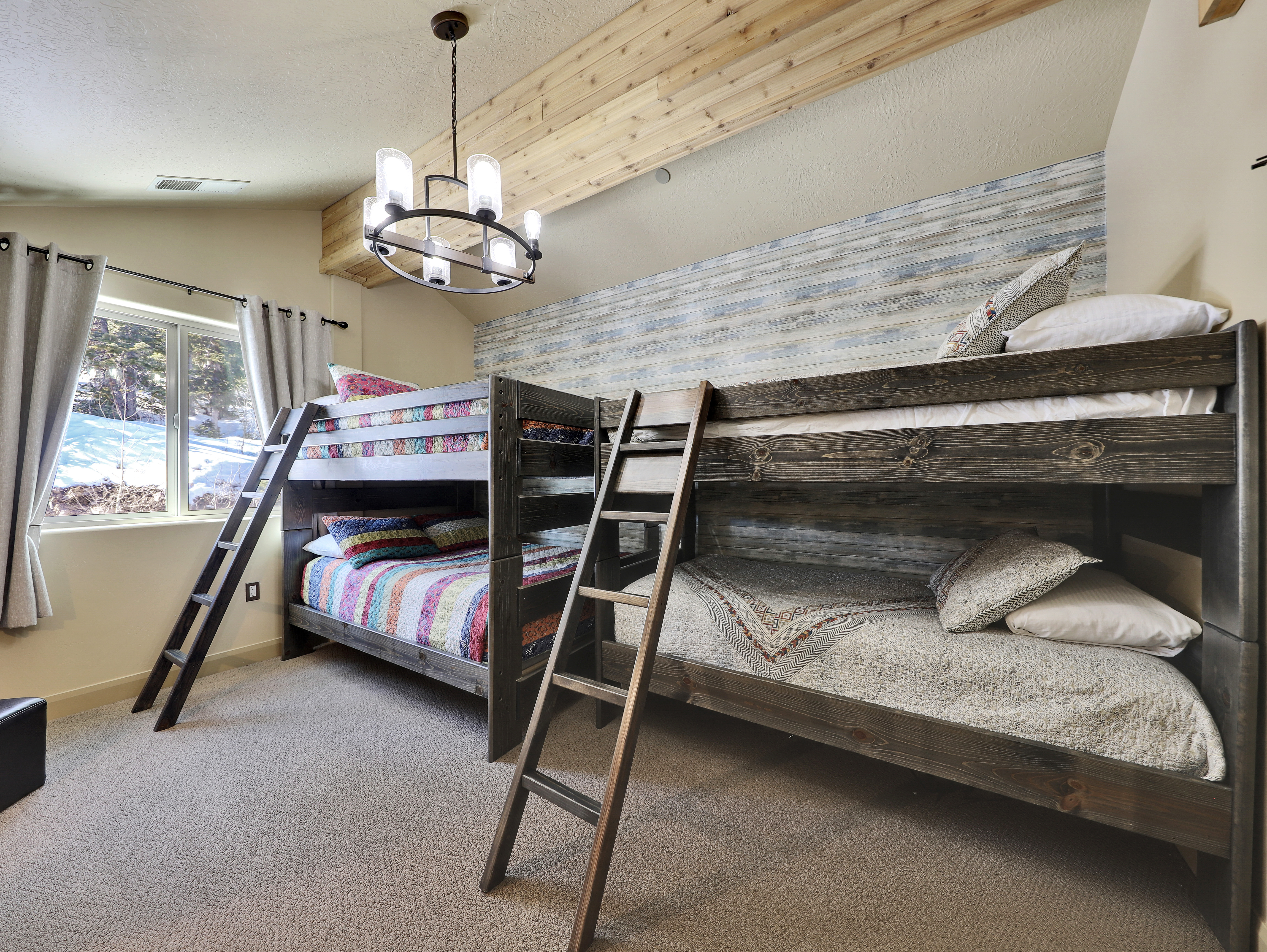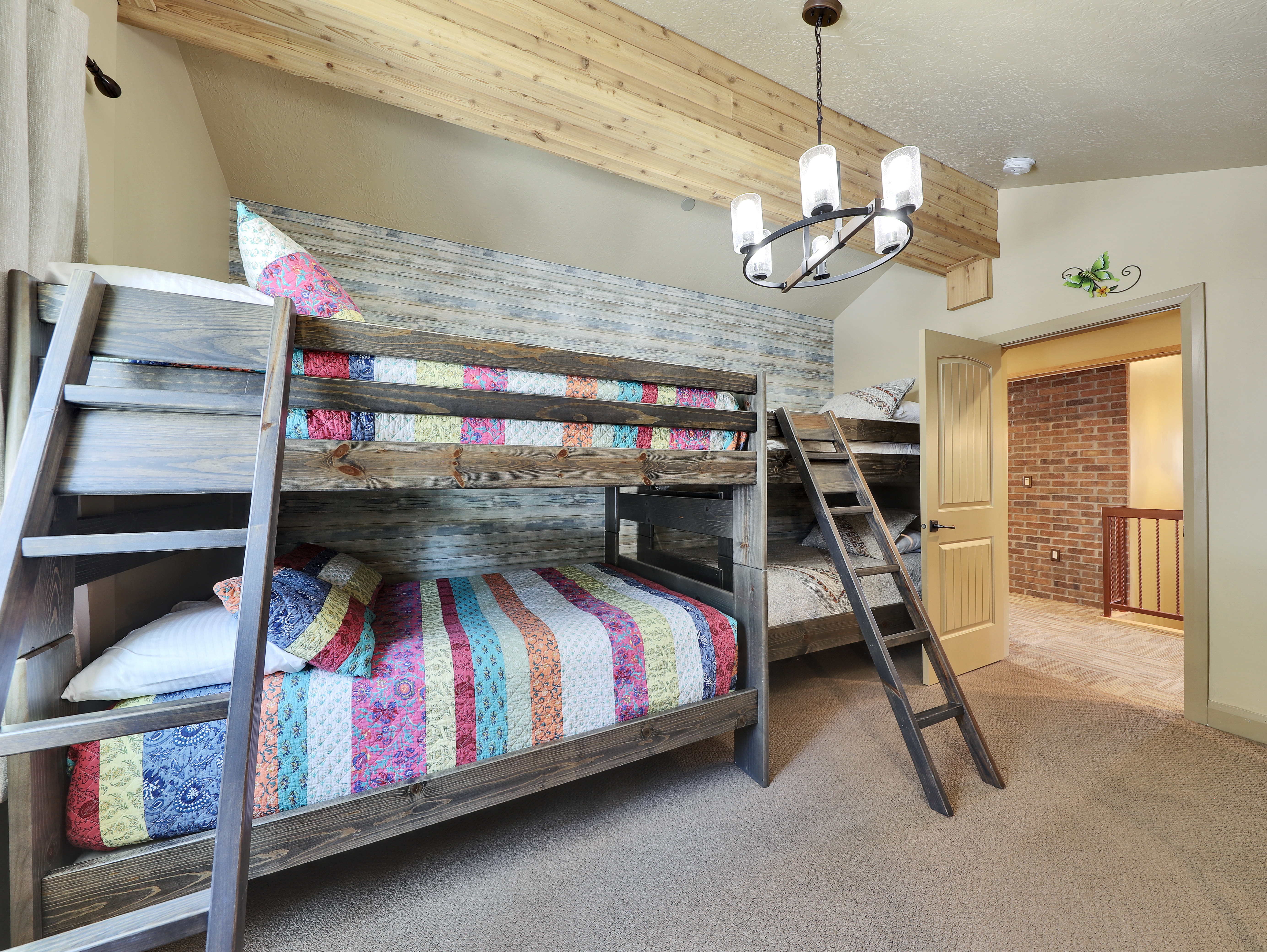 Upstairs, you’ll find a bunk room perfect for families, featuring a full-over-full bunk bed, twin-over-twin bunk bed, and an attached bathroom with a shower.