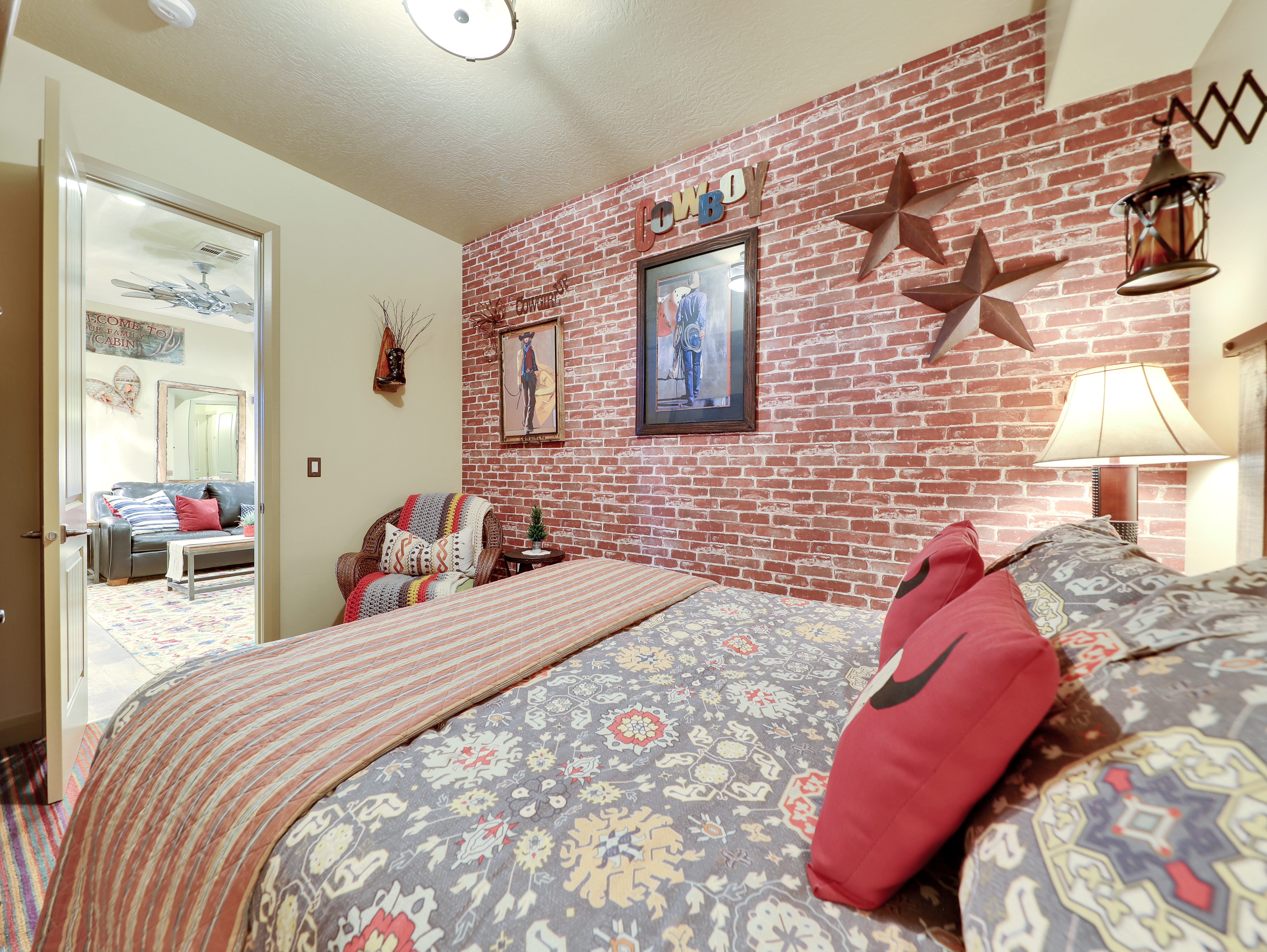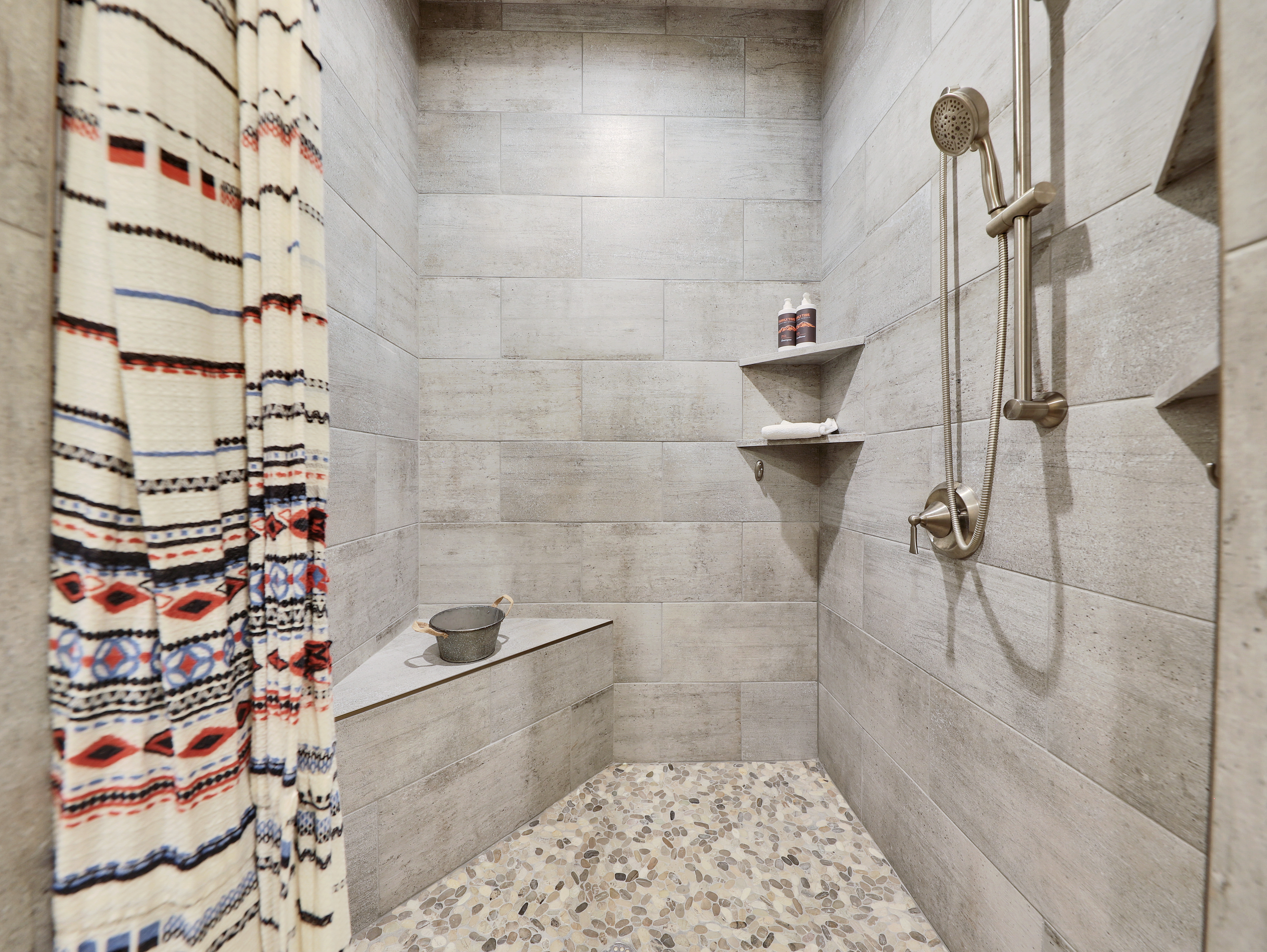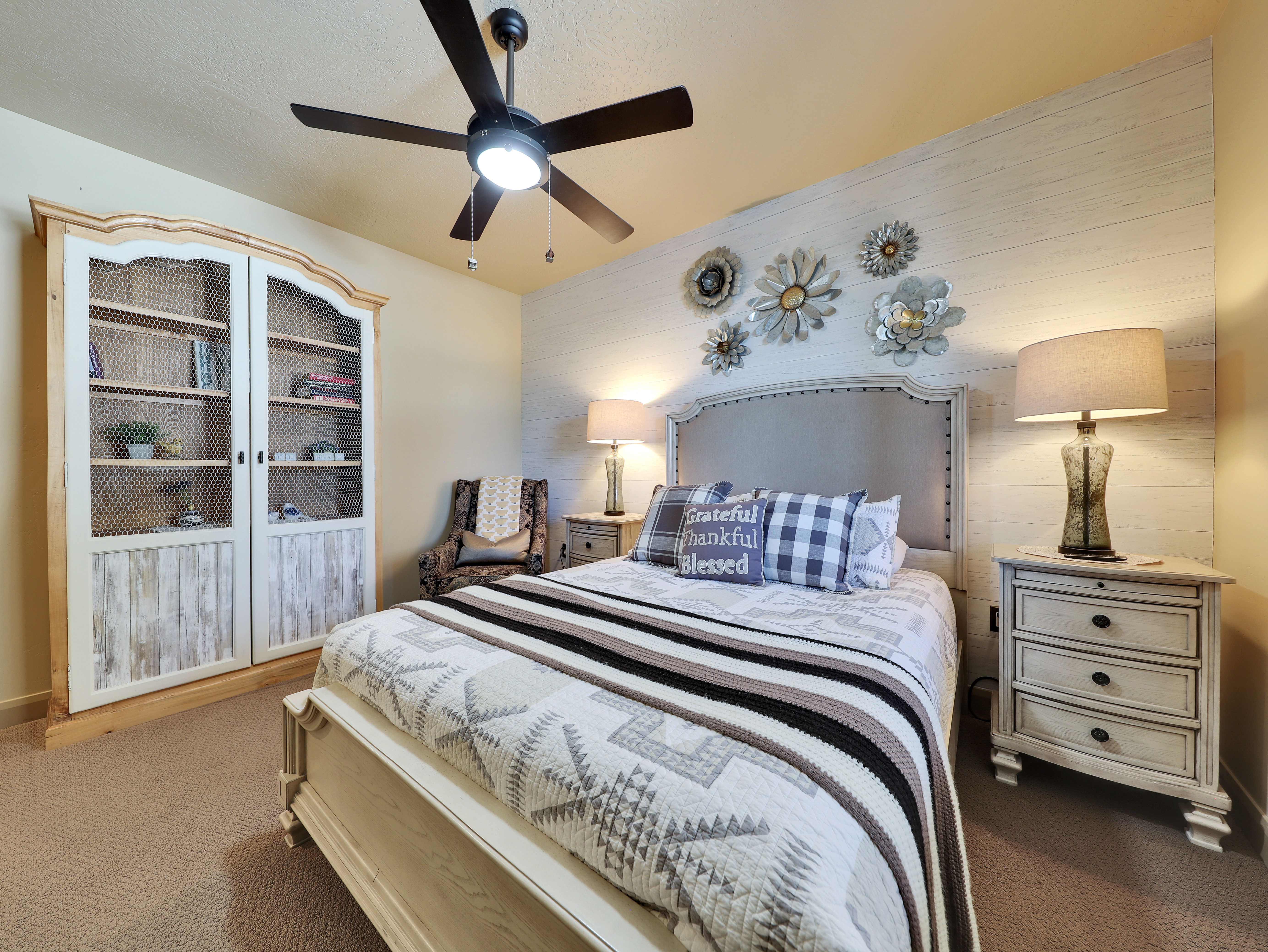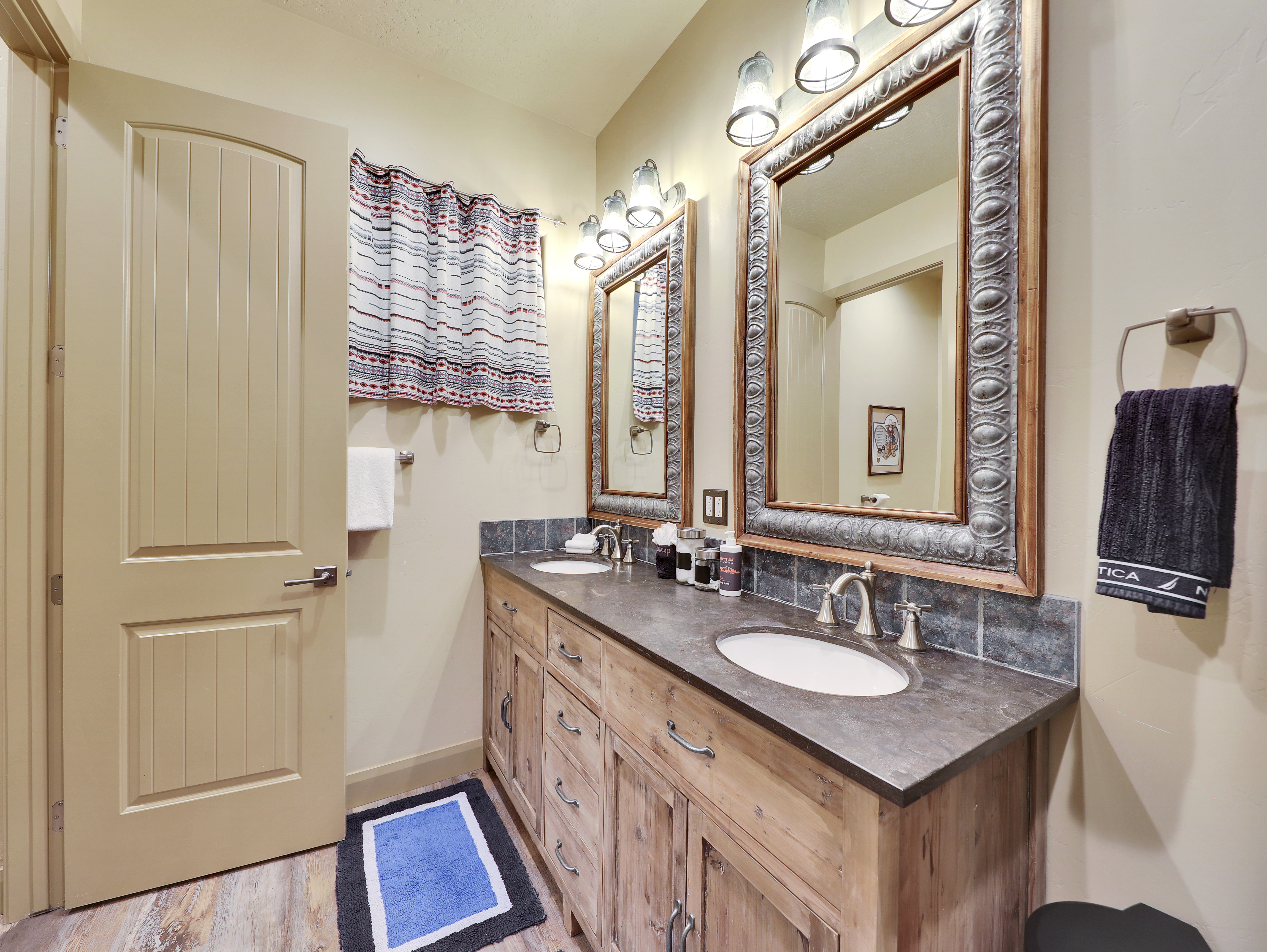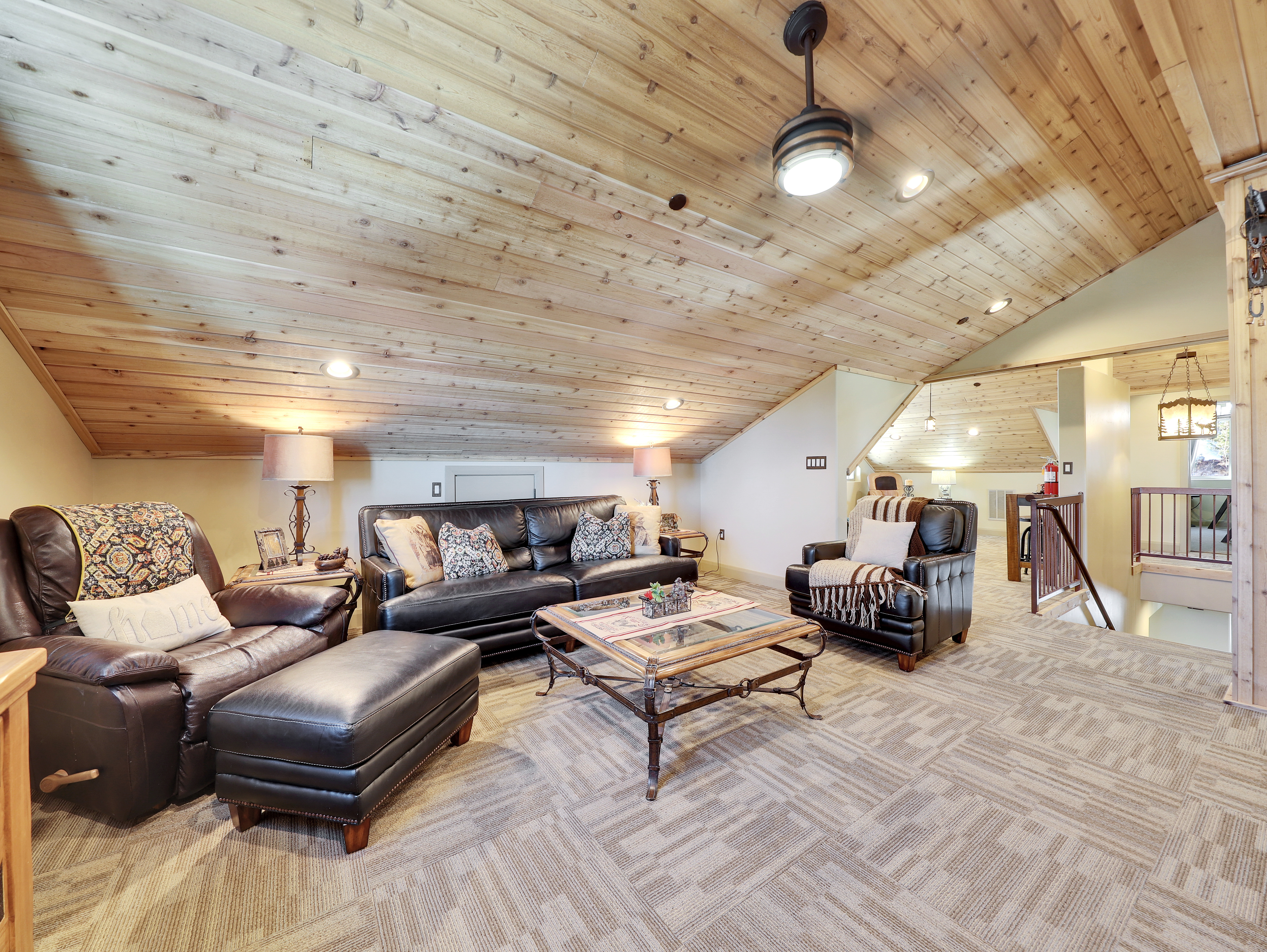 Upstairs, you’ll find a bunk room perfect for families, featuring a full-over-full bunk bed, twin-over-twin bunk bed, and an attached bathroom with a shower.
