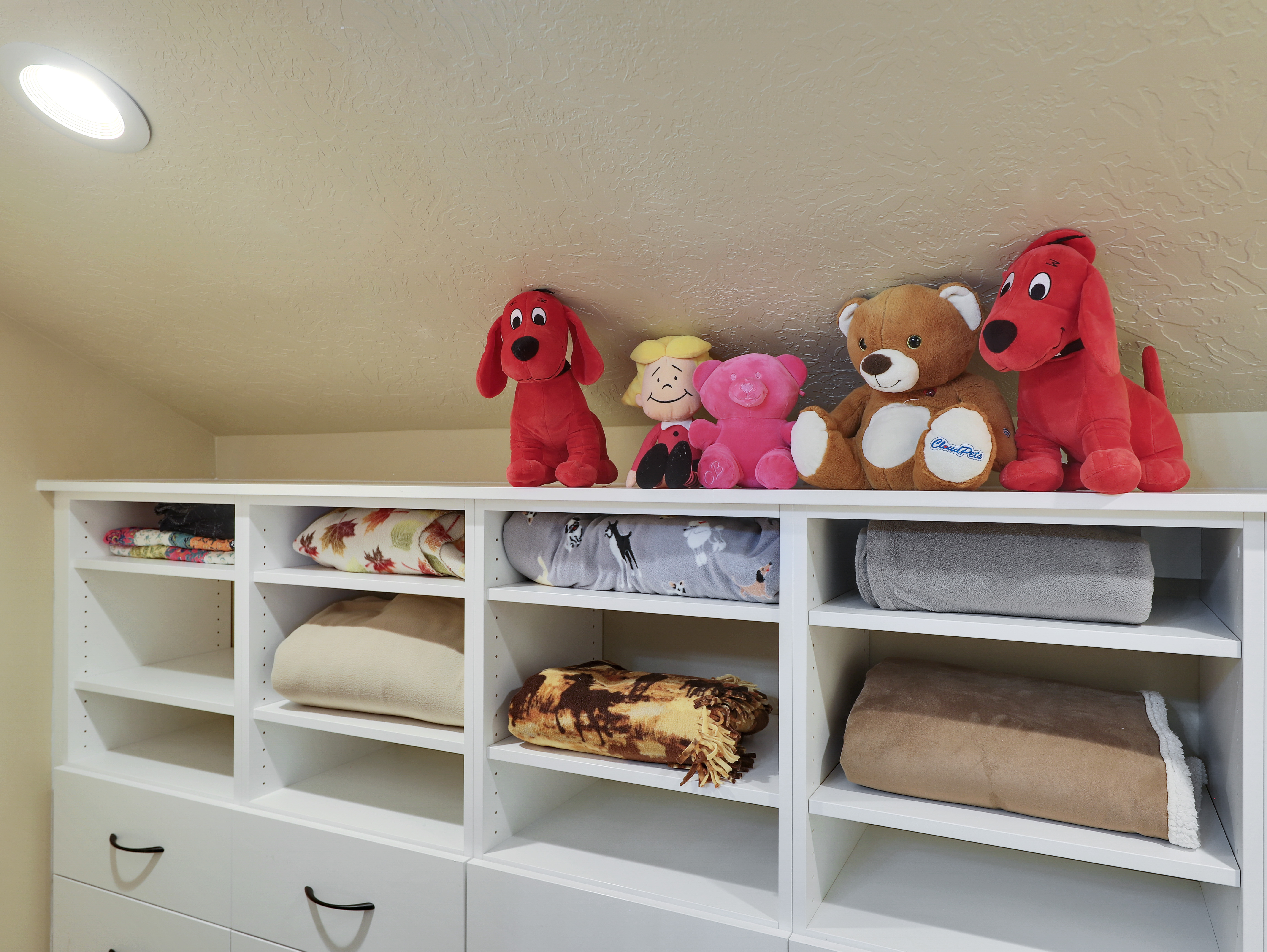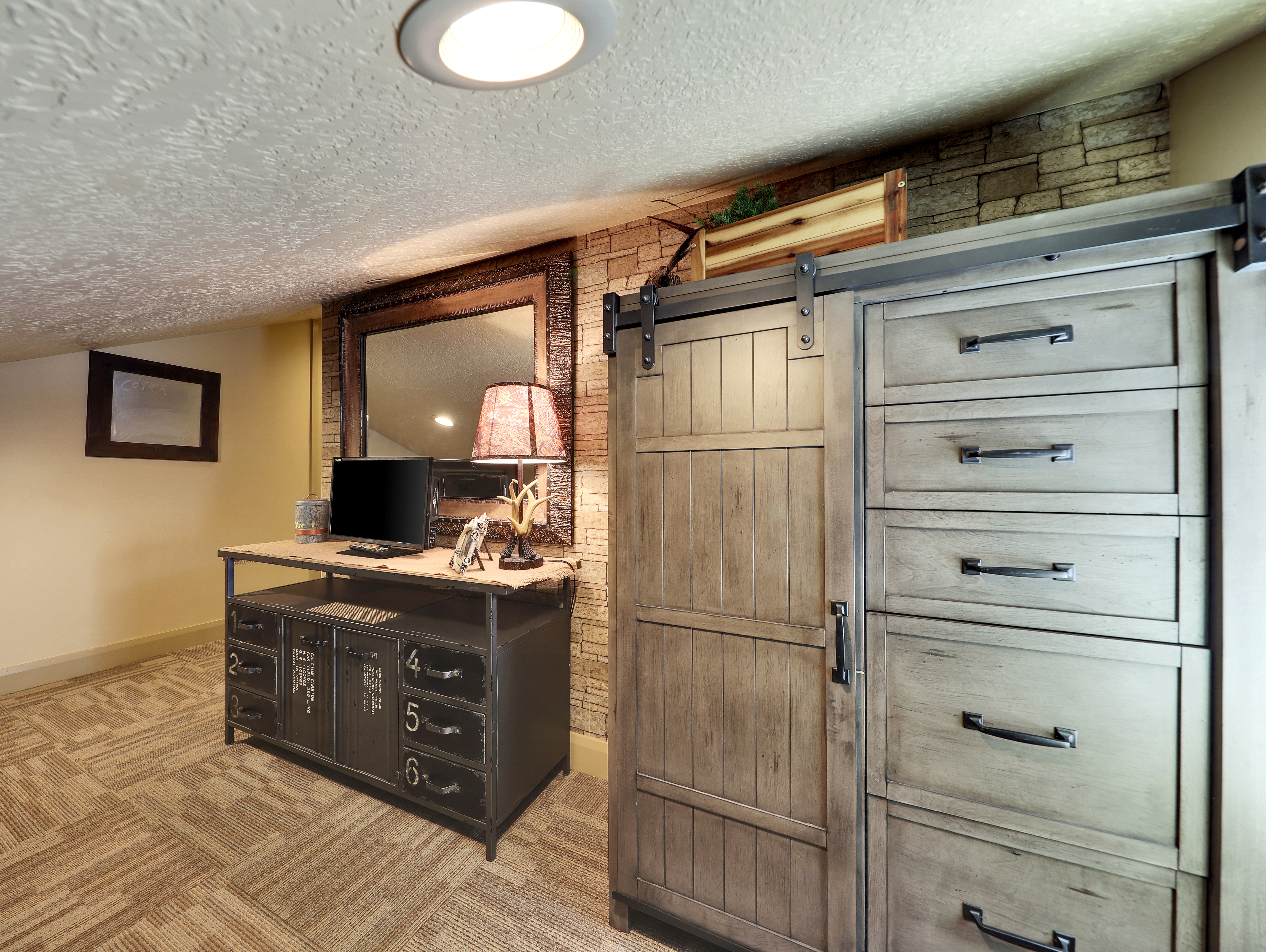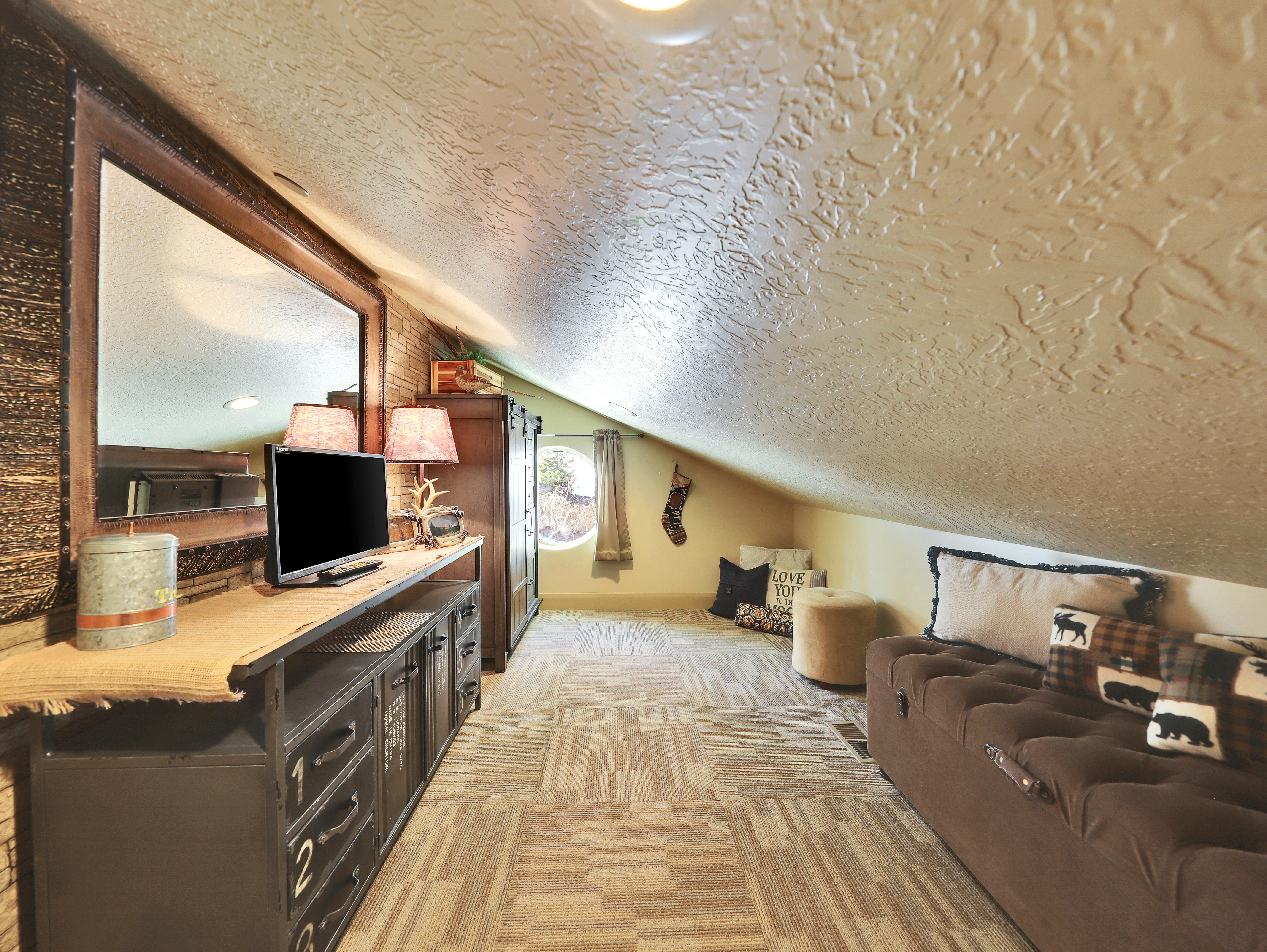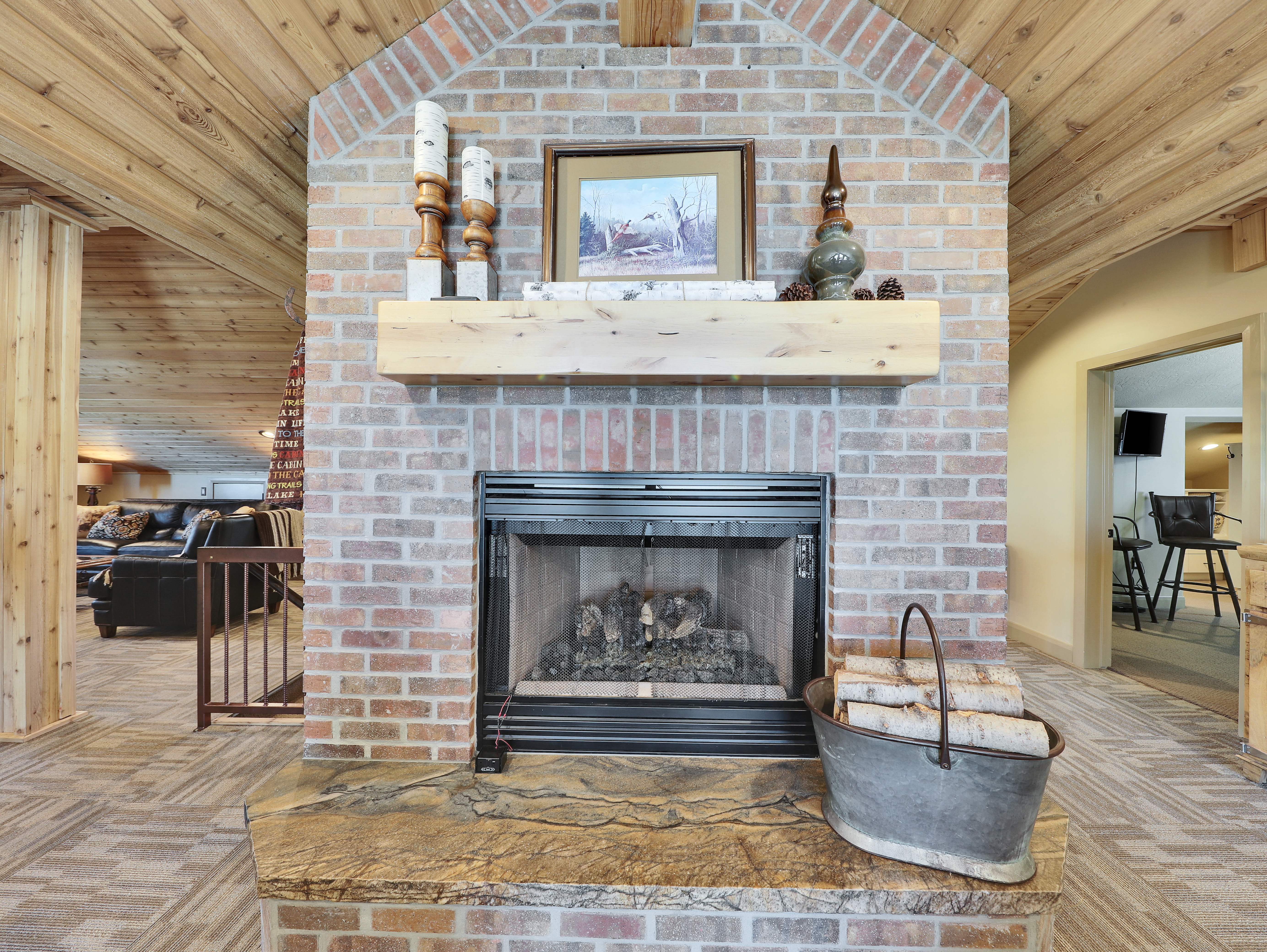 Upstairs, you’ll find a bunk room perfect for families, featuring a full-over-full bunk bed, twin-over-twin bunk bed, and an attached bathroom with a shower.