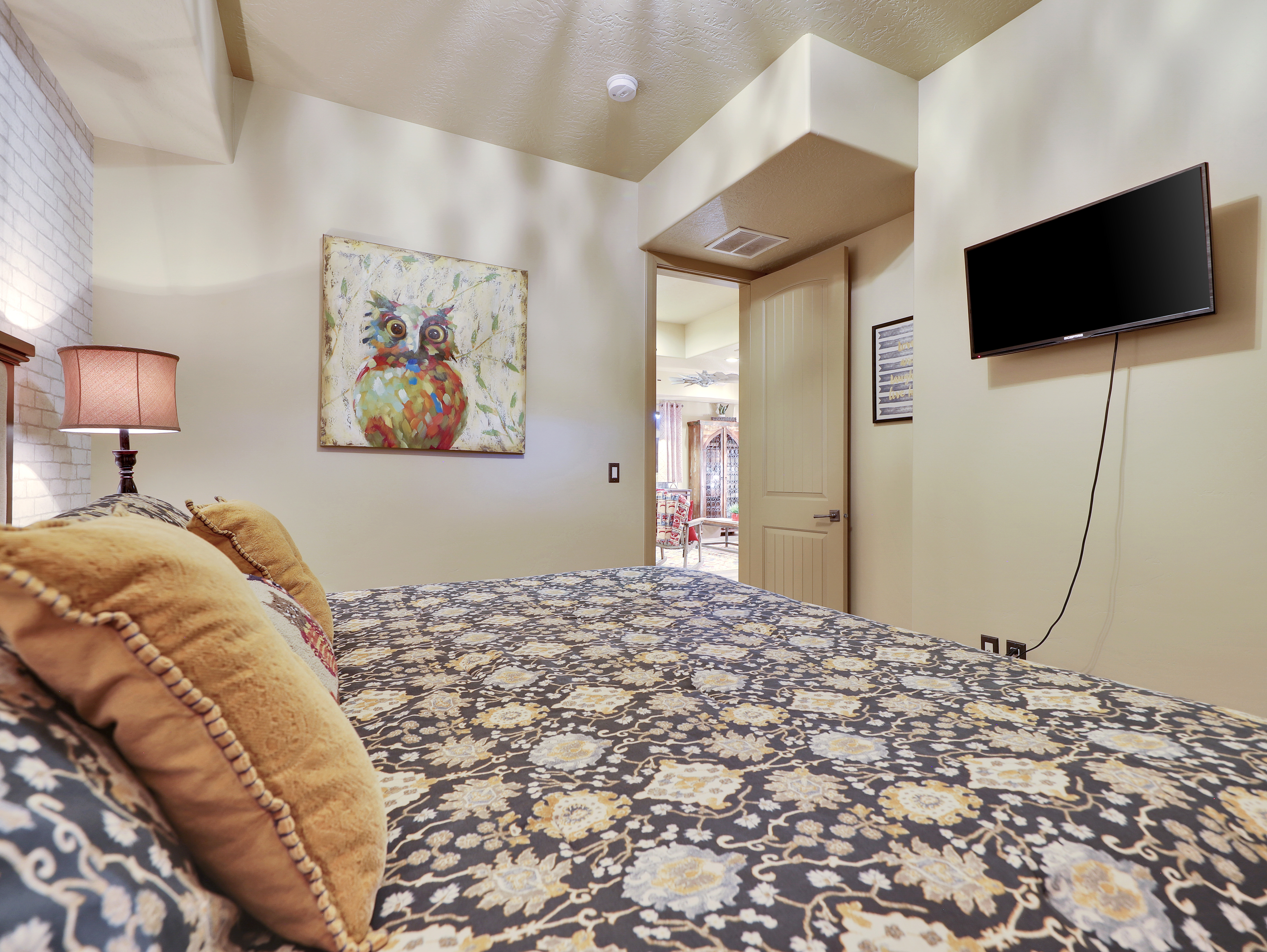 On the bottom floor, there are two spacious king bedrooms, ideal for couples or solo travelers seeking comfort. A queen bedroom and a sofa queen sleeper in the common area provide versatile sleeping arrangements, with a shared full bath ensuring everyone’s comfort.