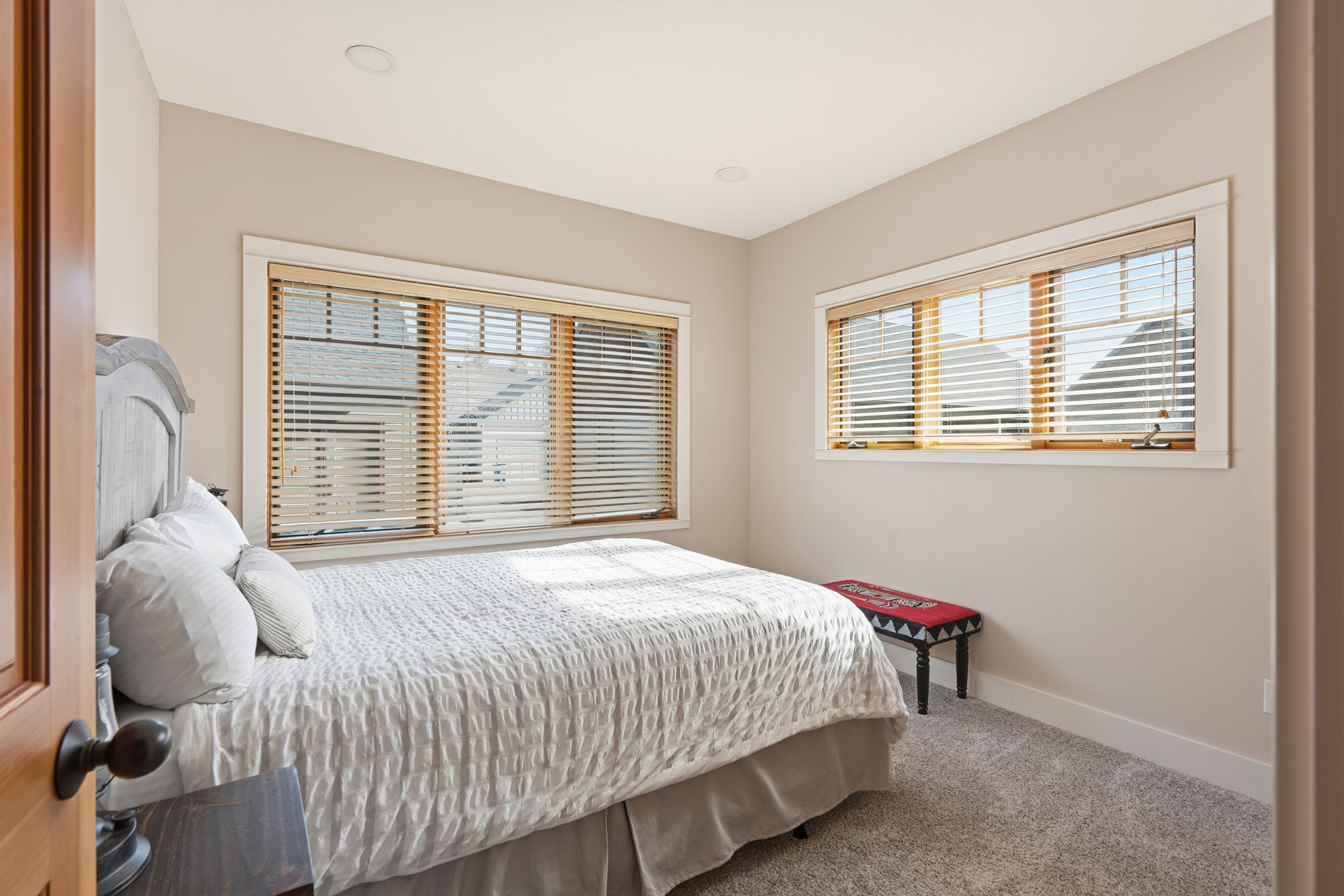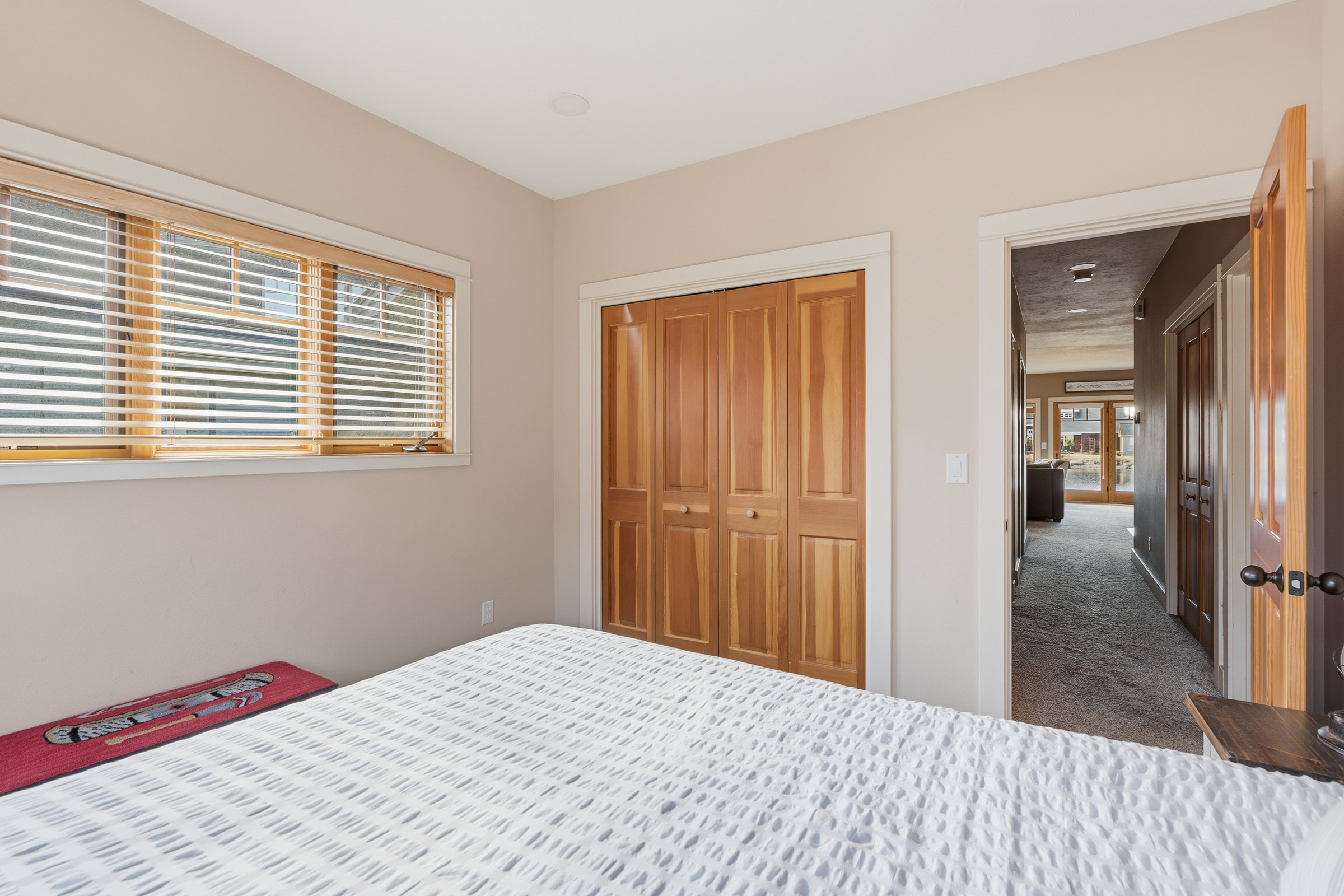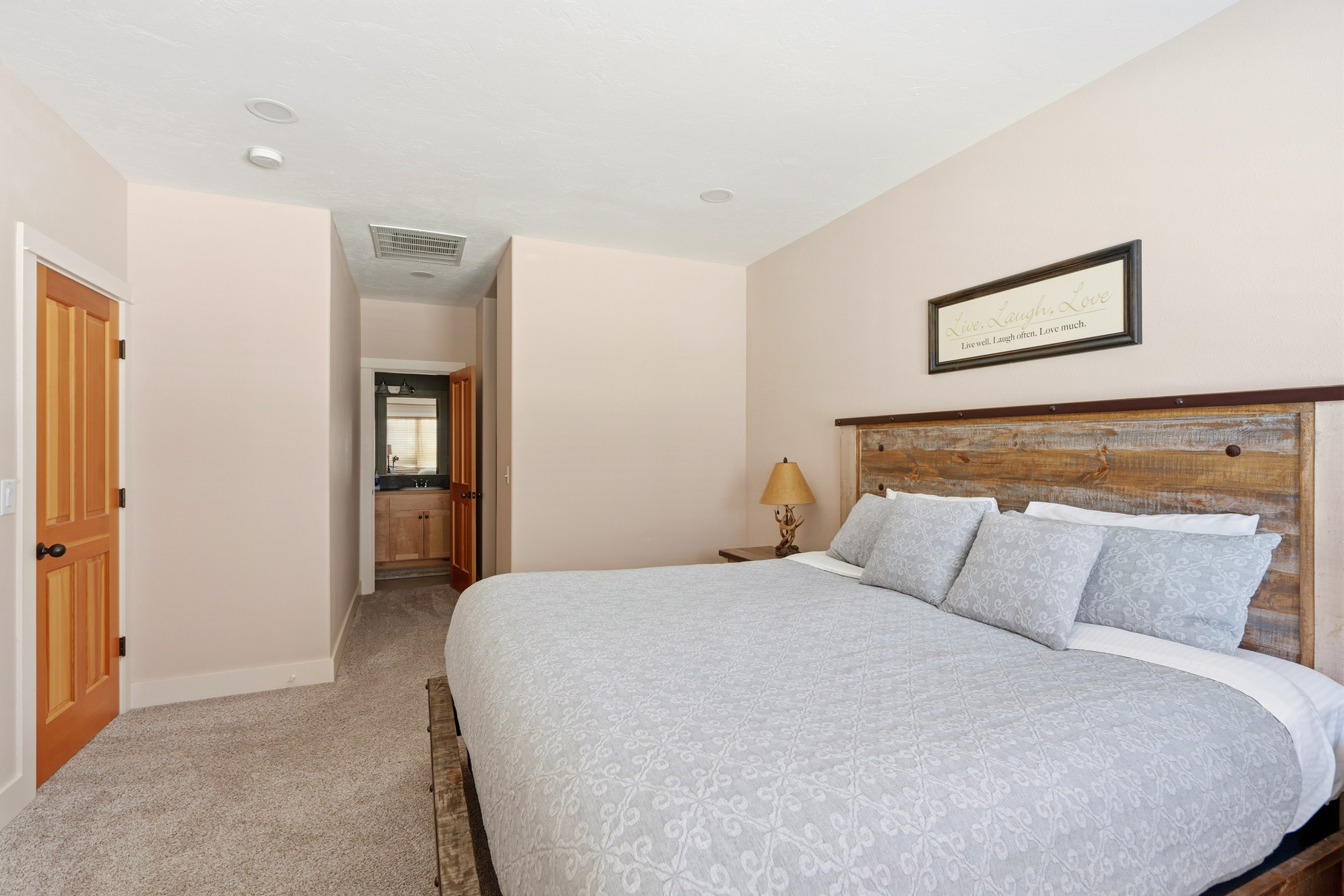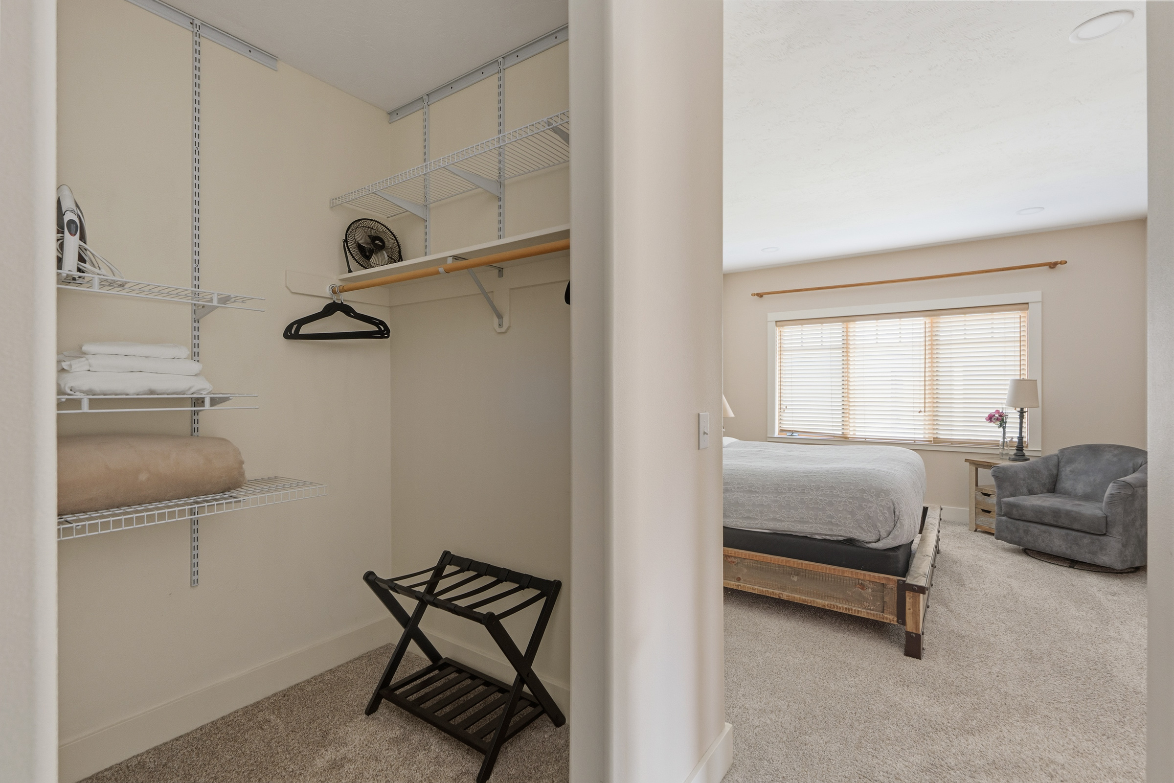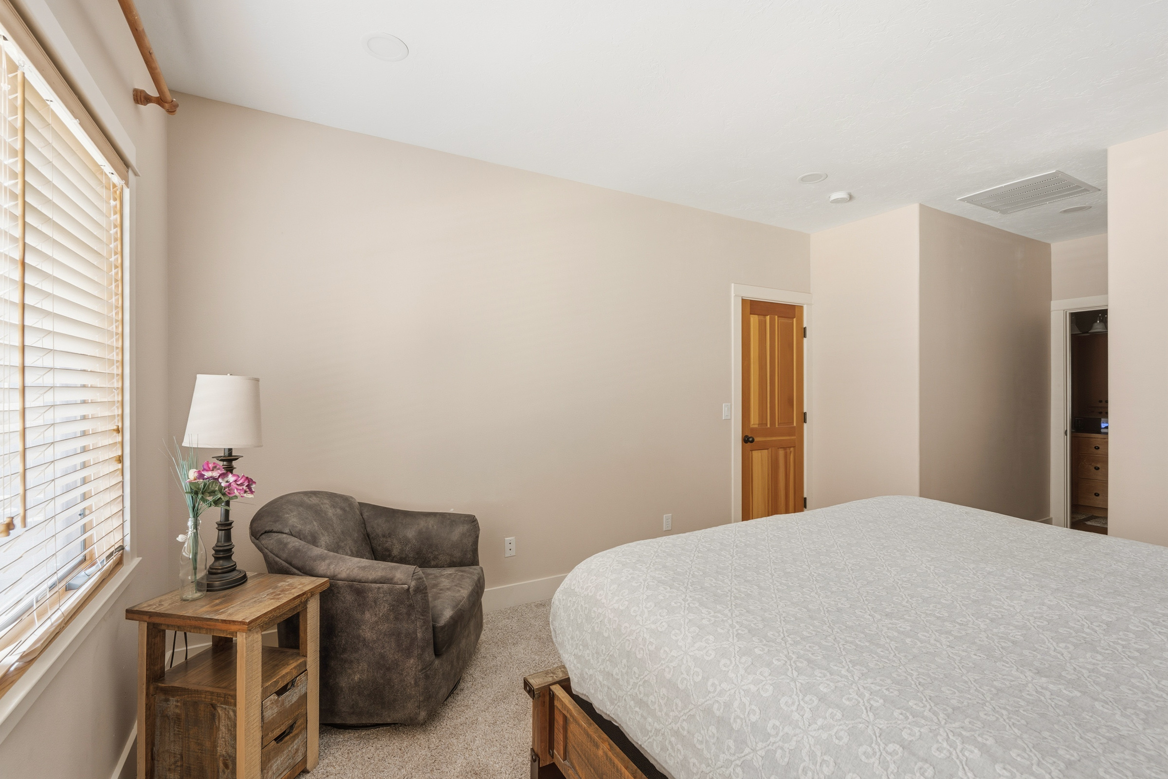The primary bedroom is located on the lefthand side of the hallway. It comes with a King size bed, reading nook, walk in closet and ensuite bathroom with a double vanity.