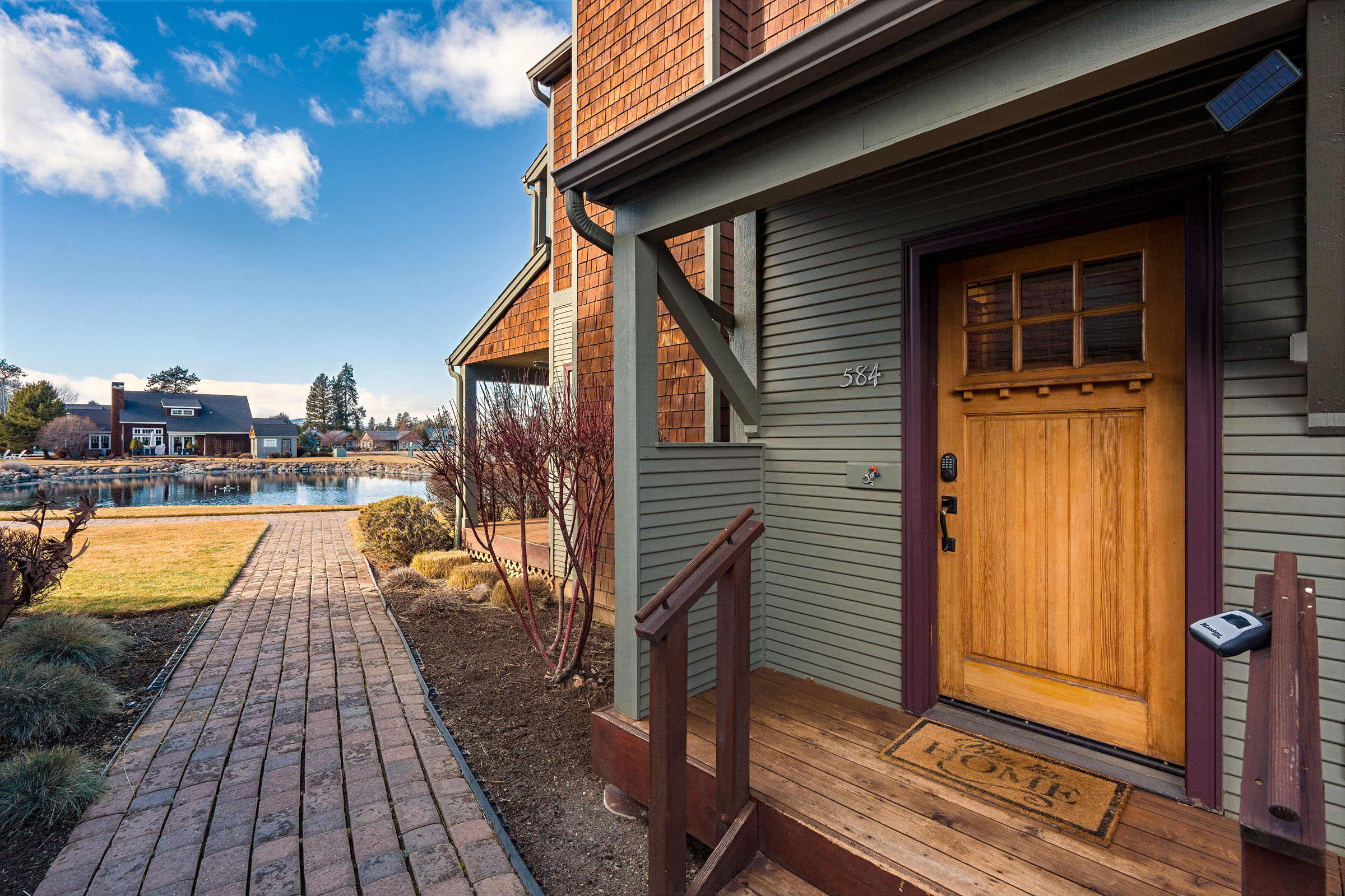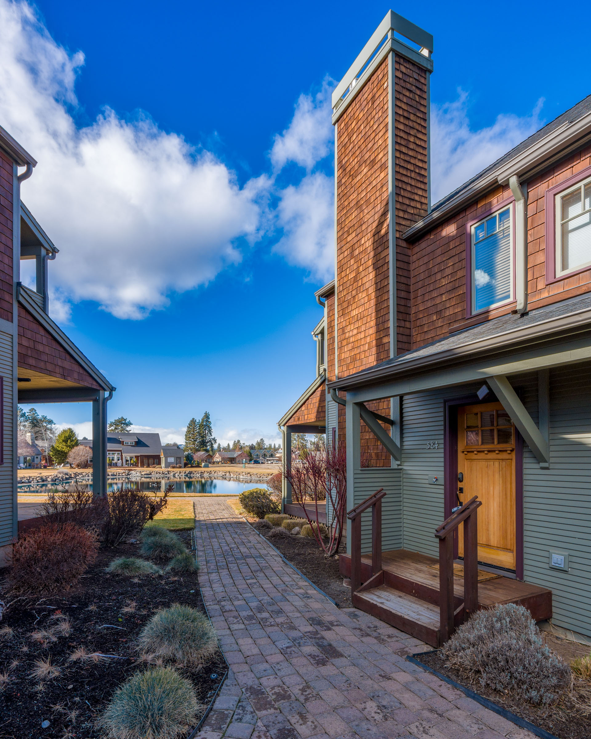The patio with views of the fountain and walking paths is an oasis where we envision guests enjoying their favorite drink while grilling a delicious meal.