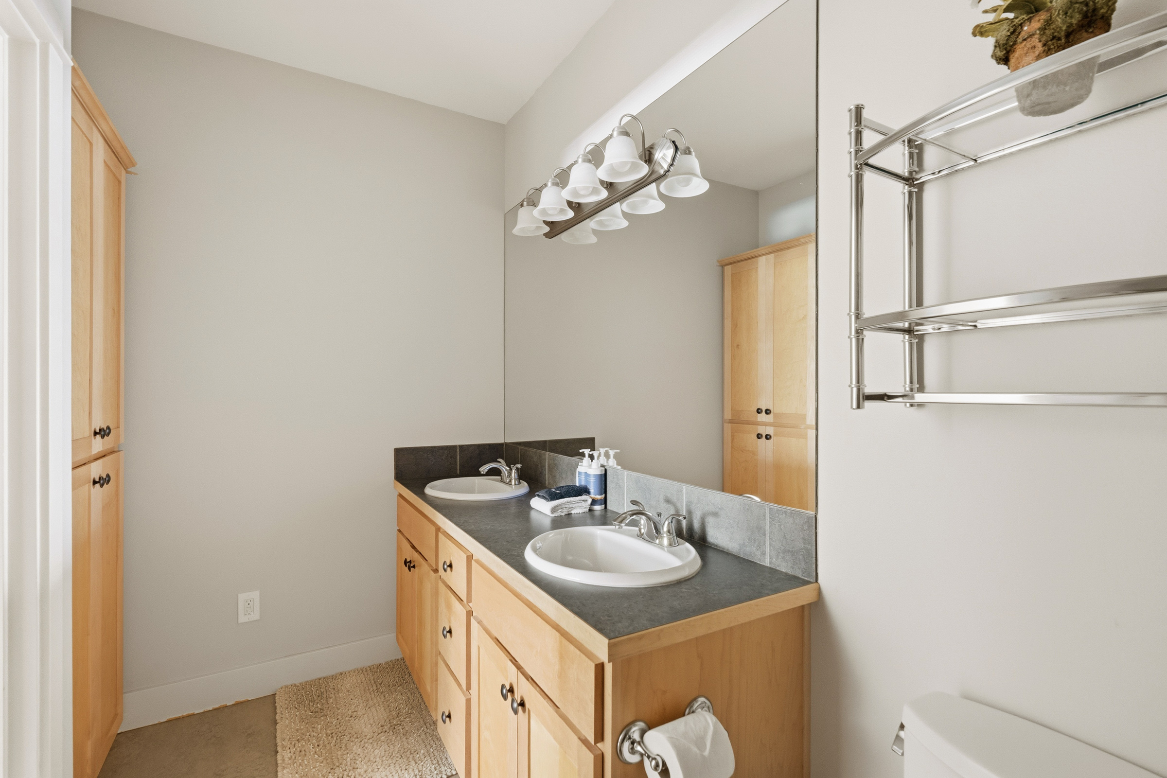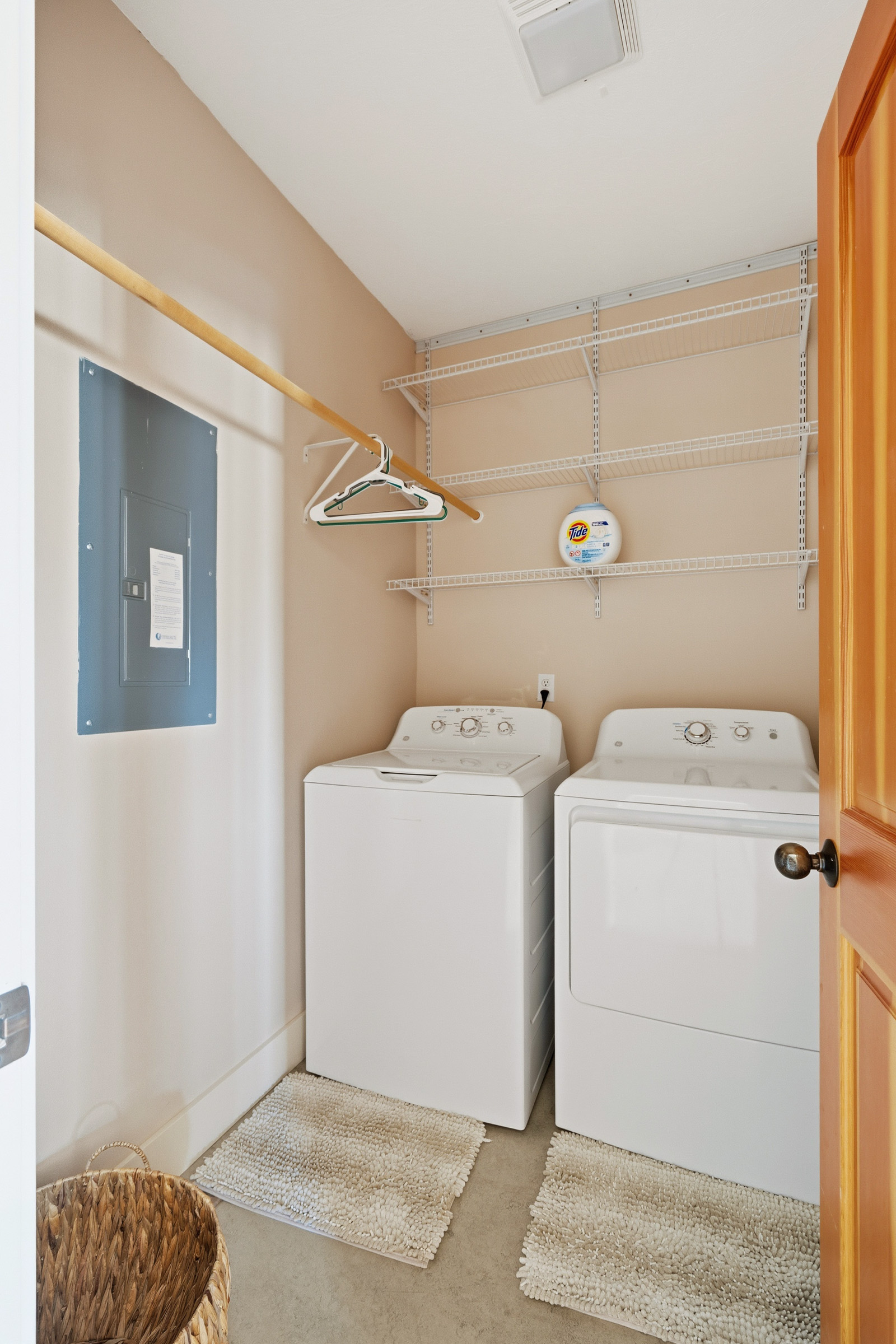 Down the hall the first door to your right has the laundry room with full size washer and dryer. Next you will come to one of two bathrooms. This bathroom includes a shower, and single vanity. Followed by the guest bedroom with a full size bed.