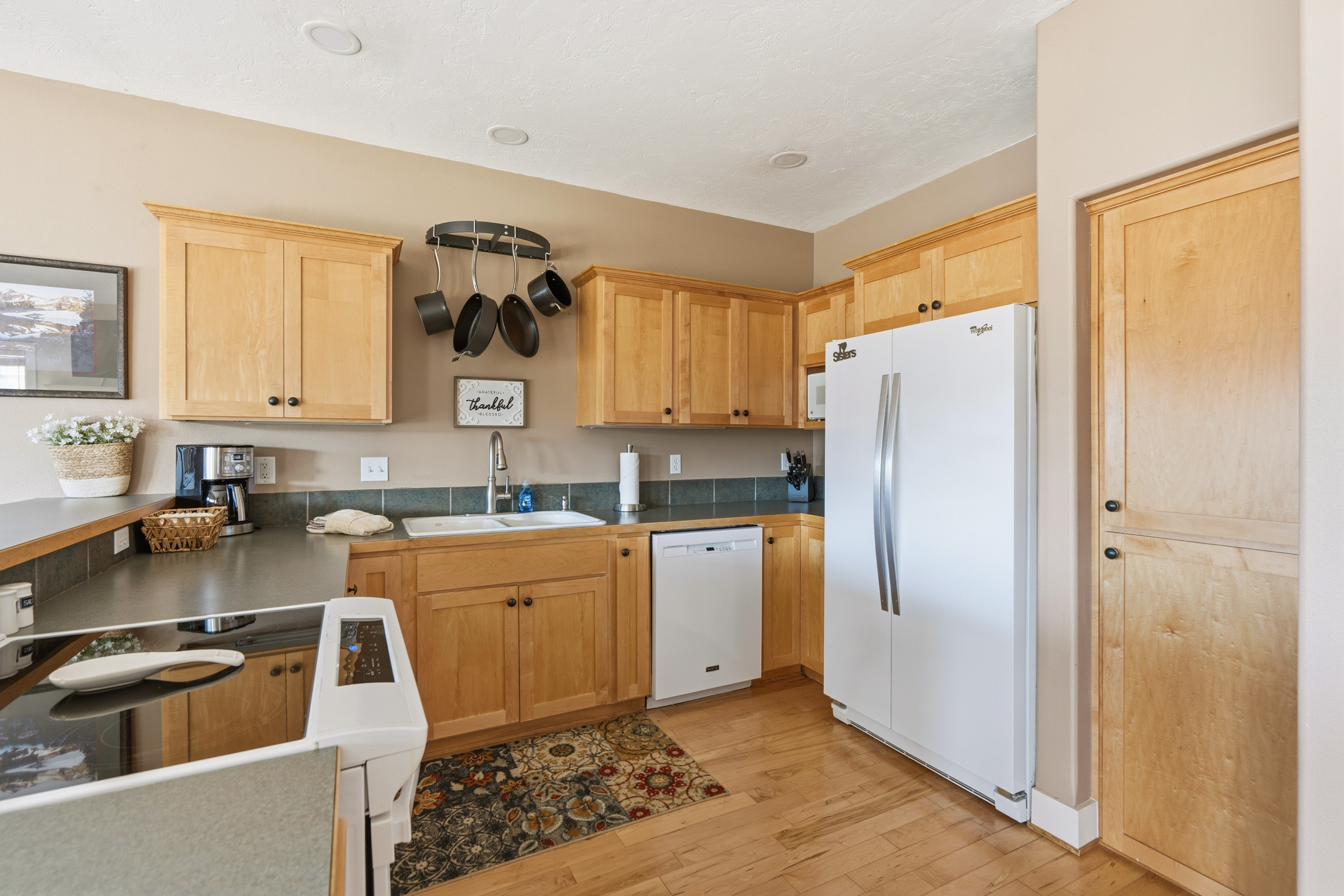 The chef in your family will enjoy being a part of the day-to-day with the kitchen being open to the living space. Our kitchen comes fully equipped to include a large fridge, stove, microwave, dishwasher, dishes, cookware, silverware, crockpot, blender, toaster, and even children's cutlery and dinnerware! Our breakfast bar completes the kitchen space, with four stools to enjoy a light meal!
