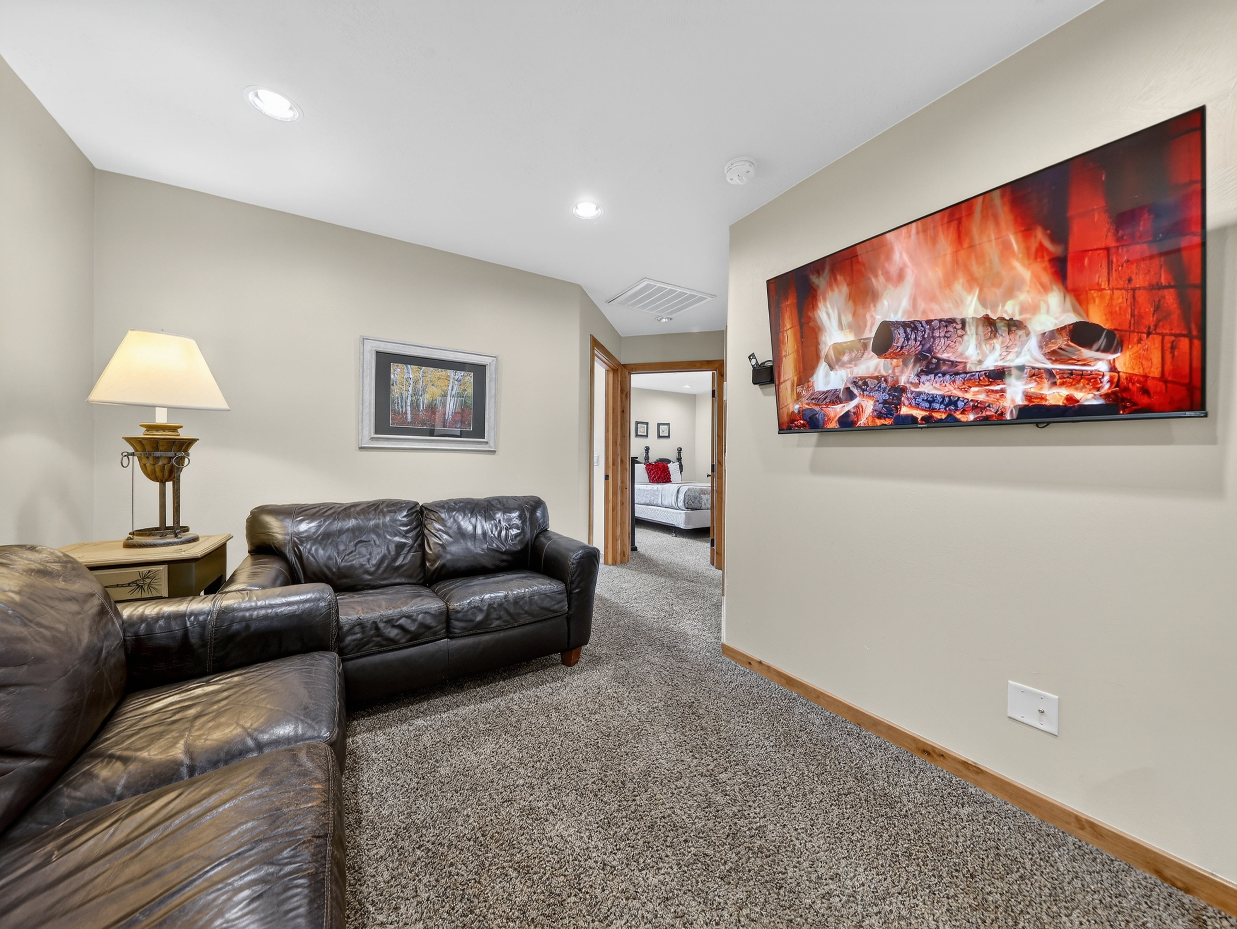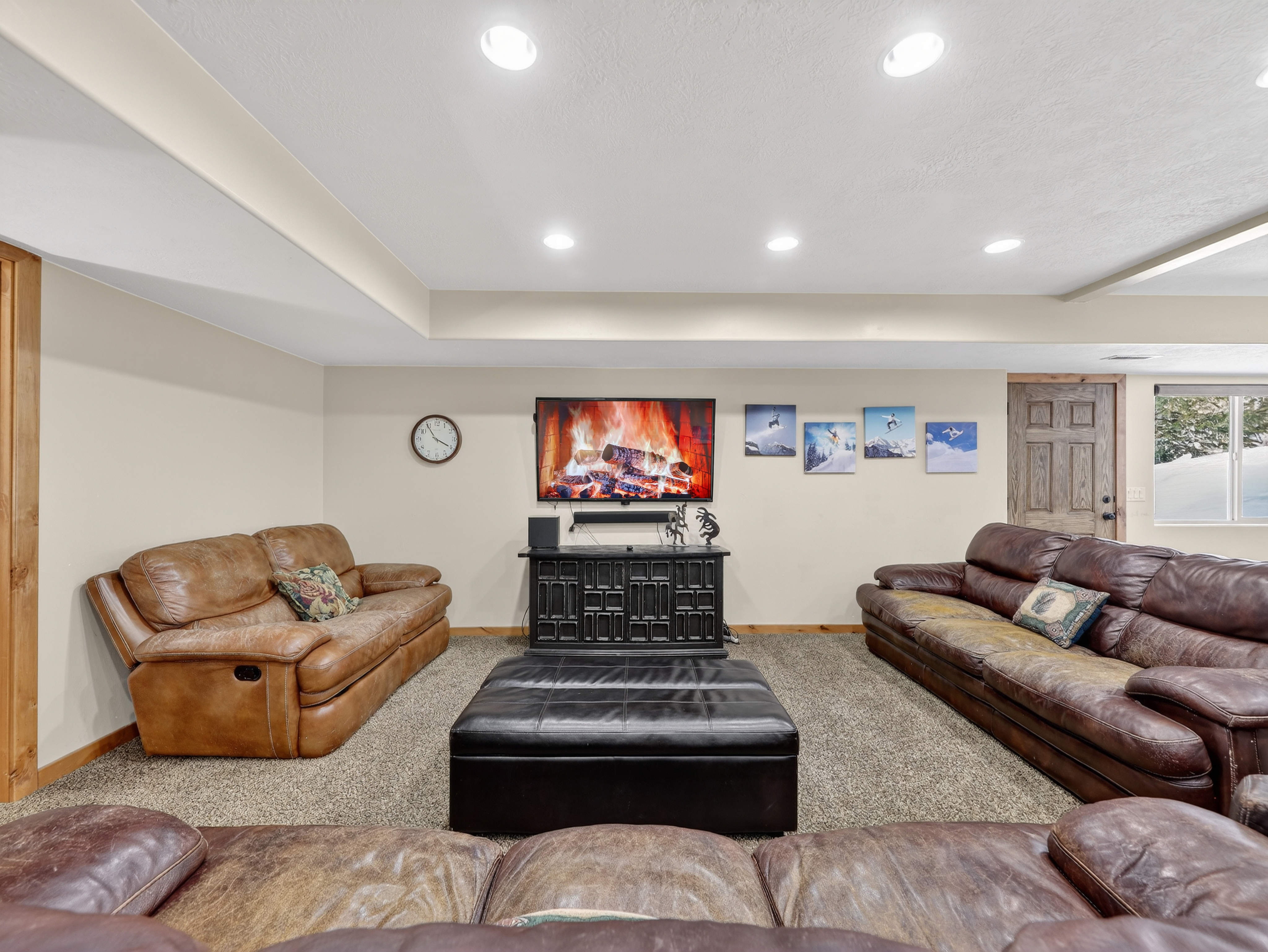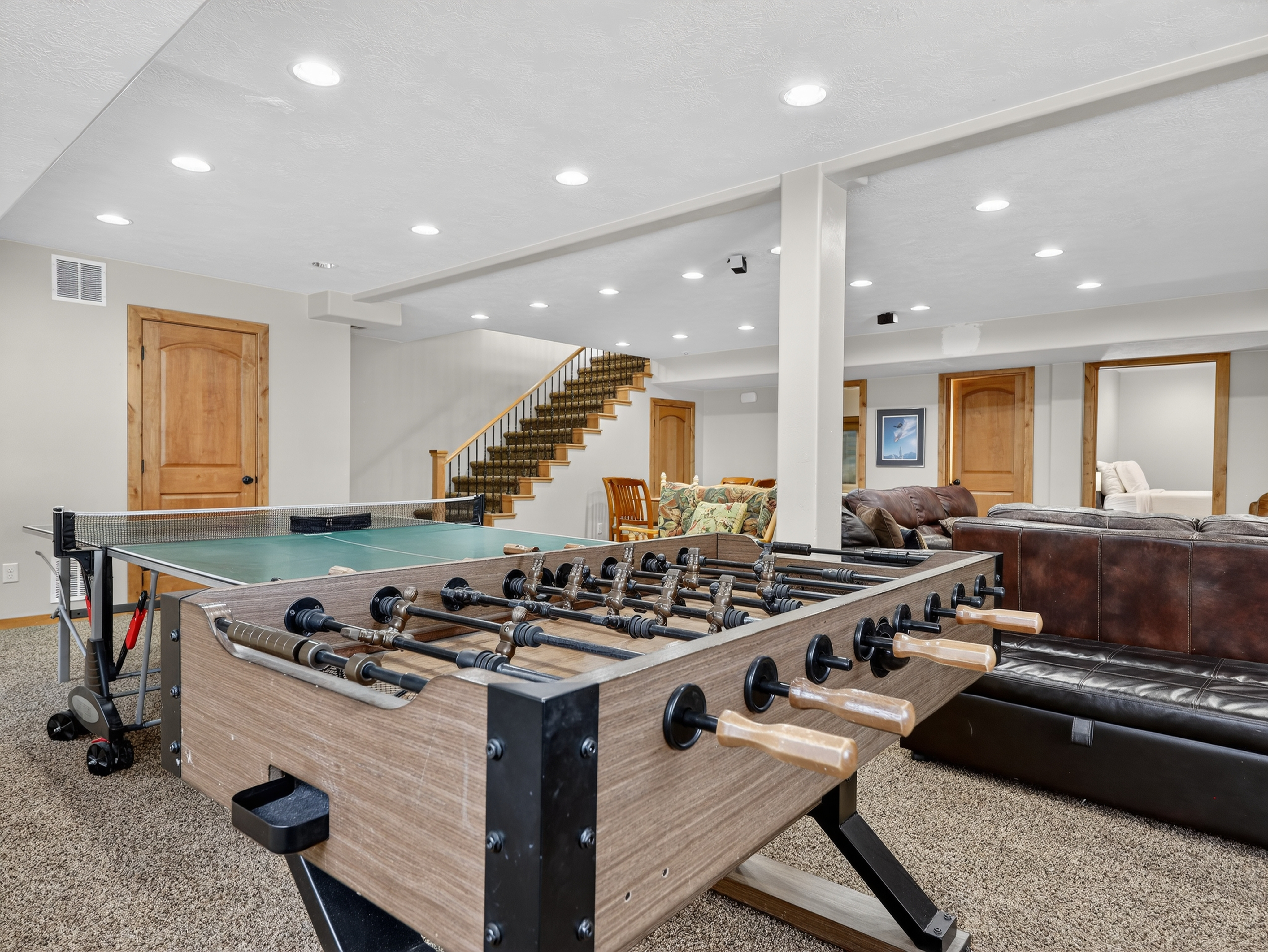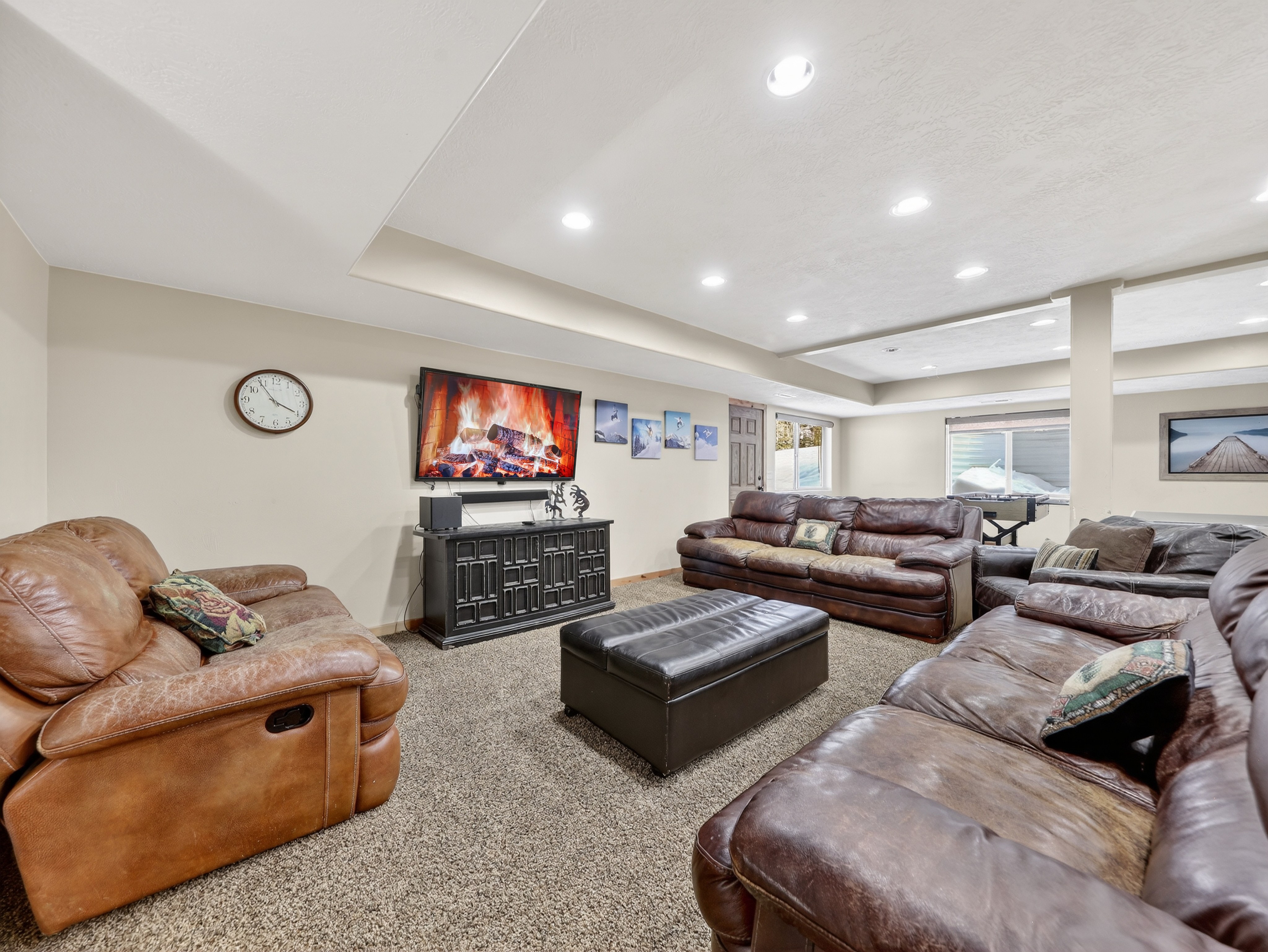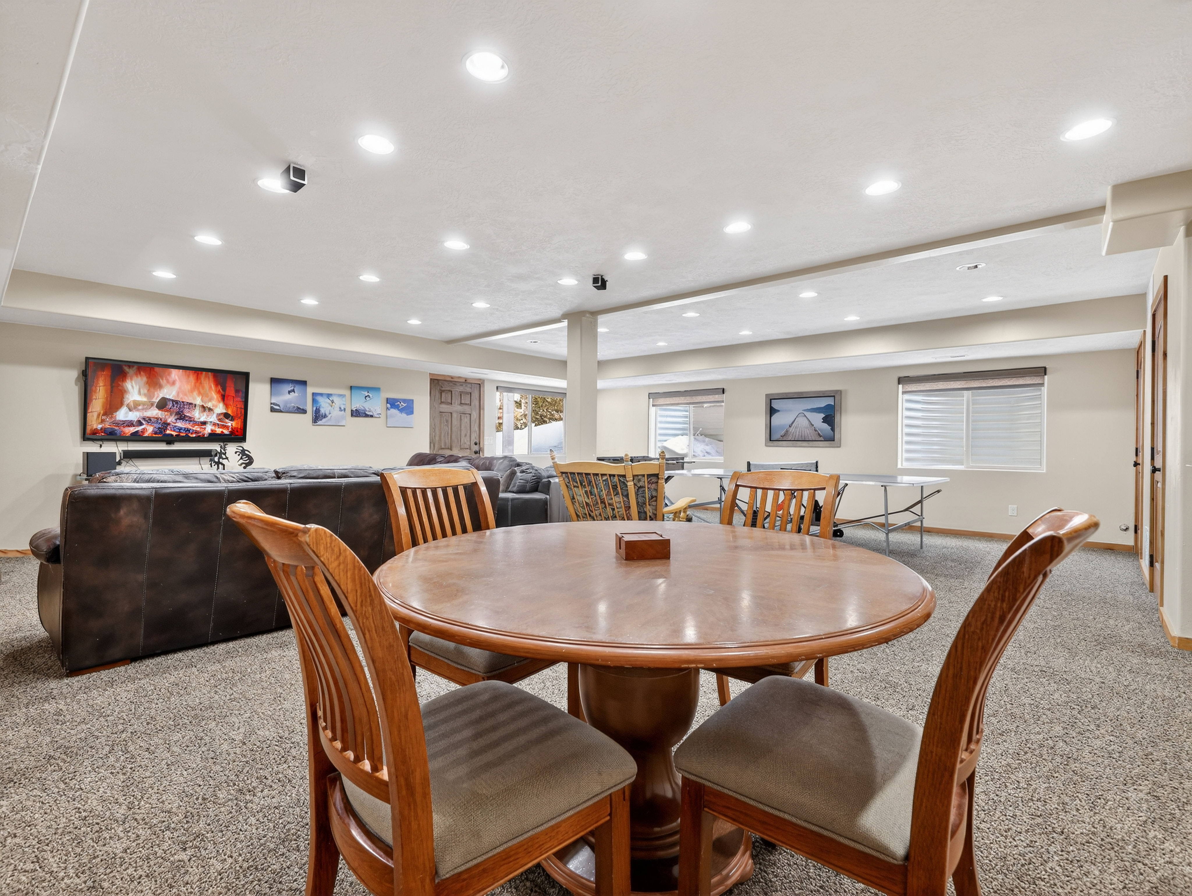 Multiple living areas including a large open living room, downstairs game room, and cozy family spaces
