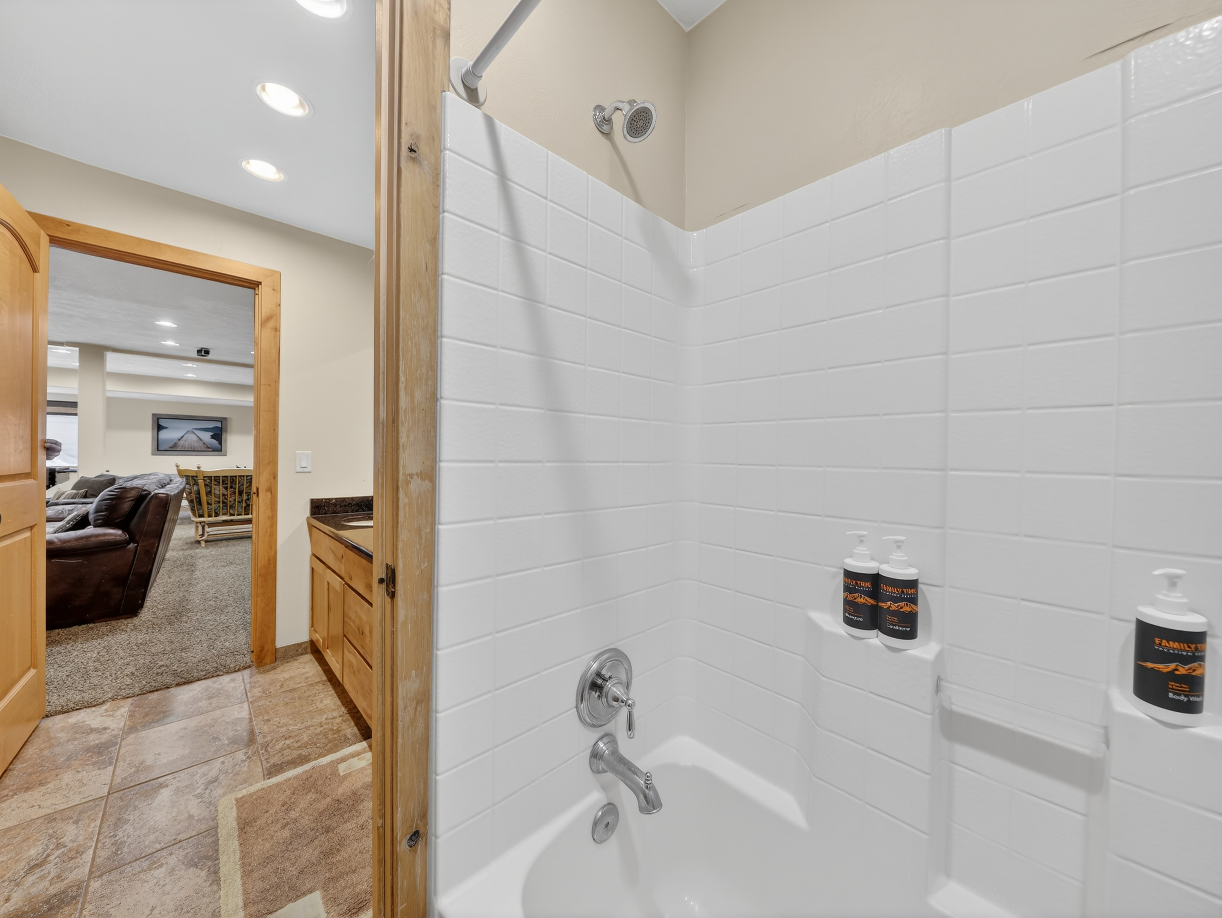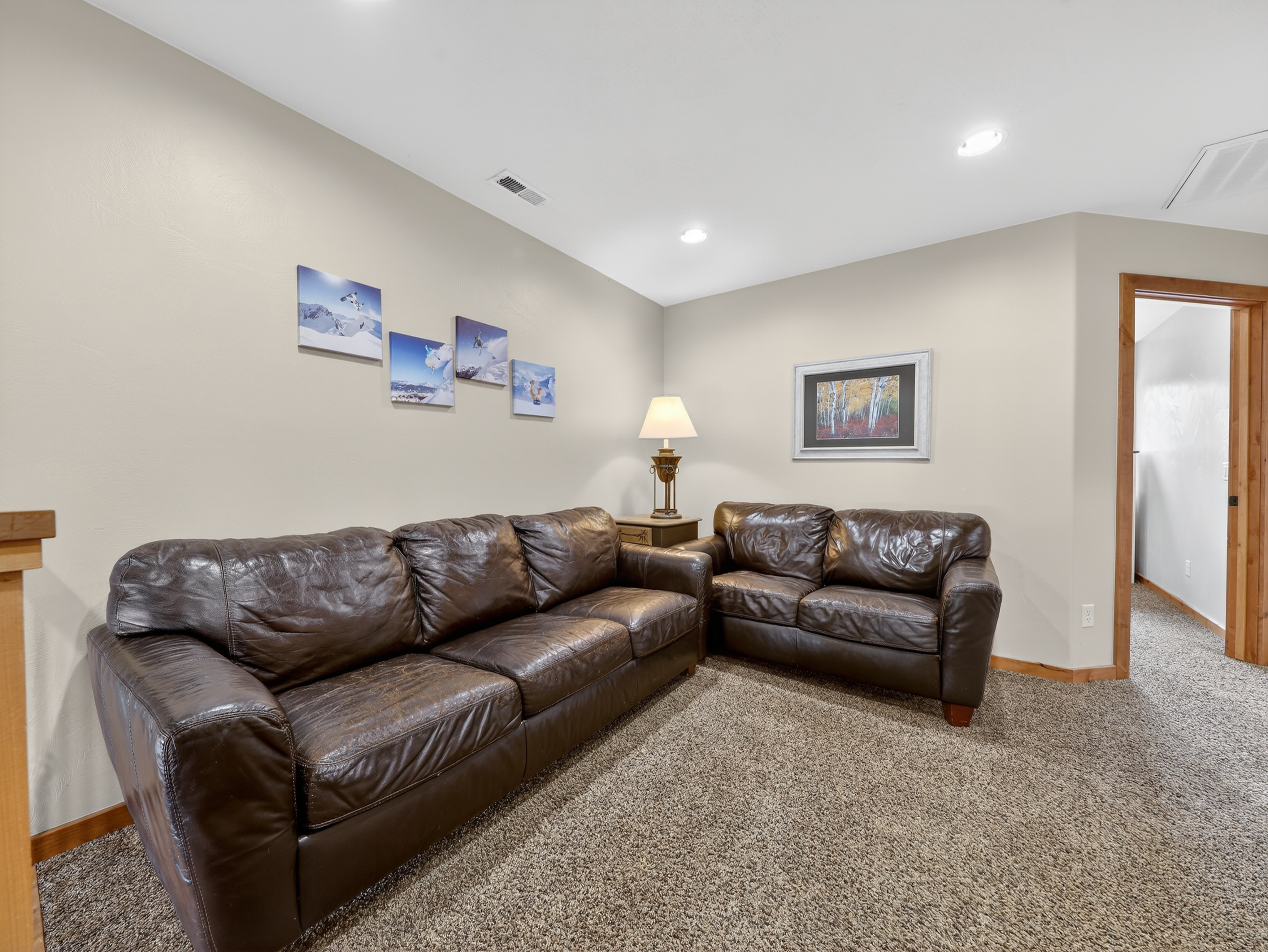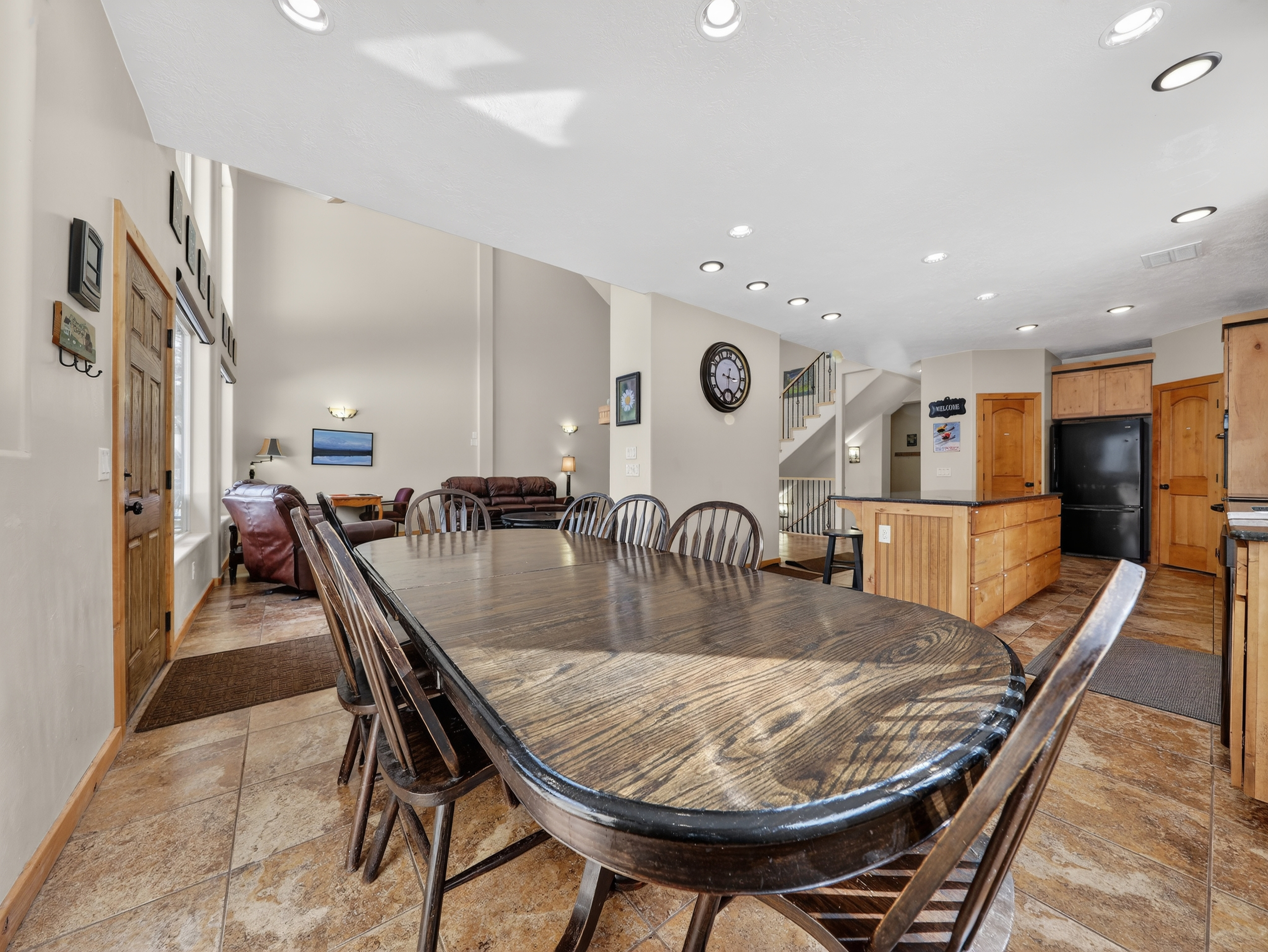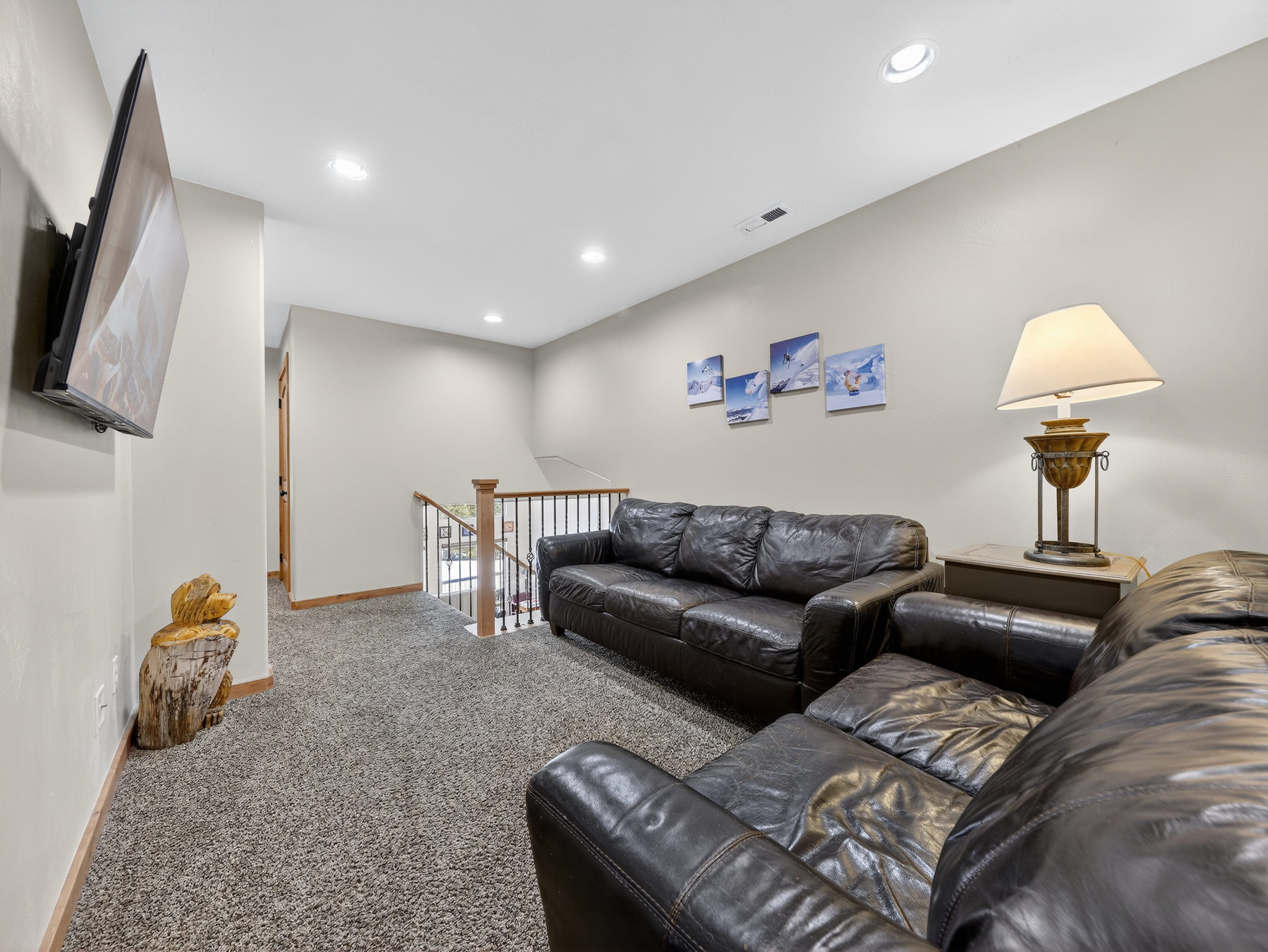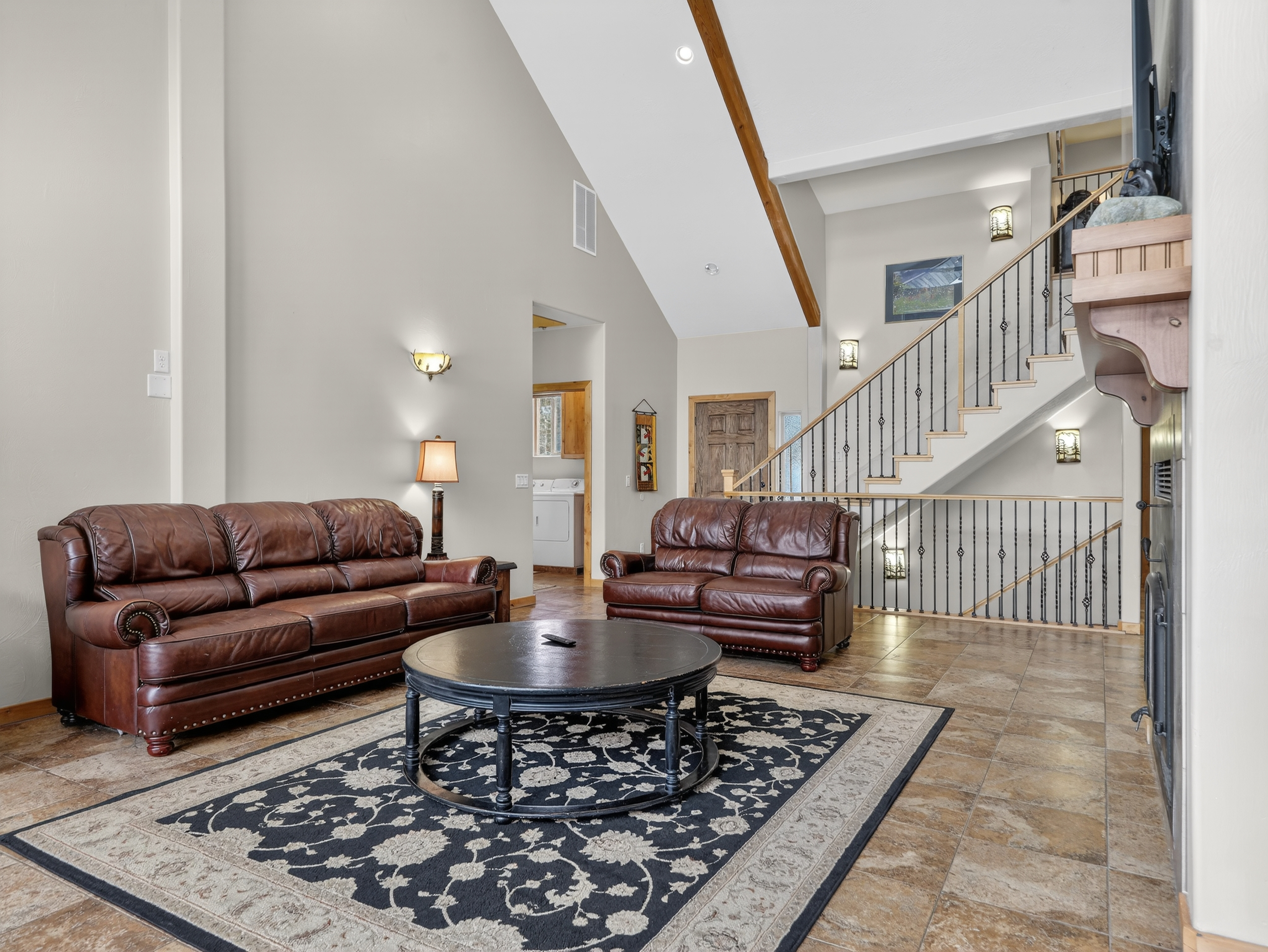 Multiple living areas including a large open living room, downstairs game room, and cozy family spaces