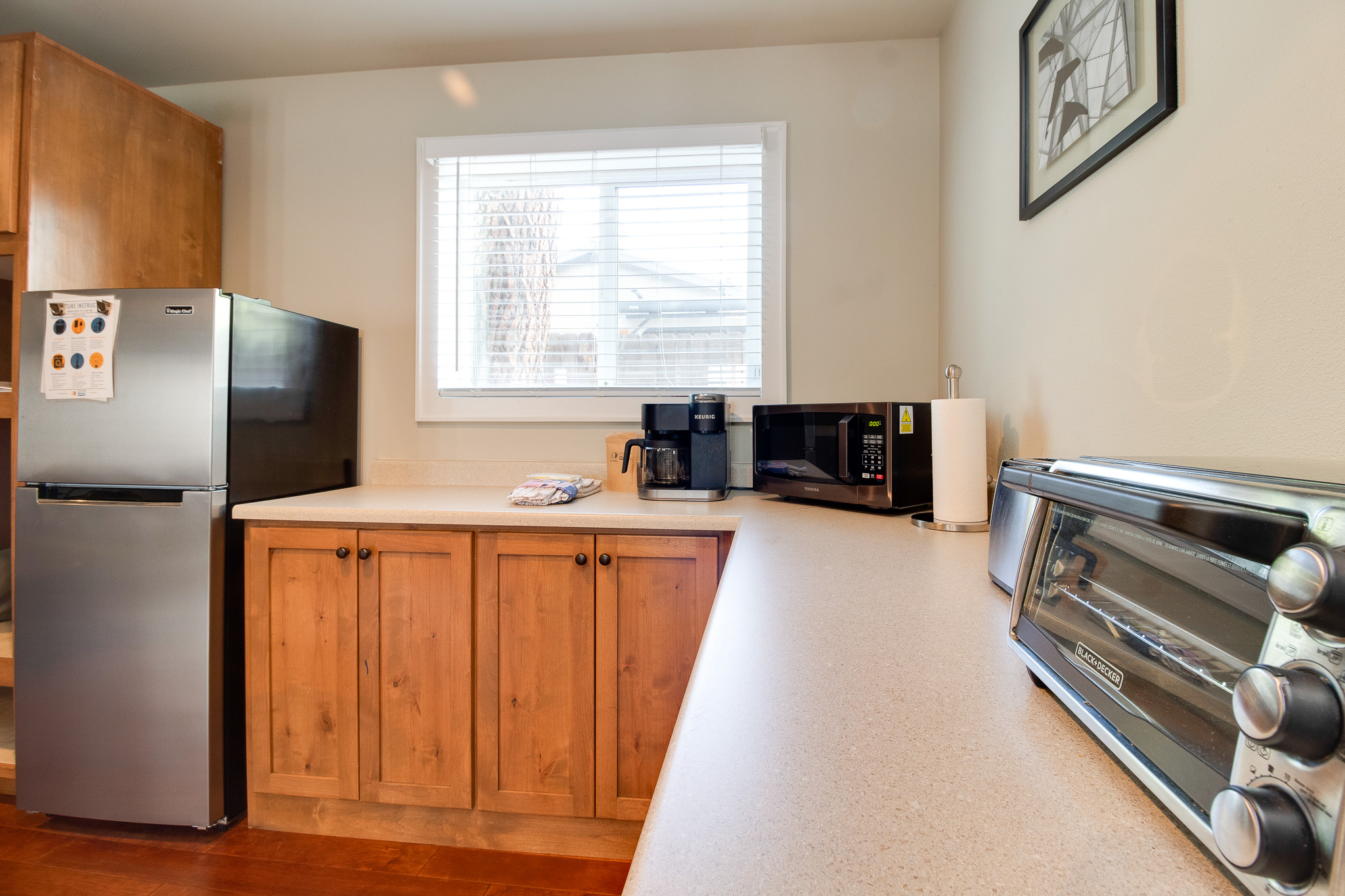 There is no sink or stove, but the unit is equipped with a mini fridge, toaster oven, microwave, and coffee maker—perfect for simple meals or leftovers from one of the many amazing restaurants just steps away.