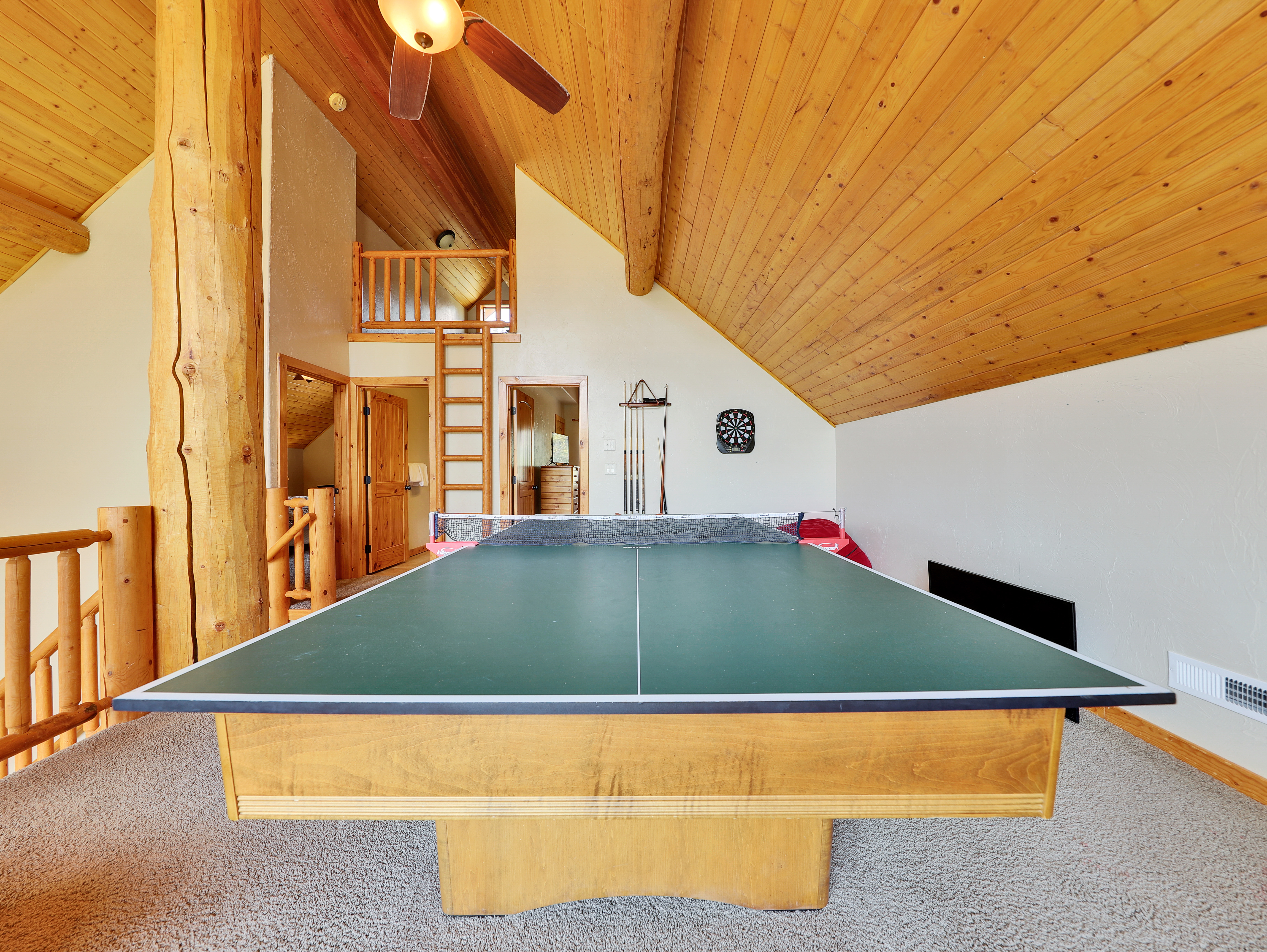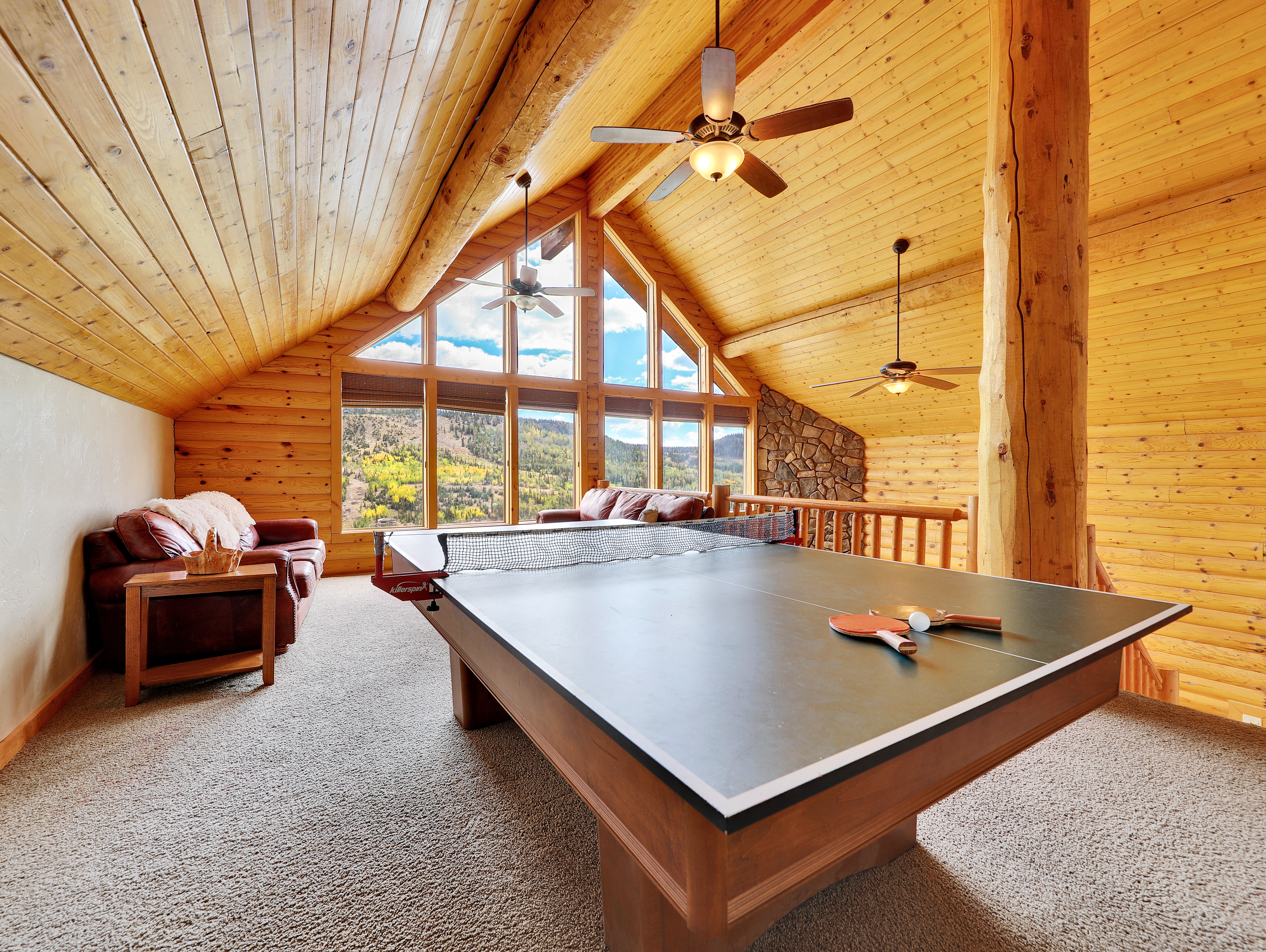 Game Room with pool table, tabletop tennis, sofas, and Roku TVs