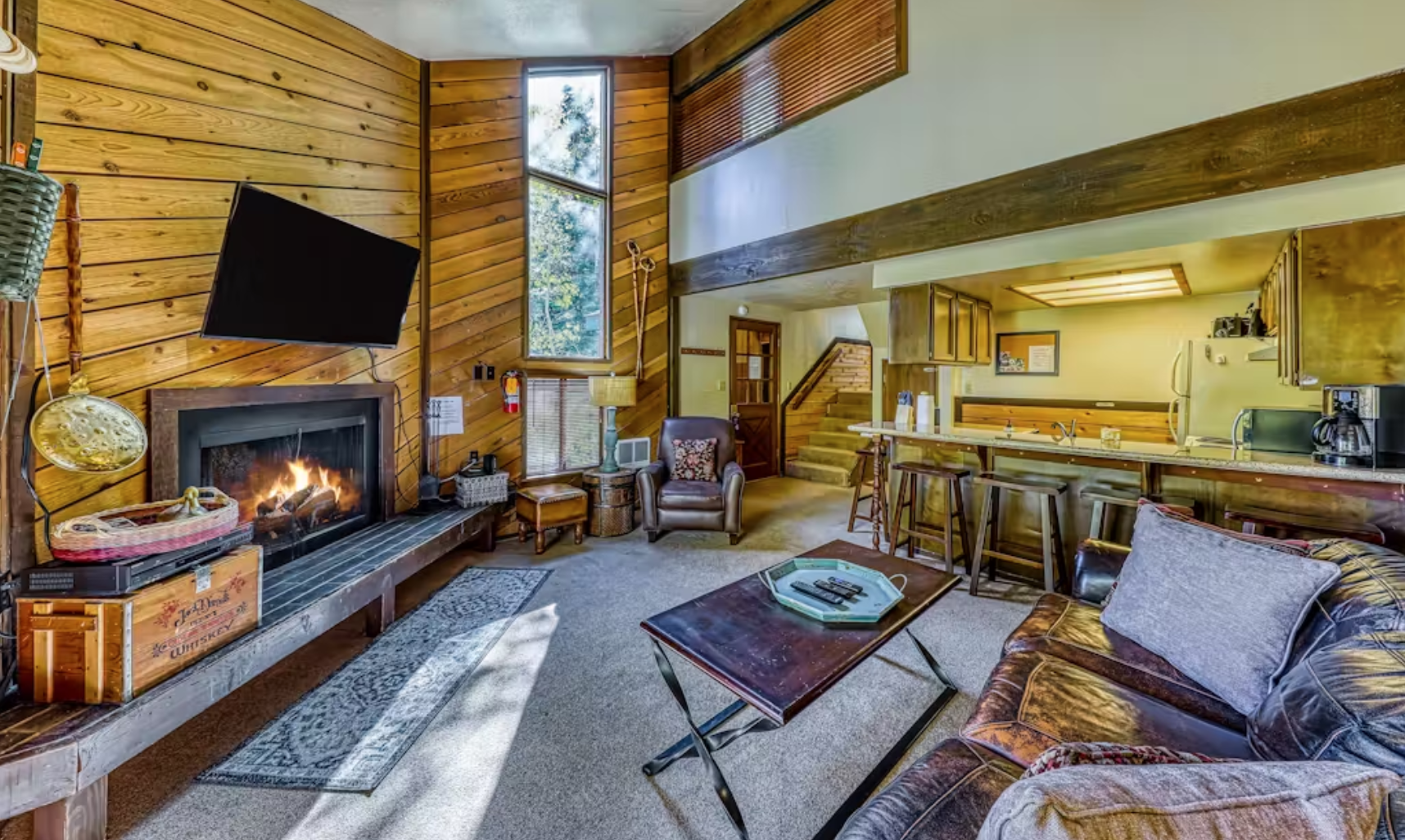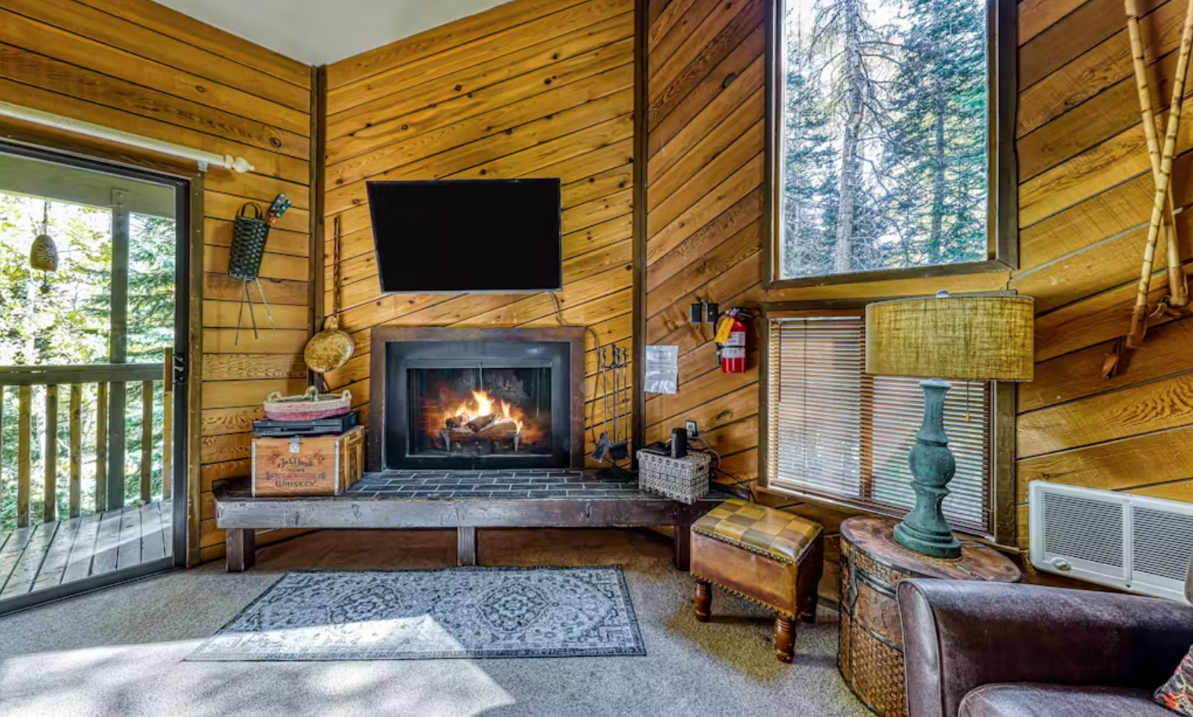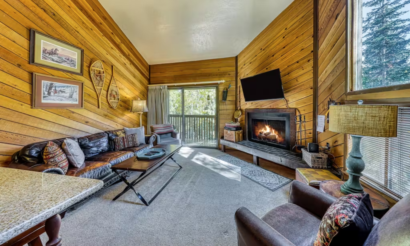 The open, yet woody feel of the living room gives way to comfy sleeping quarters. As you enter into the welcoming kitchen and living room space, you'll find plenty of seating, including a brick bench along the wood-burning fireplace. In warmer months, the sliding glass door beckons to the deck surrounded by aspens and pines. A flatscreen TV with DVD sits above the fireplace, a perfect setup for movie night in. WiFi and Roku are also