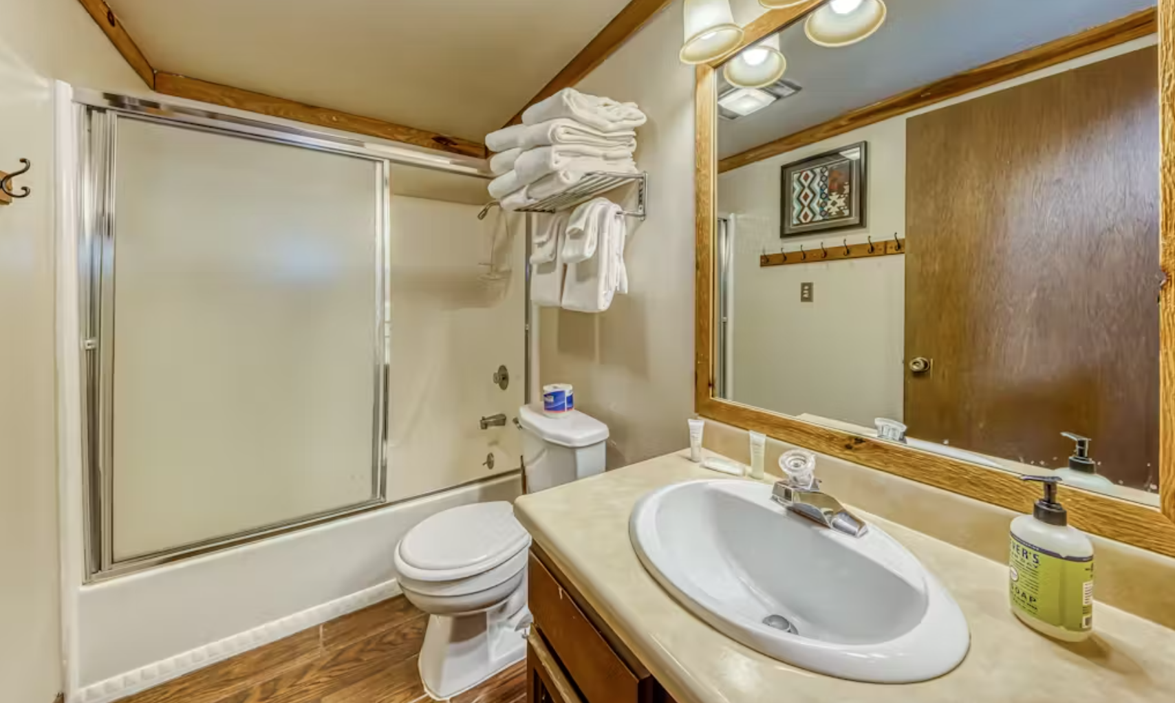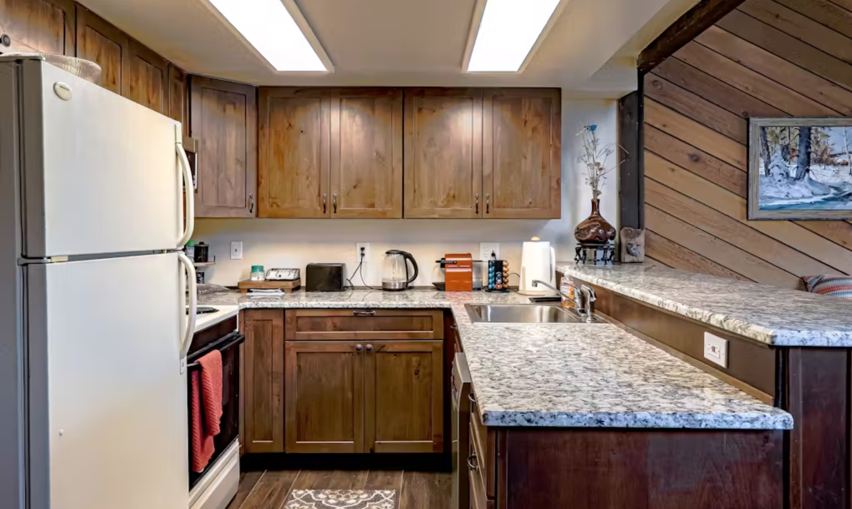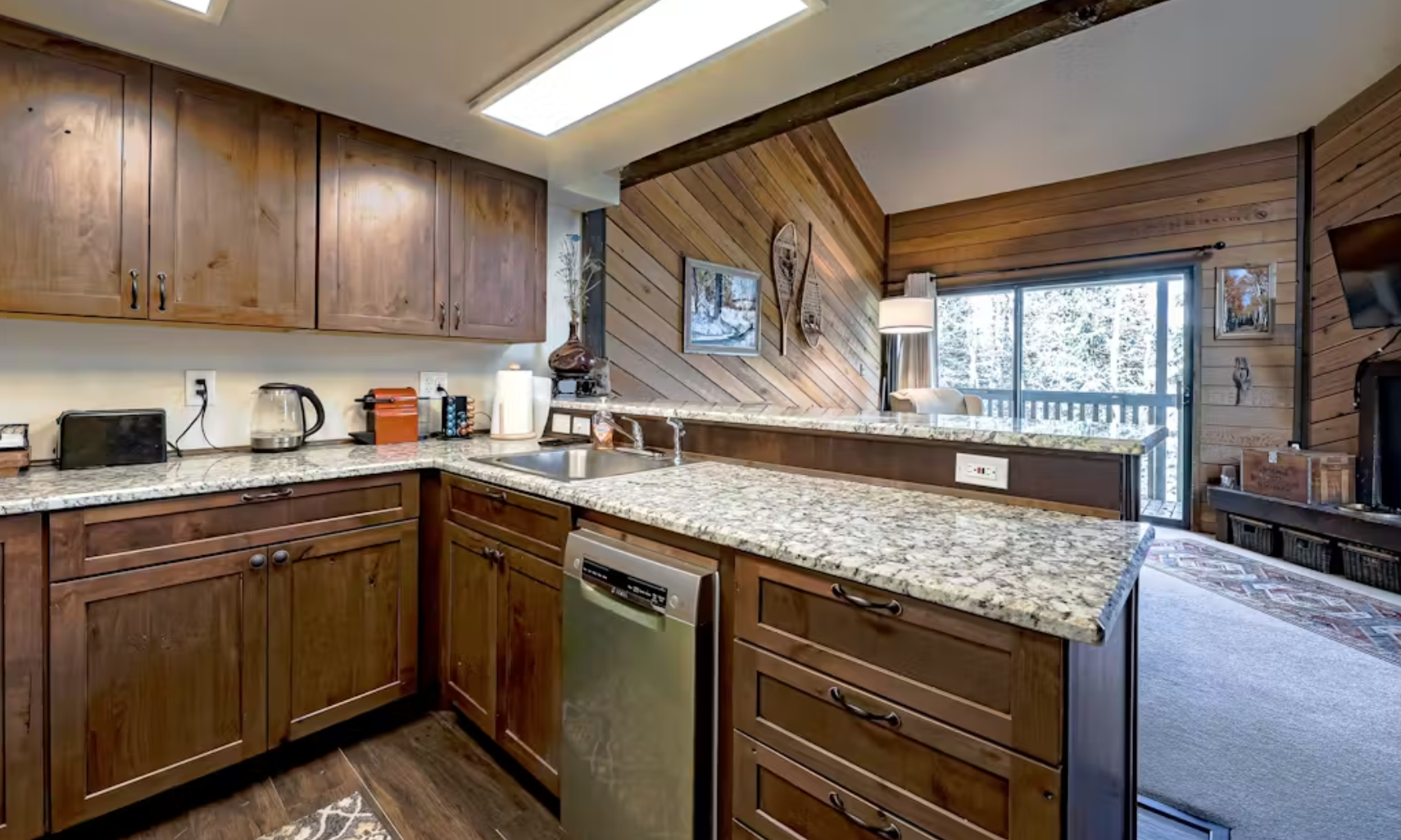 The open, yet woody feel of the living room gives way to comfy sleeping quarters. As you enter into the welcoming kitchen and living room space, you'll find plenty of seating, including a brick bench along the wood-burning fireplace. In warmer months, the sliding glass door beckons to the deck surrounded by aspens and pines. A flatscreen TV with DVD sits above the fireplace, a perfect setup for movie night in. WiFi and Roku are also