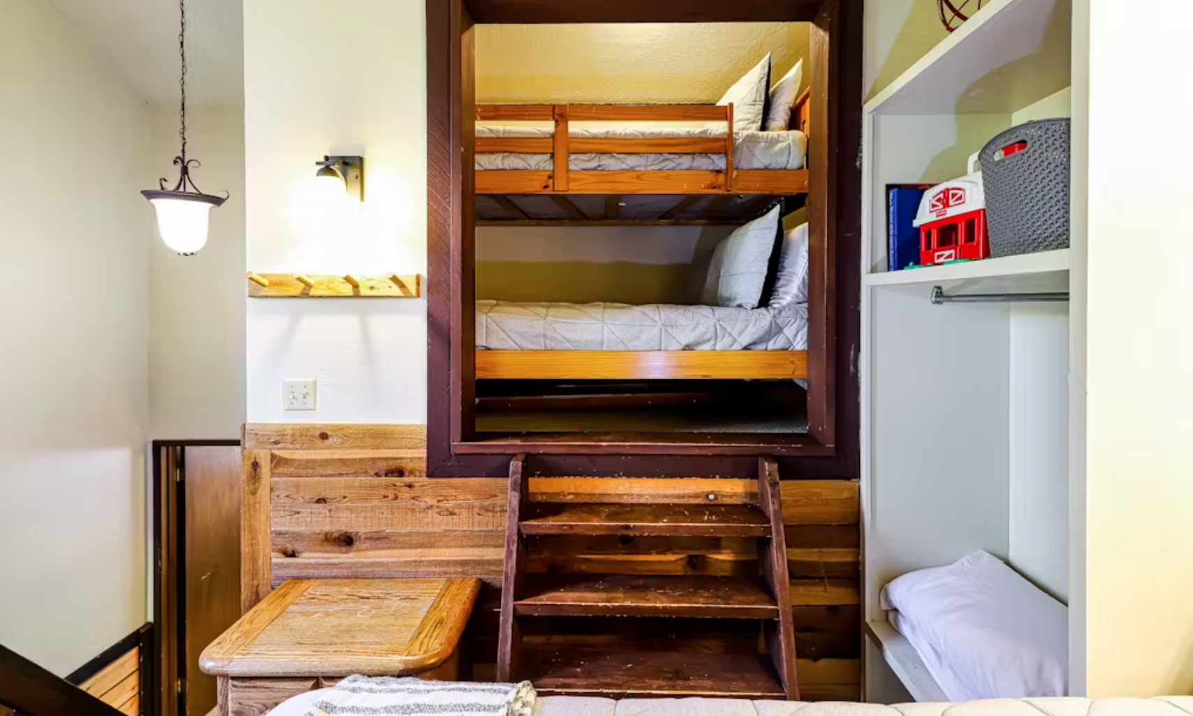 appliances and tools, and barstool seating. The main bedroom has a king-size bed, TV with DVD, and a private stacked washer/dryer set behind closet doors. Up in the loft, you'll find a delightful space with a queen bed and a comfy nook with a twin-over-full bunk set. The loft has a TV with a DVD player and VCR.