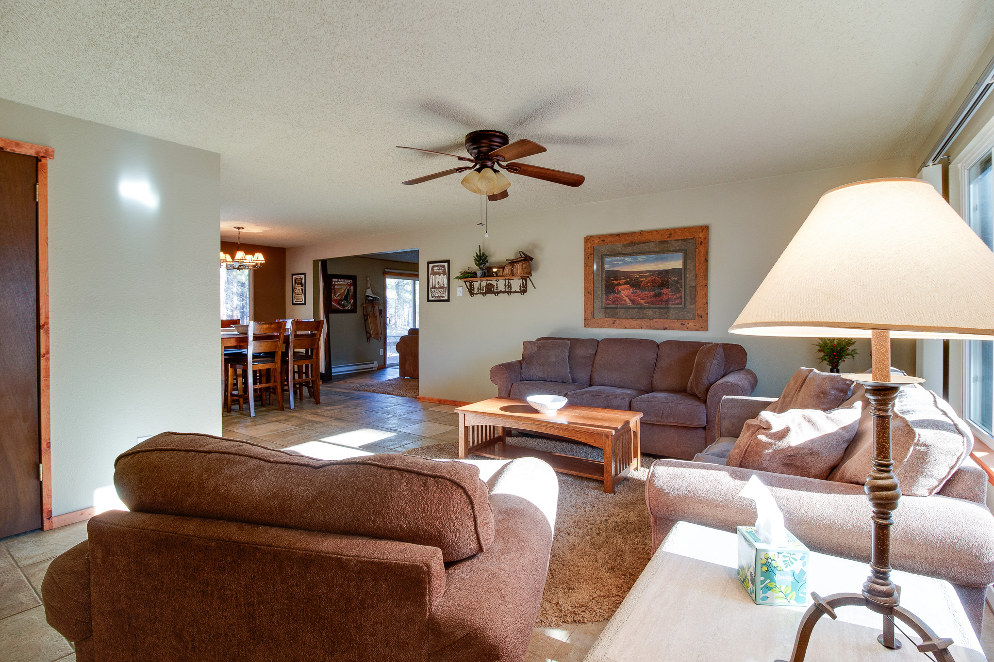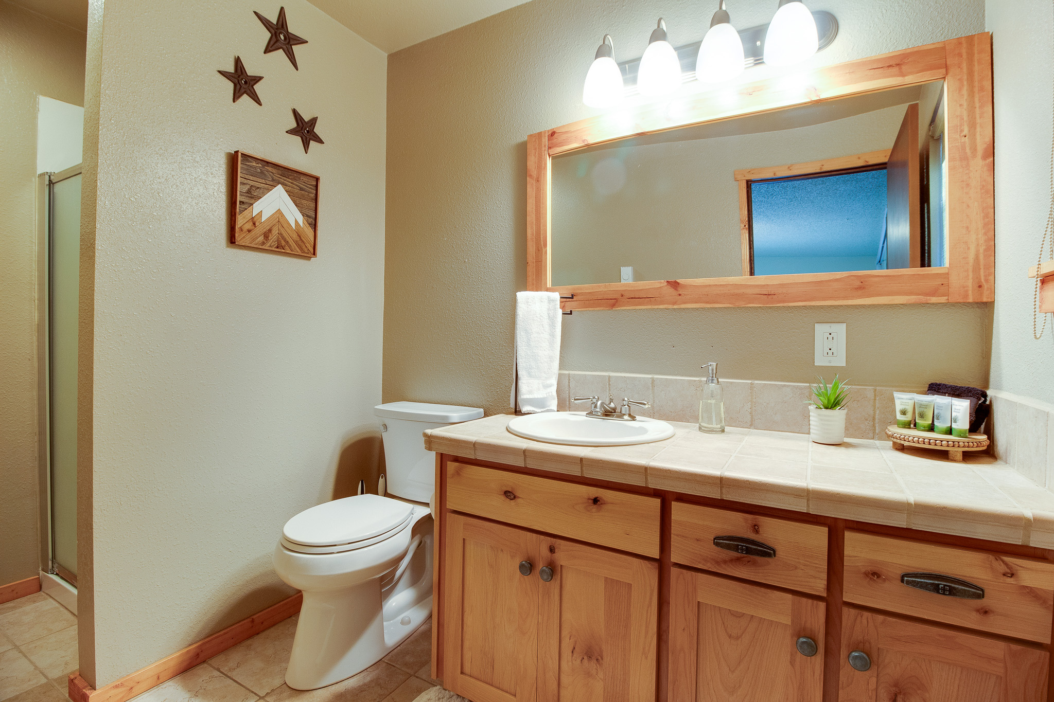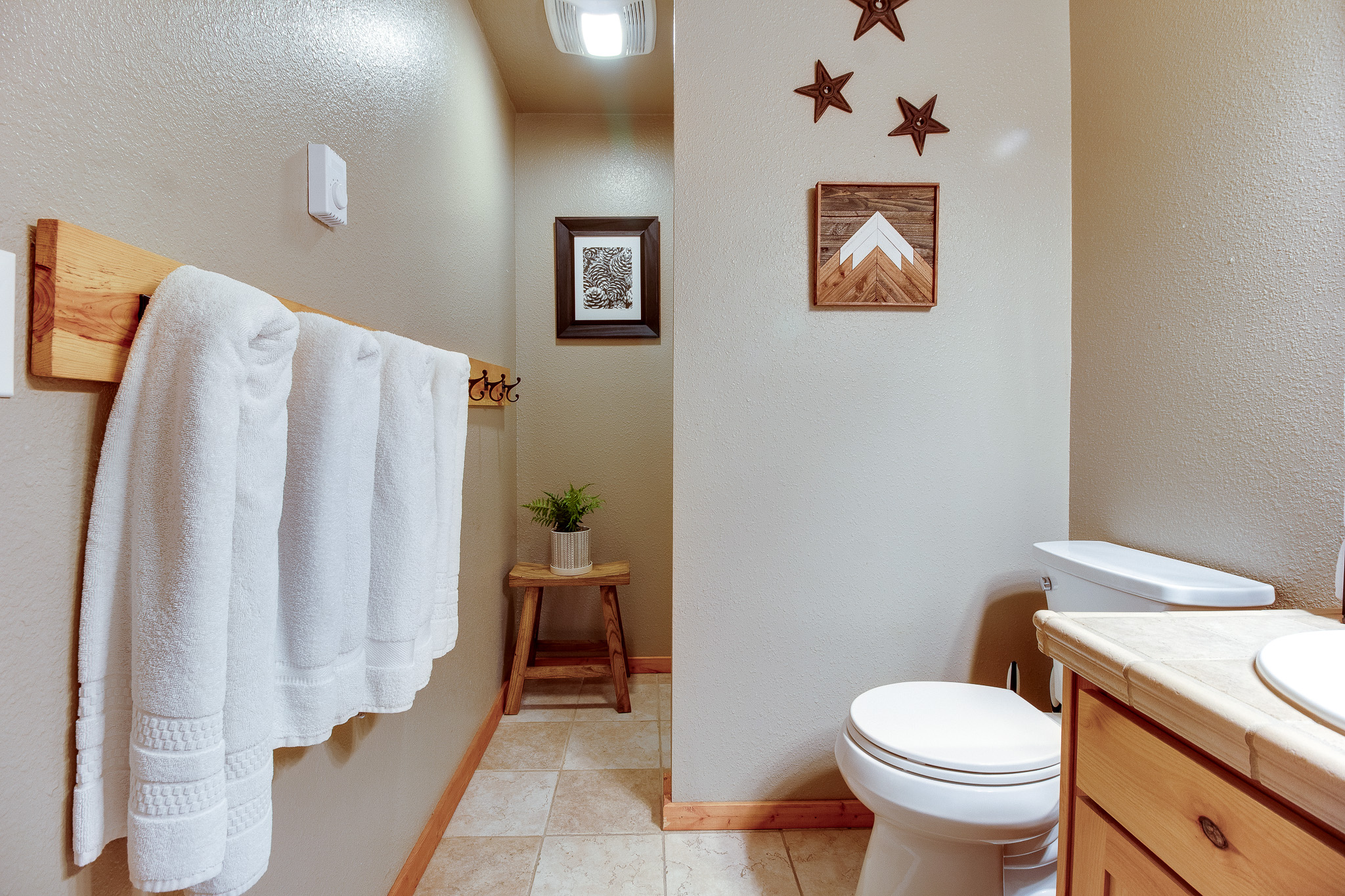 Step outside into the backyard, where you'll find a horseshoe pit for some friendly competition. Please note that the pellet stove is not available for guest use, and for those warm summer days, a wall-mounted air conditioning unit in the living room provides respite from the heat (not central A/C).