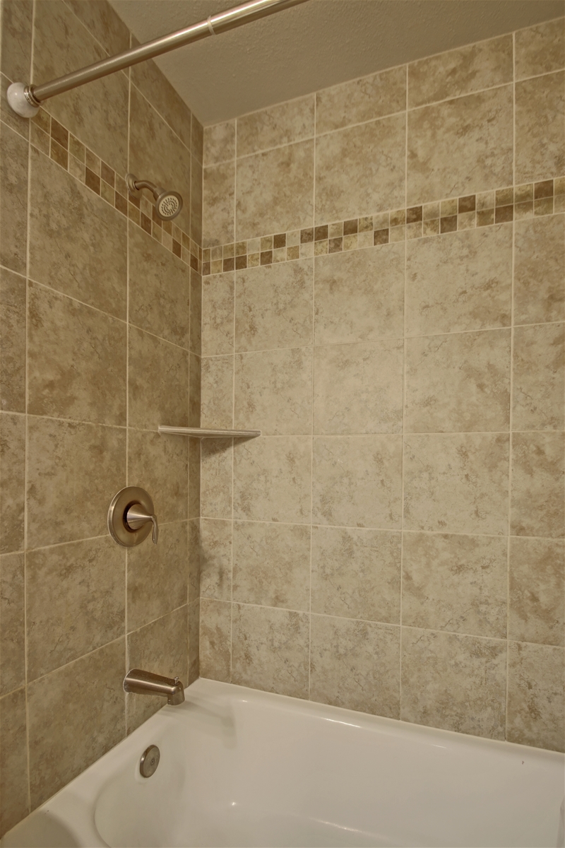 Bathroom: Updated full bathroom with a beautifully tiled shower/bath and convenient shelves.