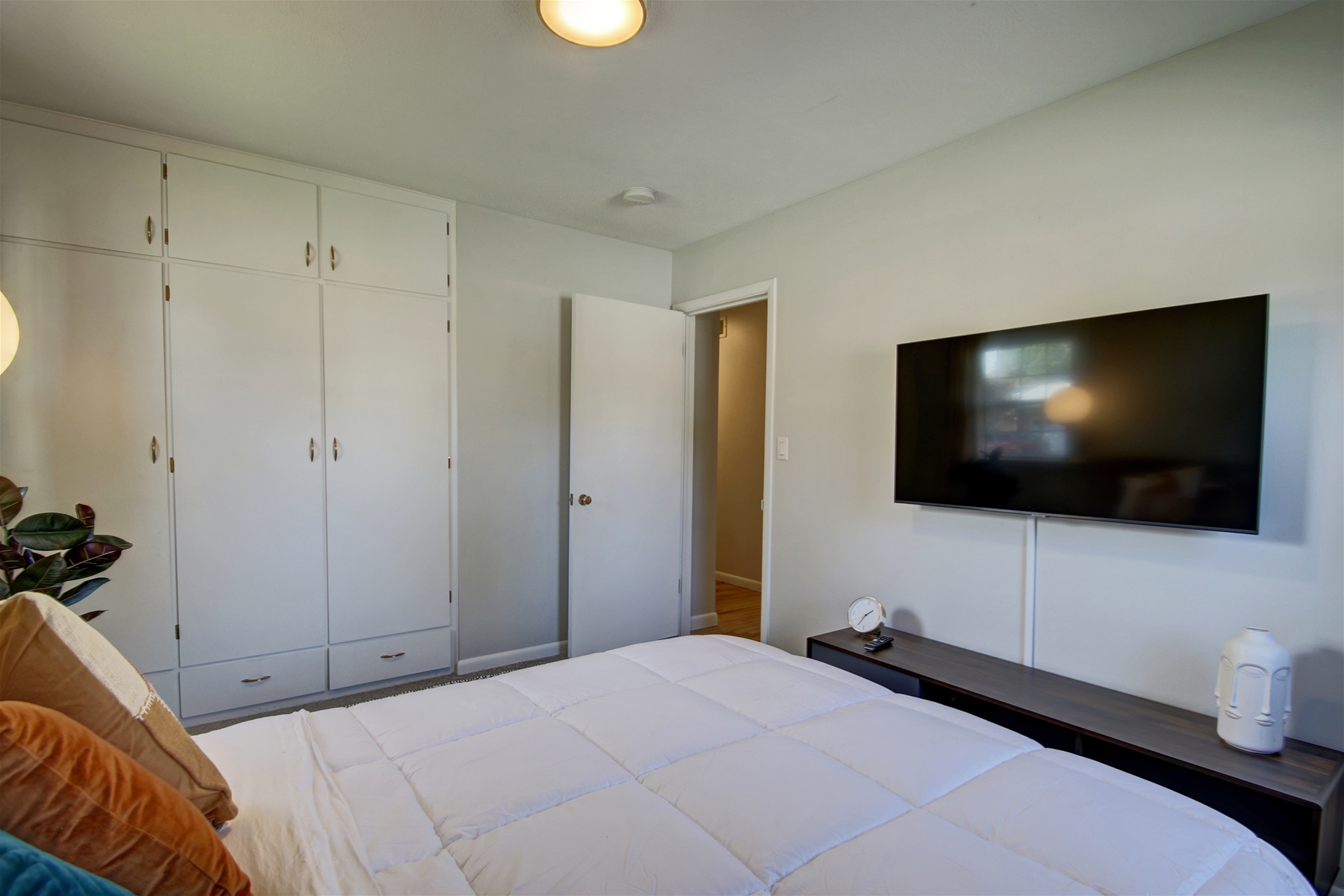 Bedrooms: Three comfortable bedrooms featuring two queen beds and one full-size bed. Each bedroom includes built-in armoires, with the master and second bedrooms also offering wall-mounted flat-screen smart TVs.