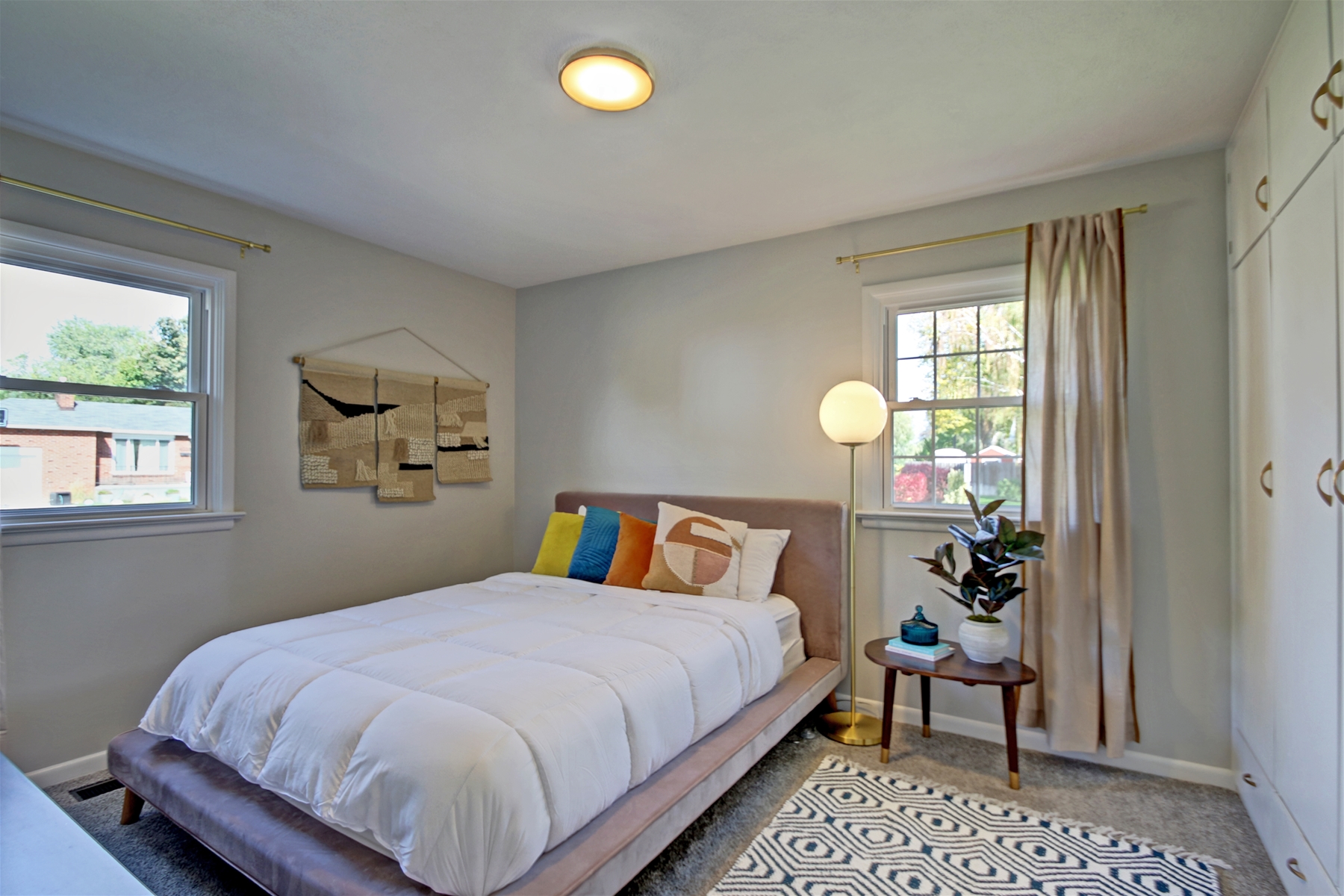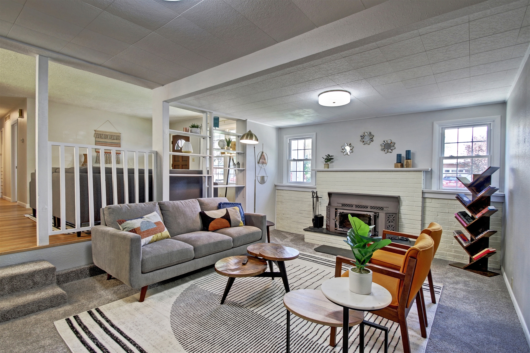Flooring: A mix of carpeted family room and bedrooms, with hardwood floors or tiles in the majority of the home.