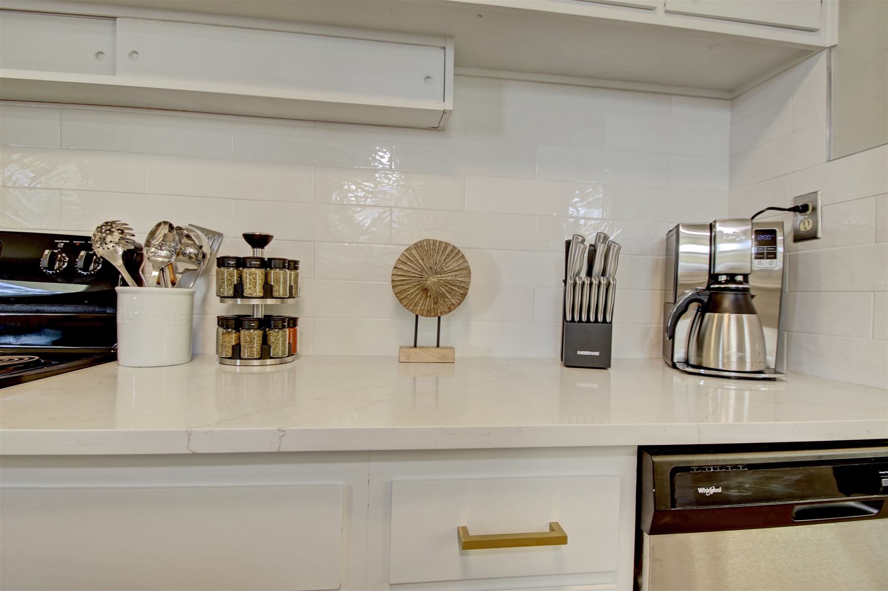 Kitchen: Fully equipped kitchen with ample cupboards, cabinets, dishwasher, and electric range.